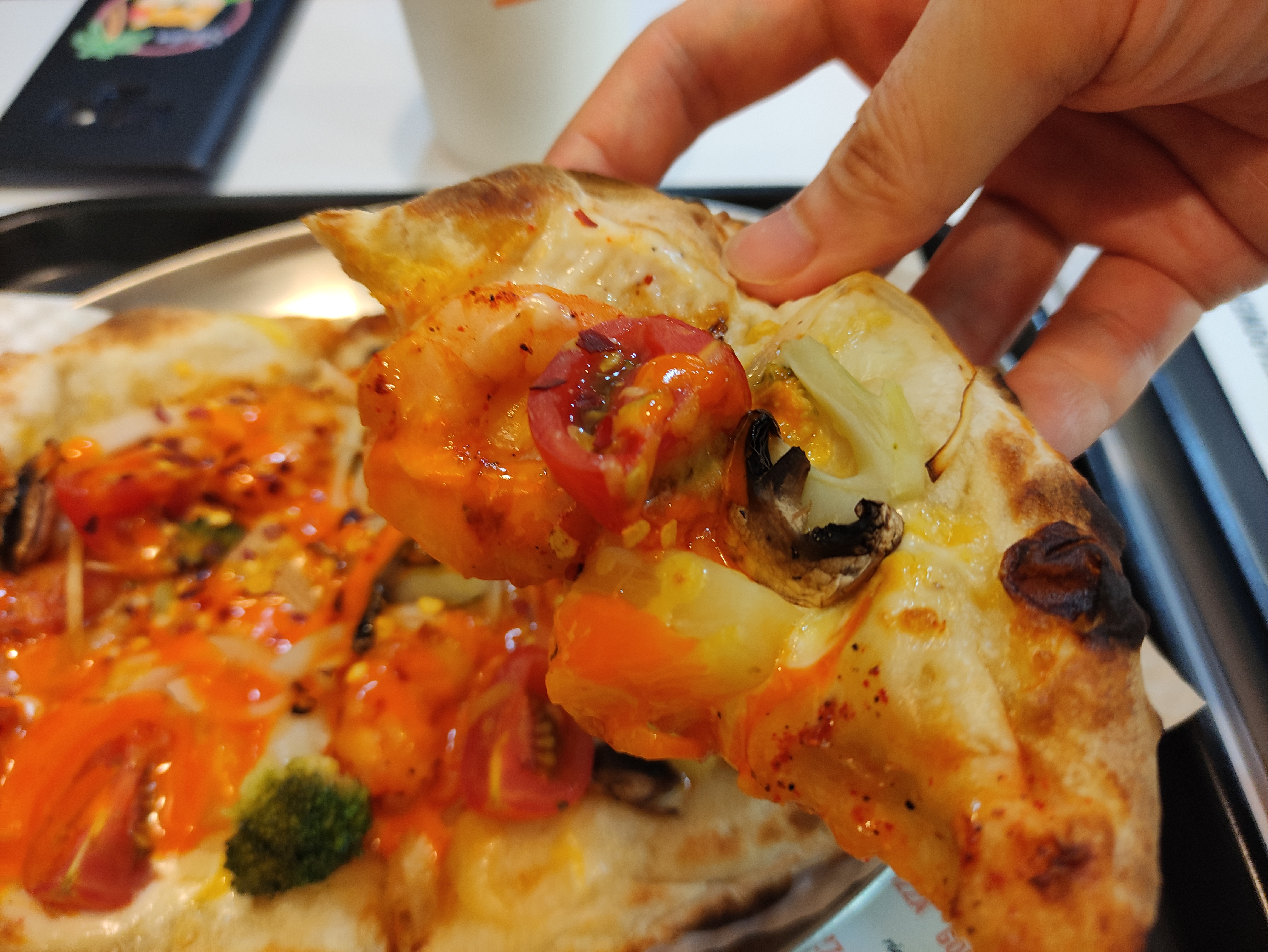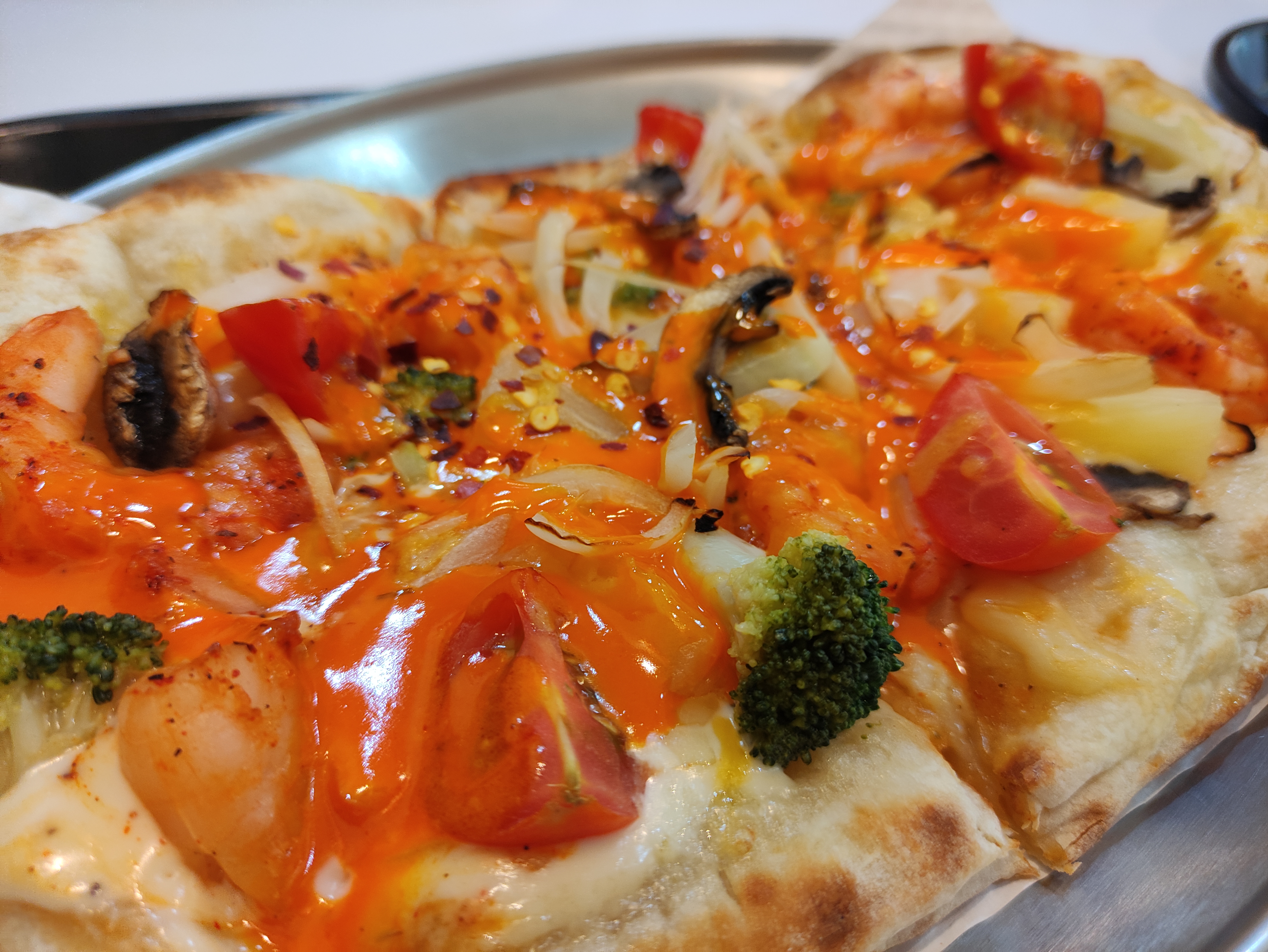 스리라차쉬림프피자입니다. 1인피자이기에 도우가 4조각으로 나뉩니다. 양이적음 두명이 먹어도 괜찮습니다. 브로콜리, 쉬림프 등 재료와 스리라차소스의 조합이 좋습니다. 맛은 살짝 매콤한 피자맛입니다. 이 피자는 핫소스를 뿌리지 않아도 됩니다. ㅎㅎ 도우또한 일반피자와 달리 쫄깃한맛이 일품이네요. 비슷한 종류라면 인도의 난? 느낌입니다.