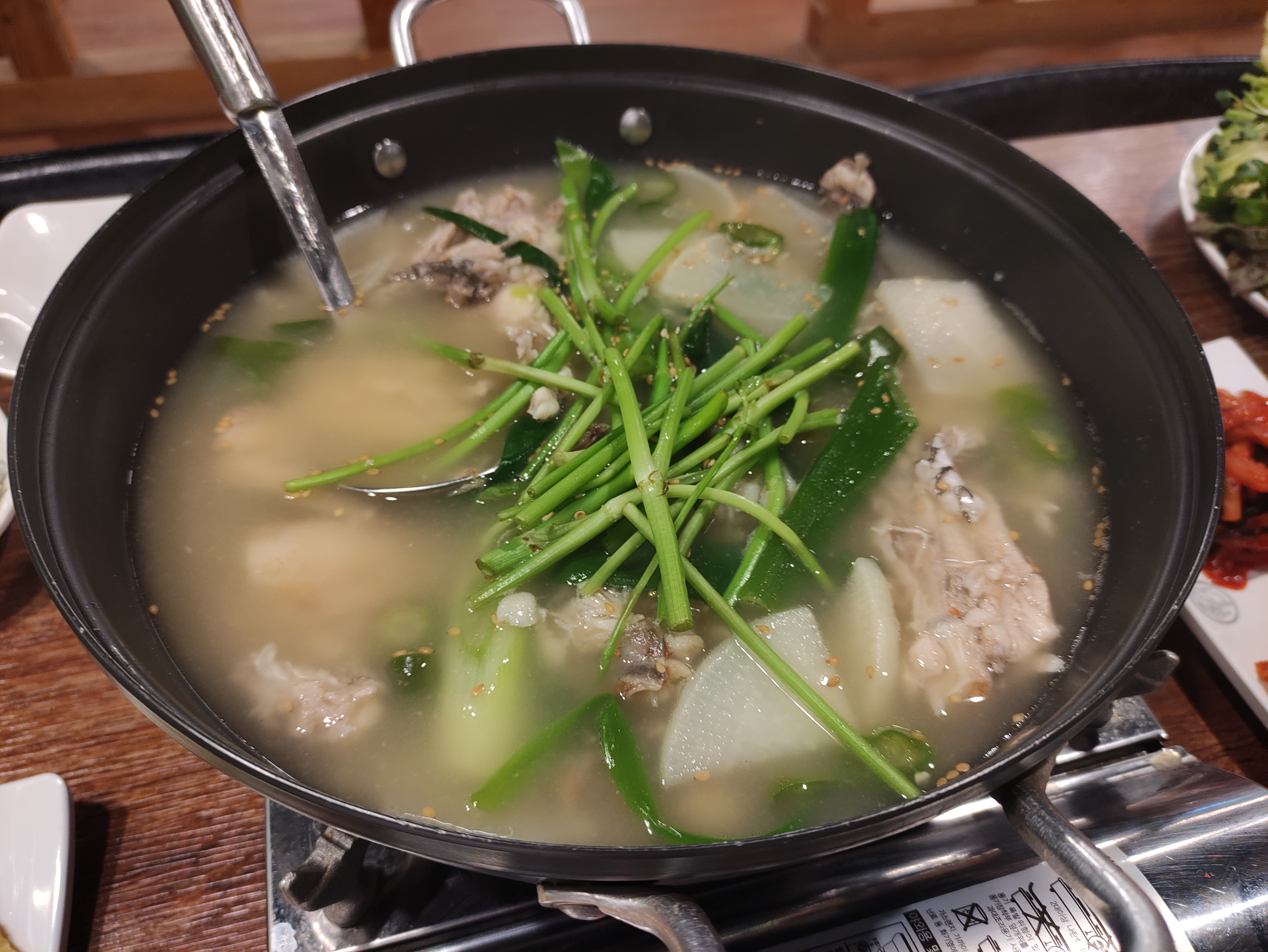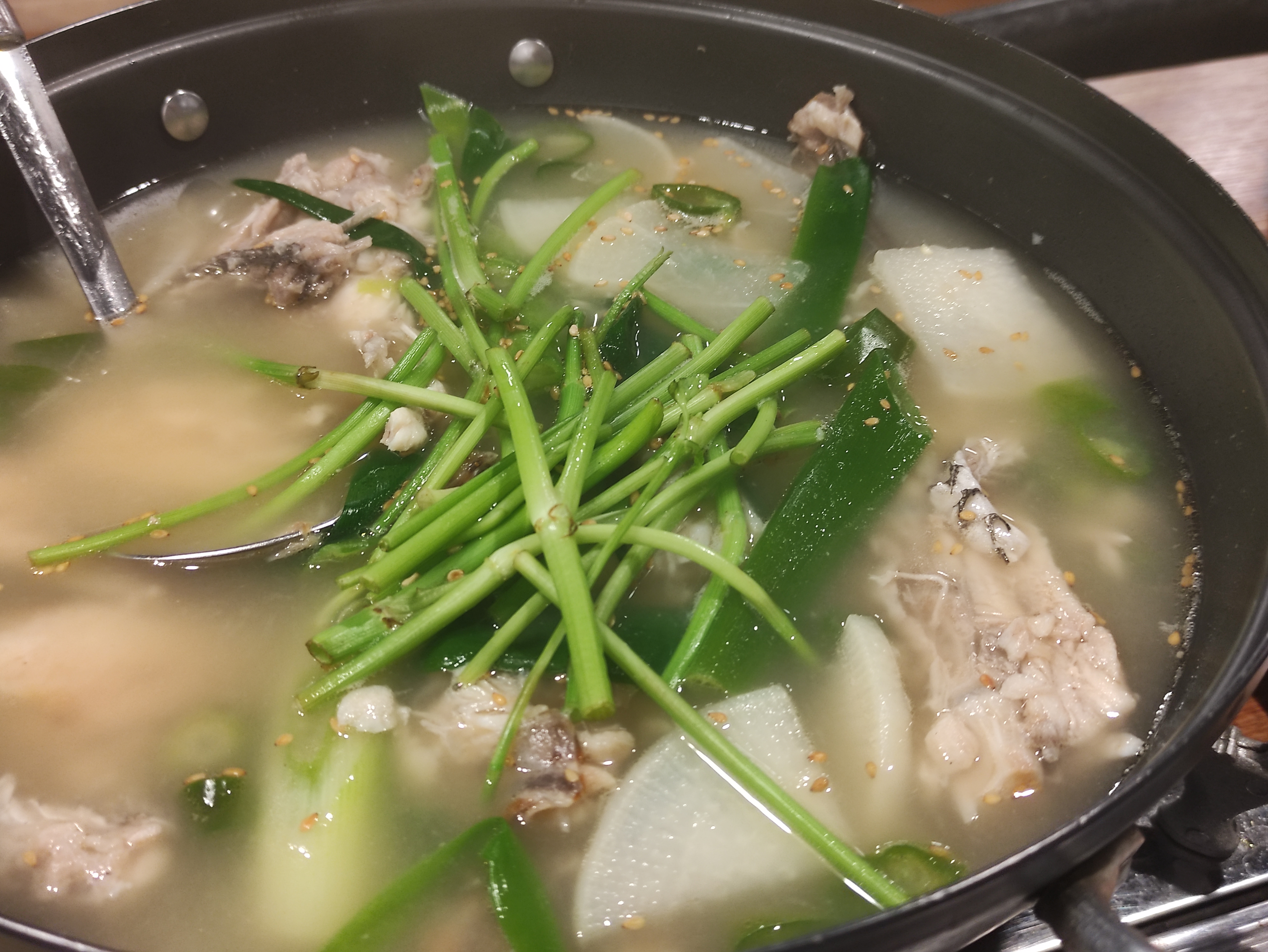 회를 먹고나면 마무리로 지리가 나옵니다. 맑은국물찌개죠. 감칠맛이 살아있고 미나리와 고추를 송송썰어넣어 국물이 맑고 칼날한끝맛이 아주 좋습니다. 마포 먹깨비길 민어회맛집 남도술상에서 민어회 넘넘 맛있게 잘먹었습니다.
