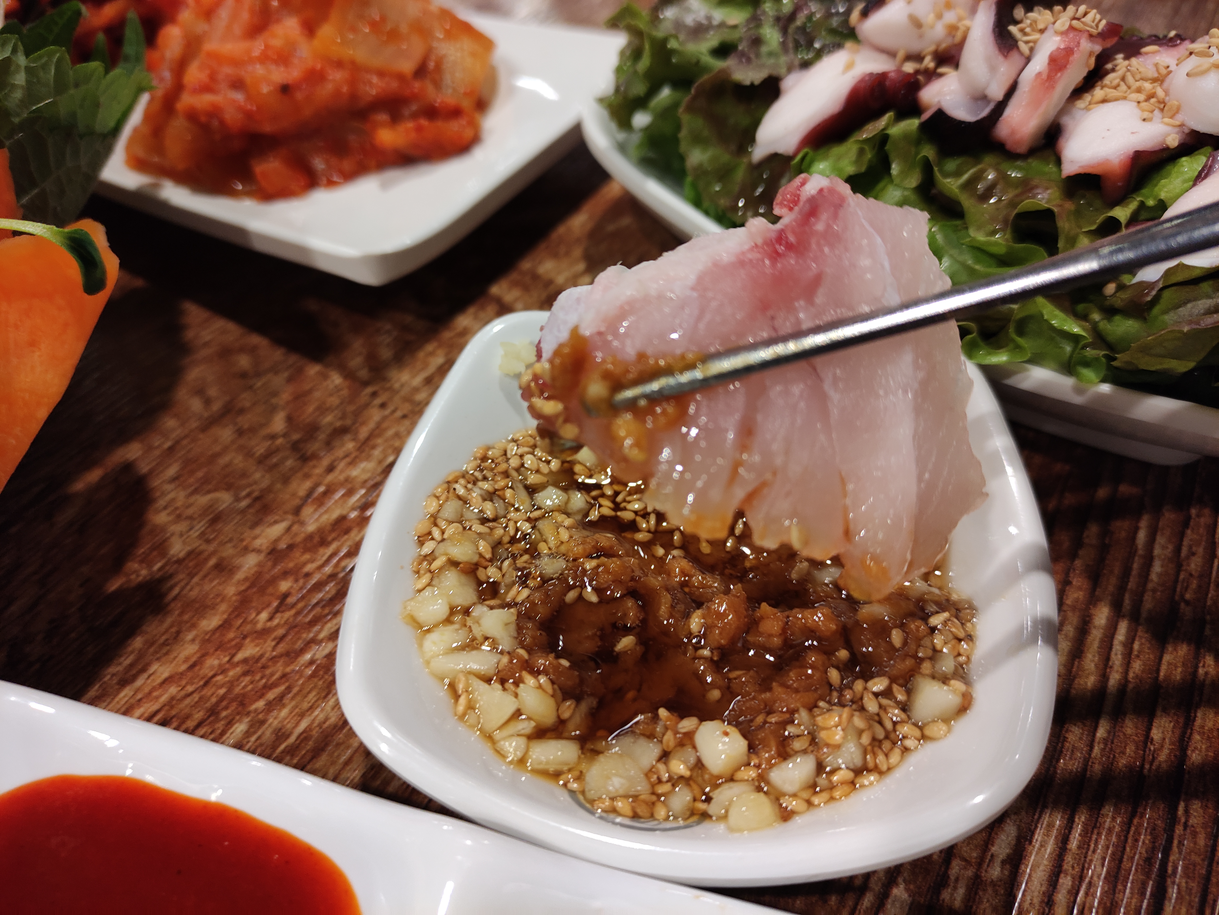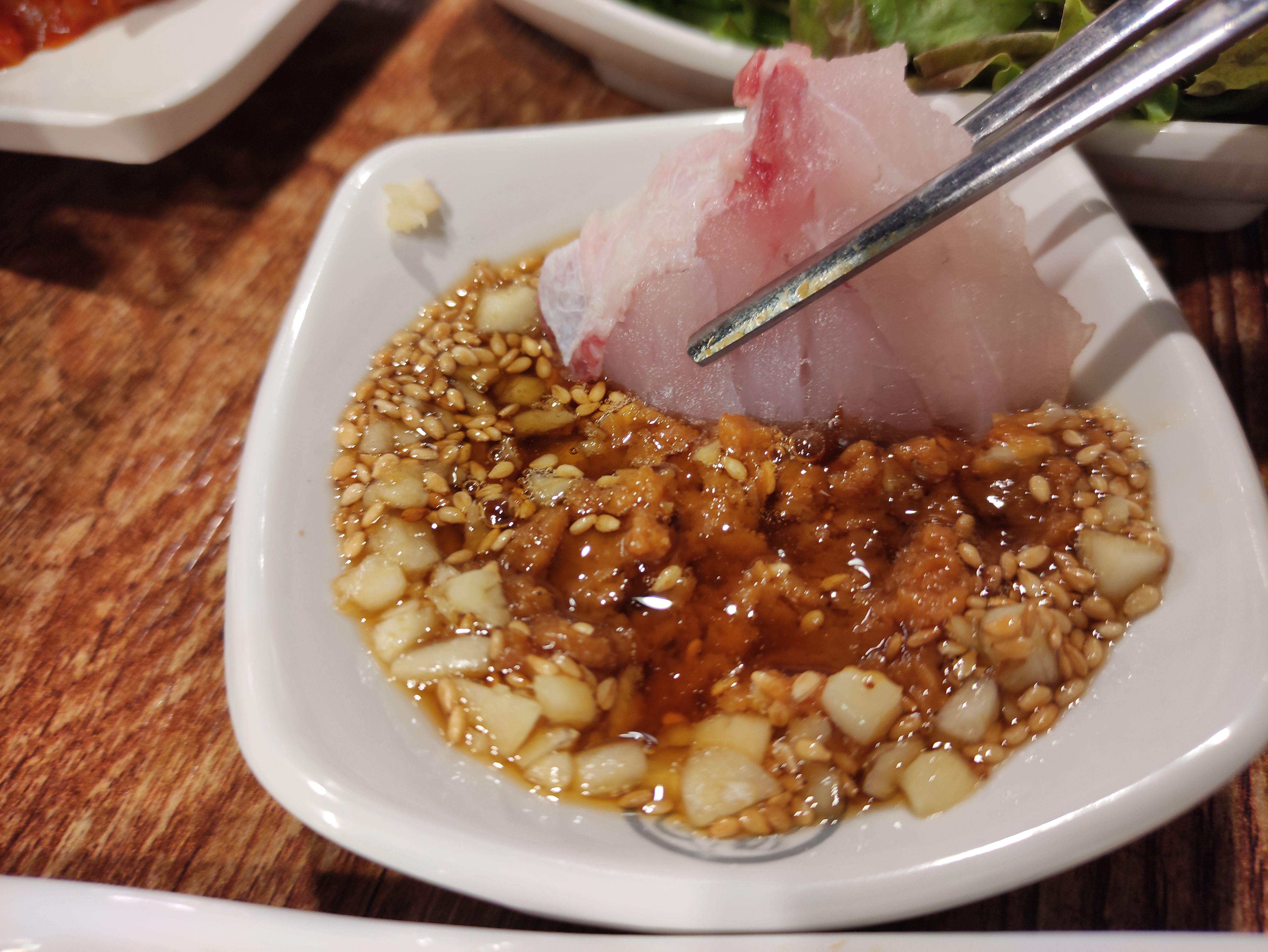 남도술상만의 특제소스에 찍어먹습니다 맛이정말끝내줘요. 흰살생선처럼보이는데 기름진맛이 일품이고 씹는식감도 넘 좋아요.