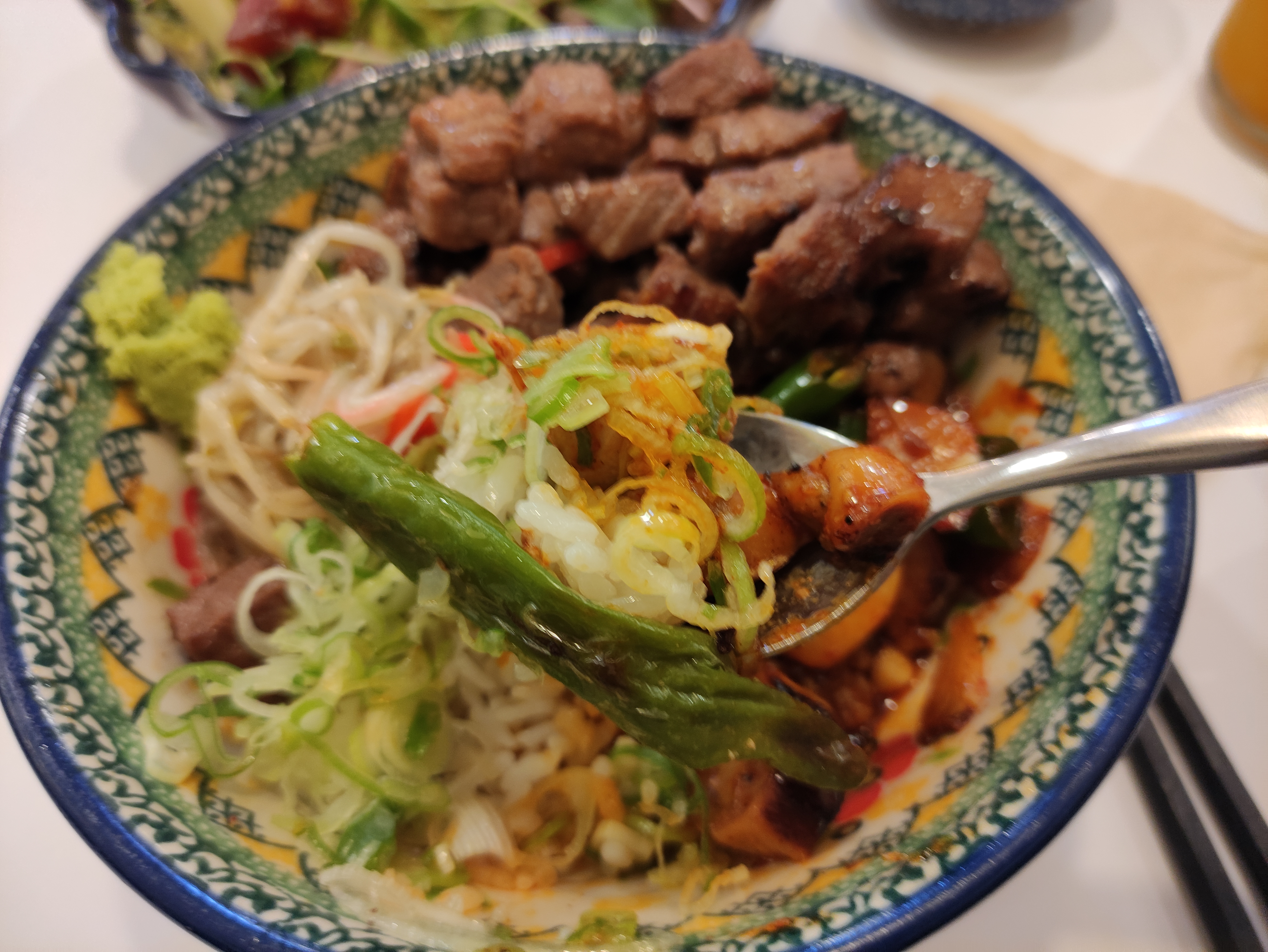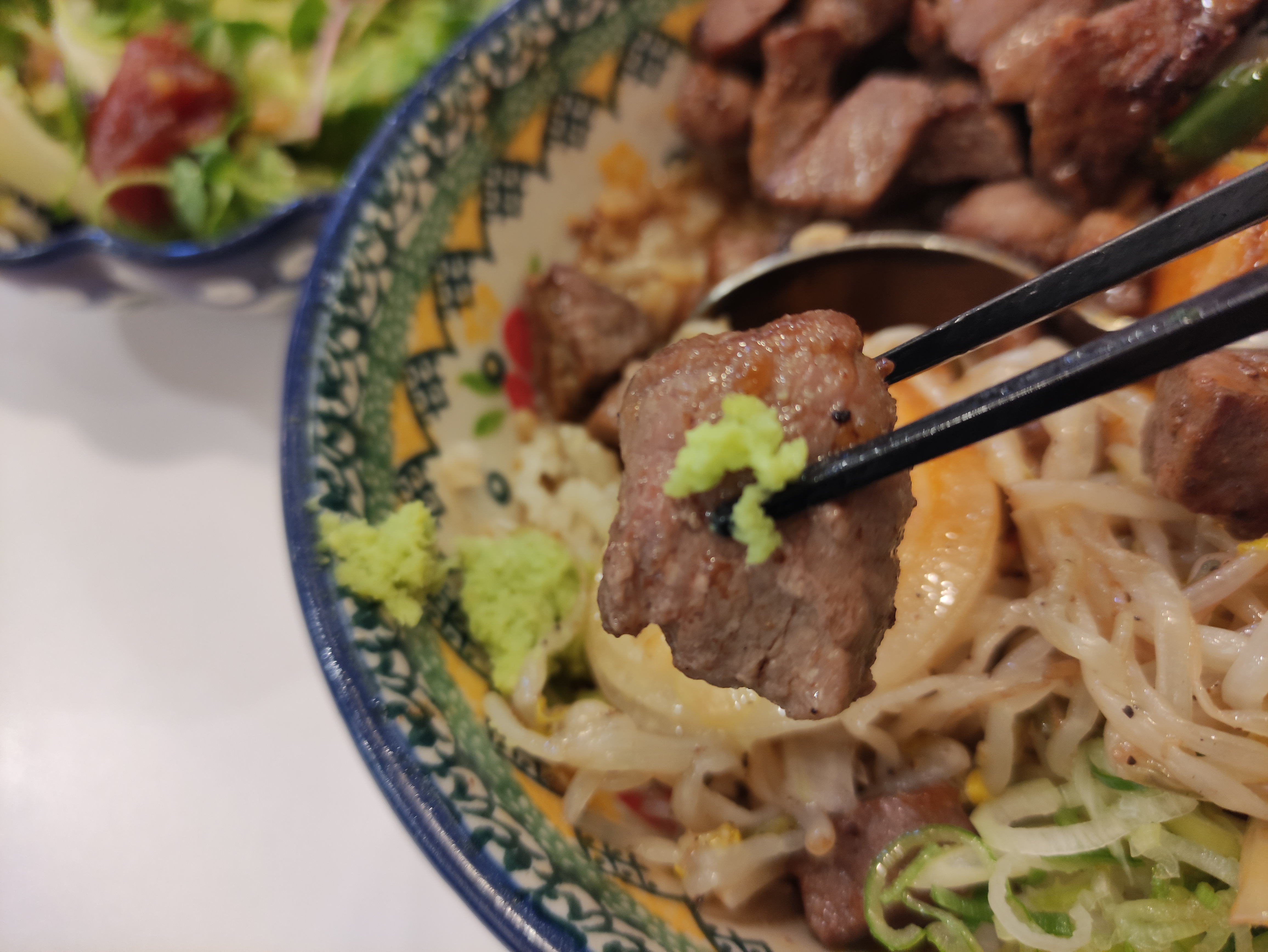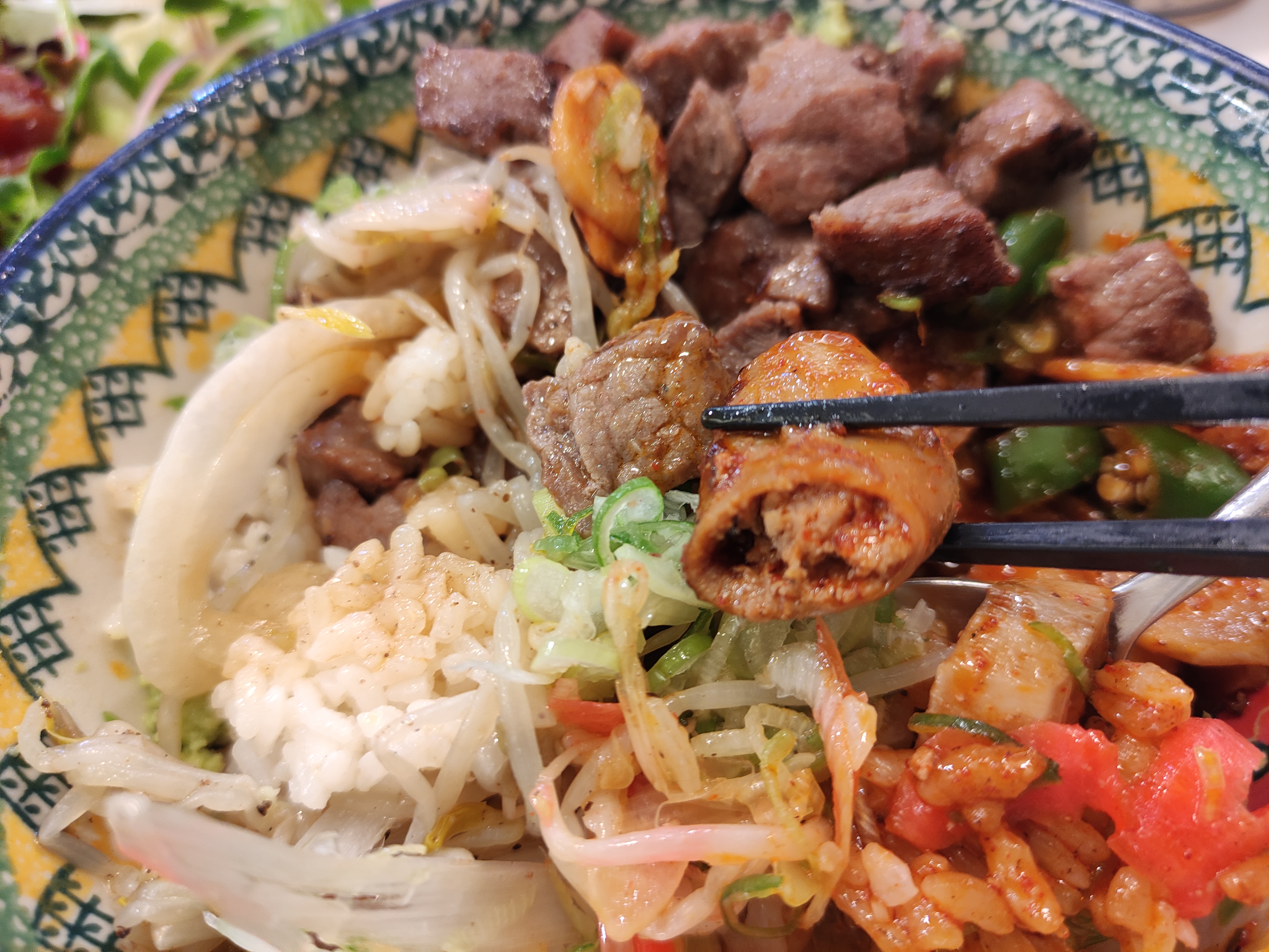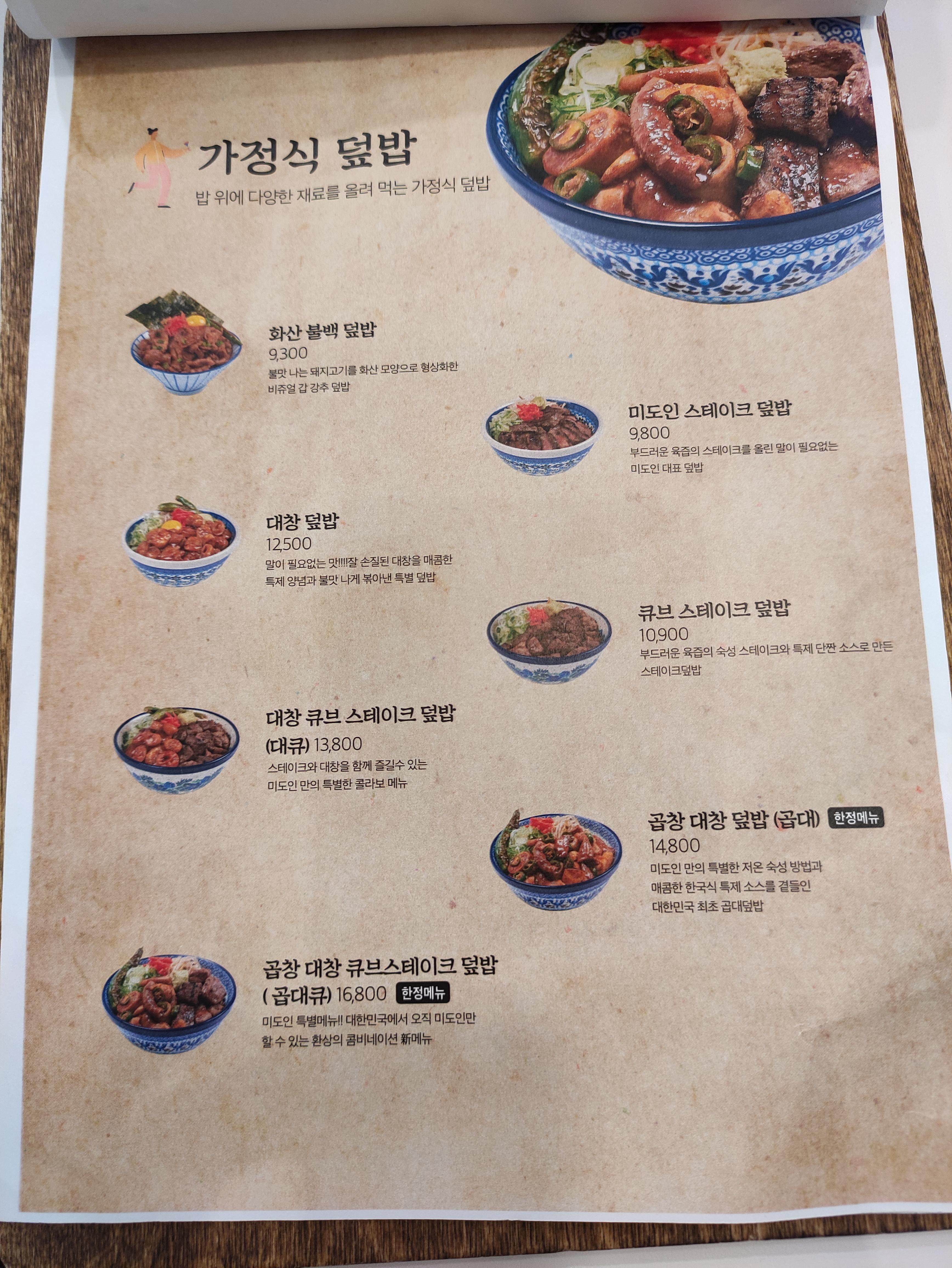 곱대큐덮밥이에요 대창 놀랍도록부드럽고 살살녹고요 곱창 쫄깃해서 씹는맛이좋고 스테이크도 넘넘맛있어요. 특히 곱창소스가 매콤하니 입에 착착붙어서좋았어요.
