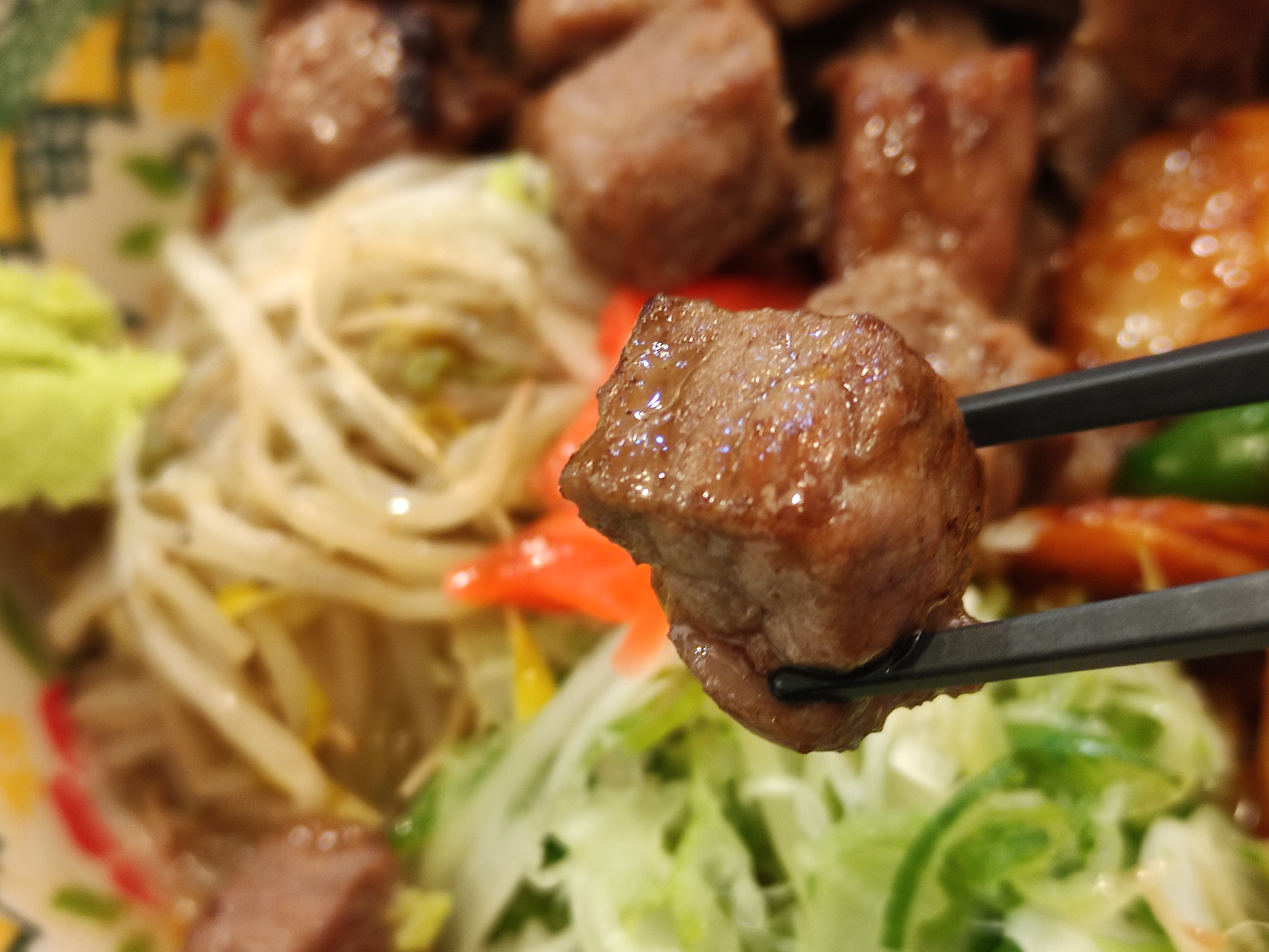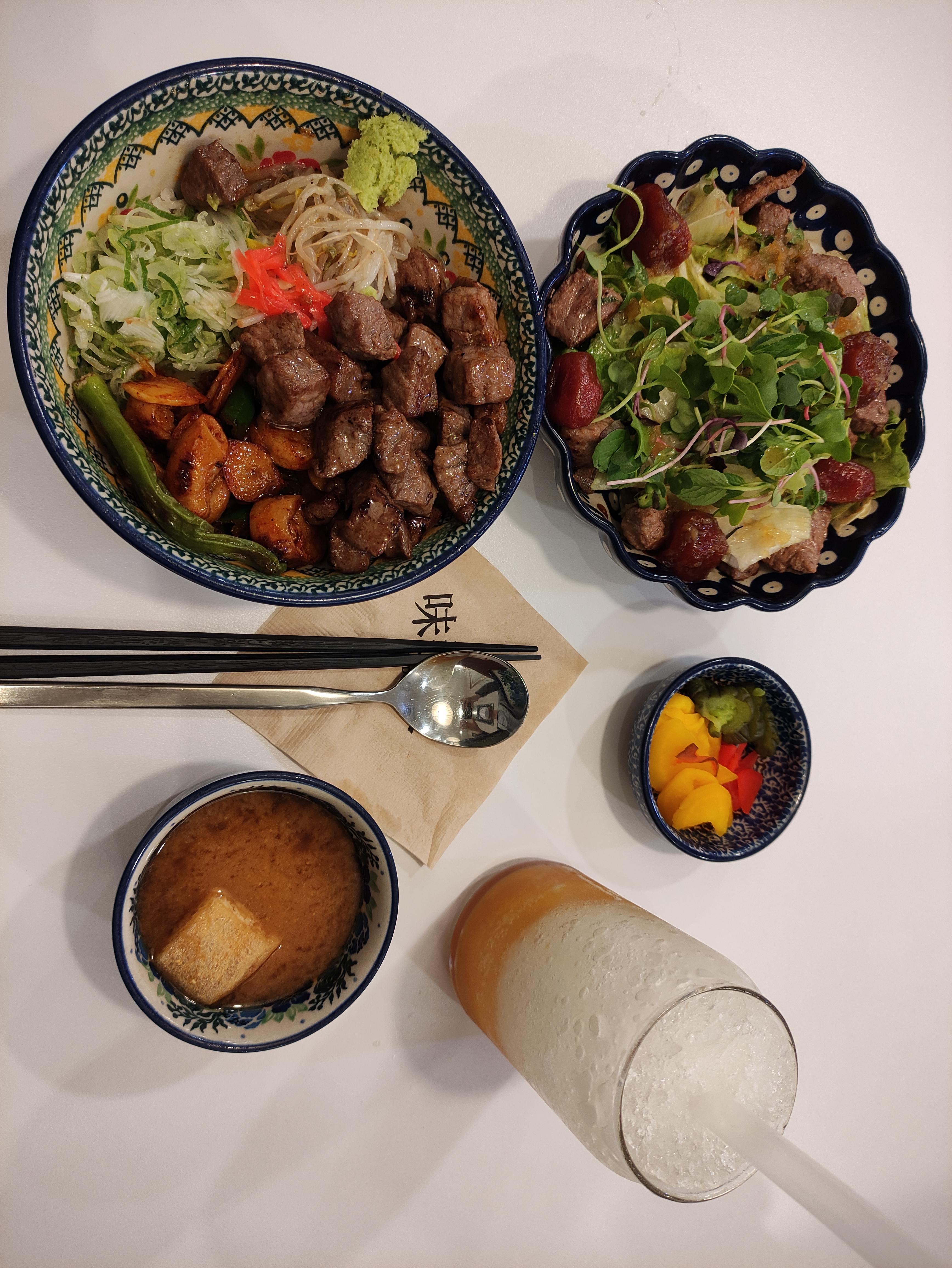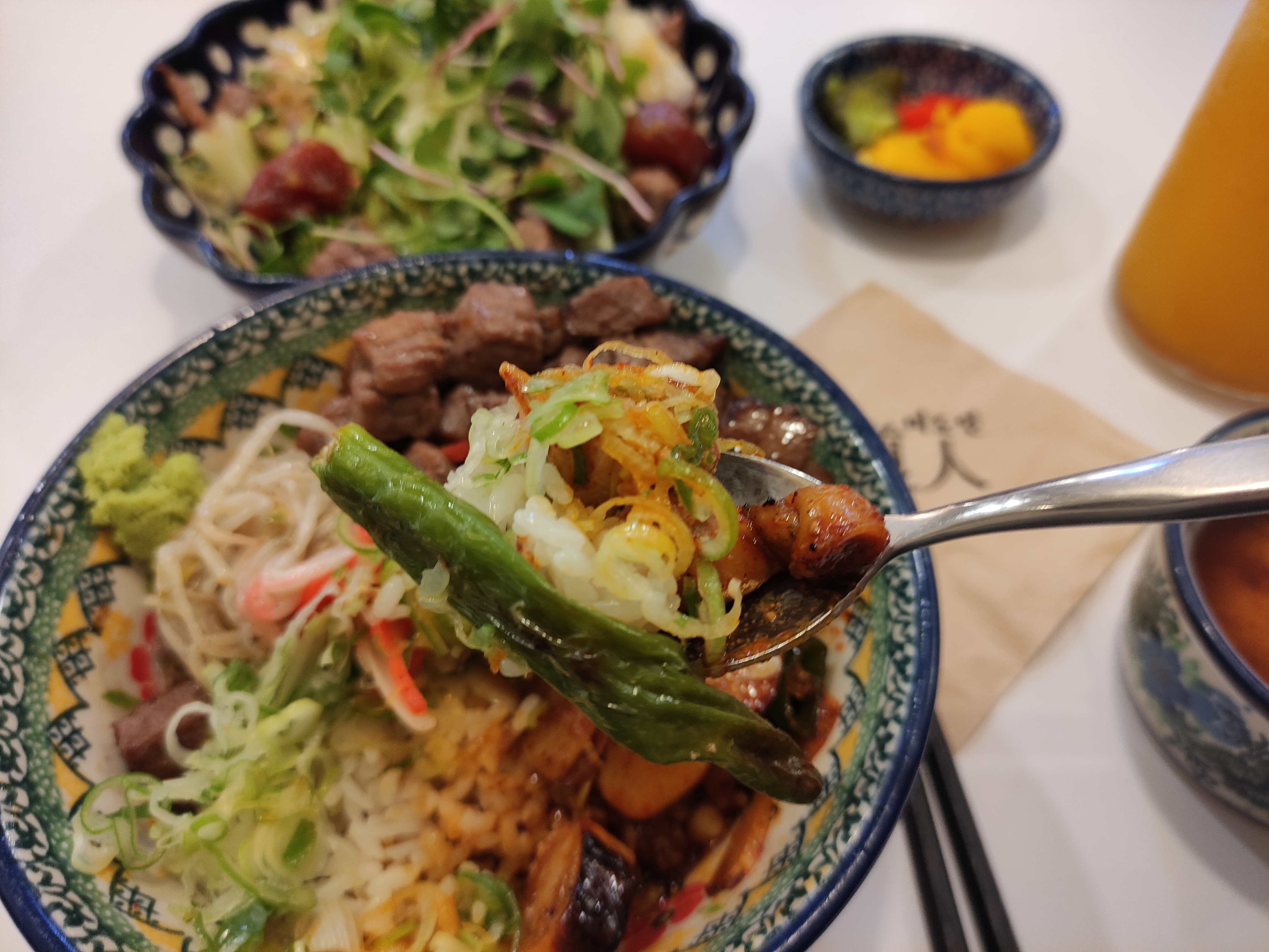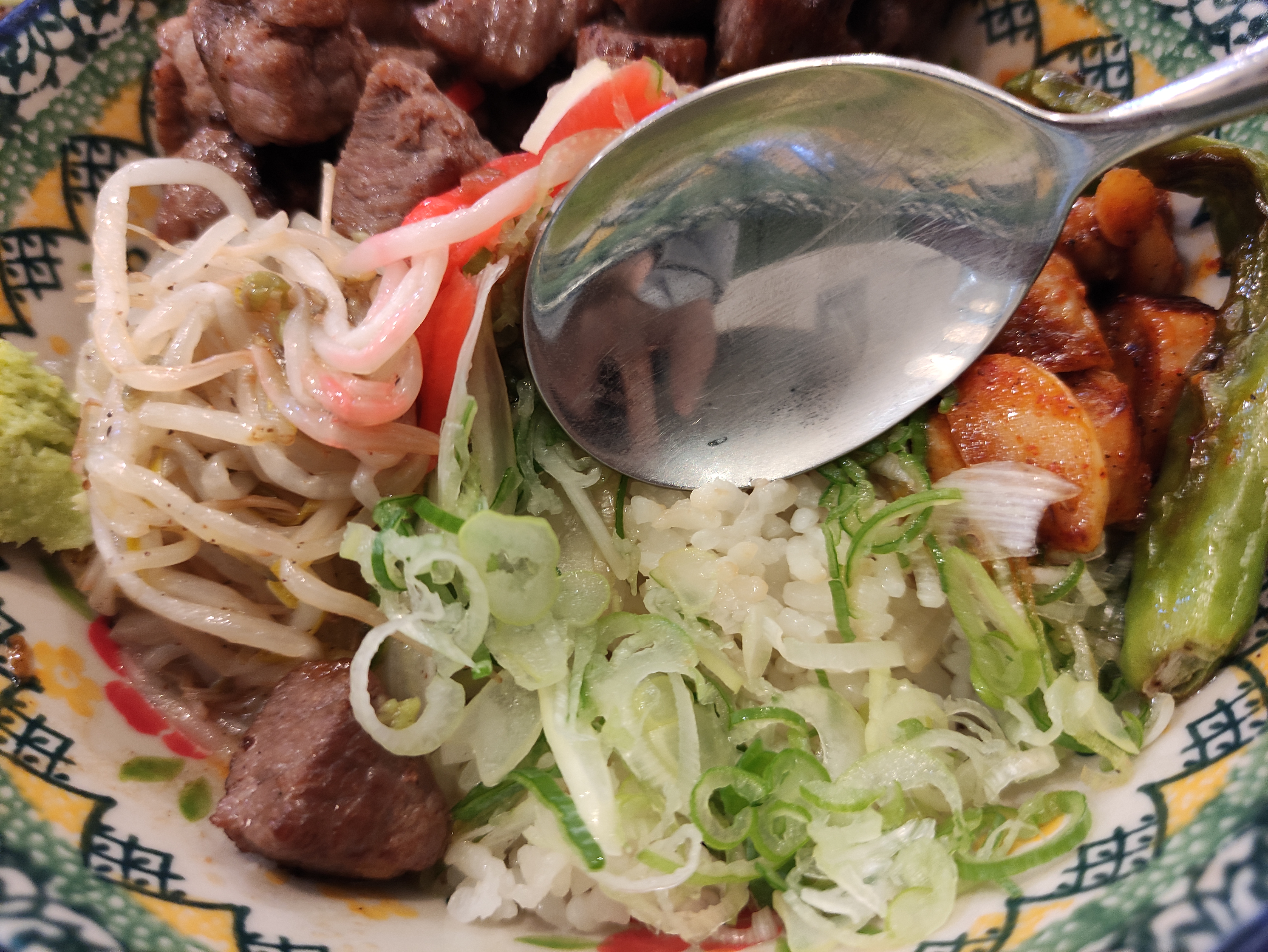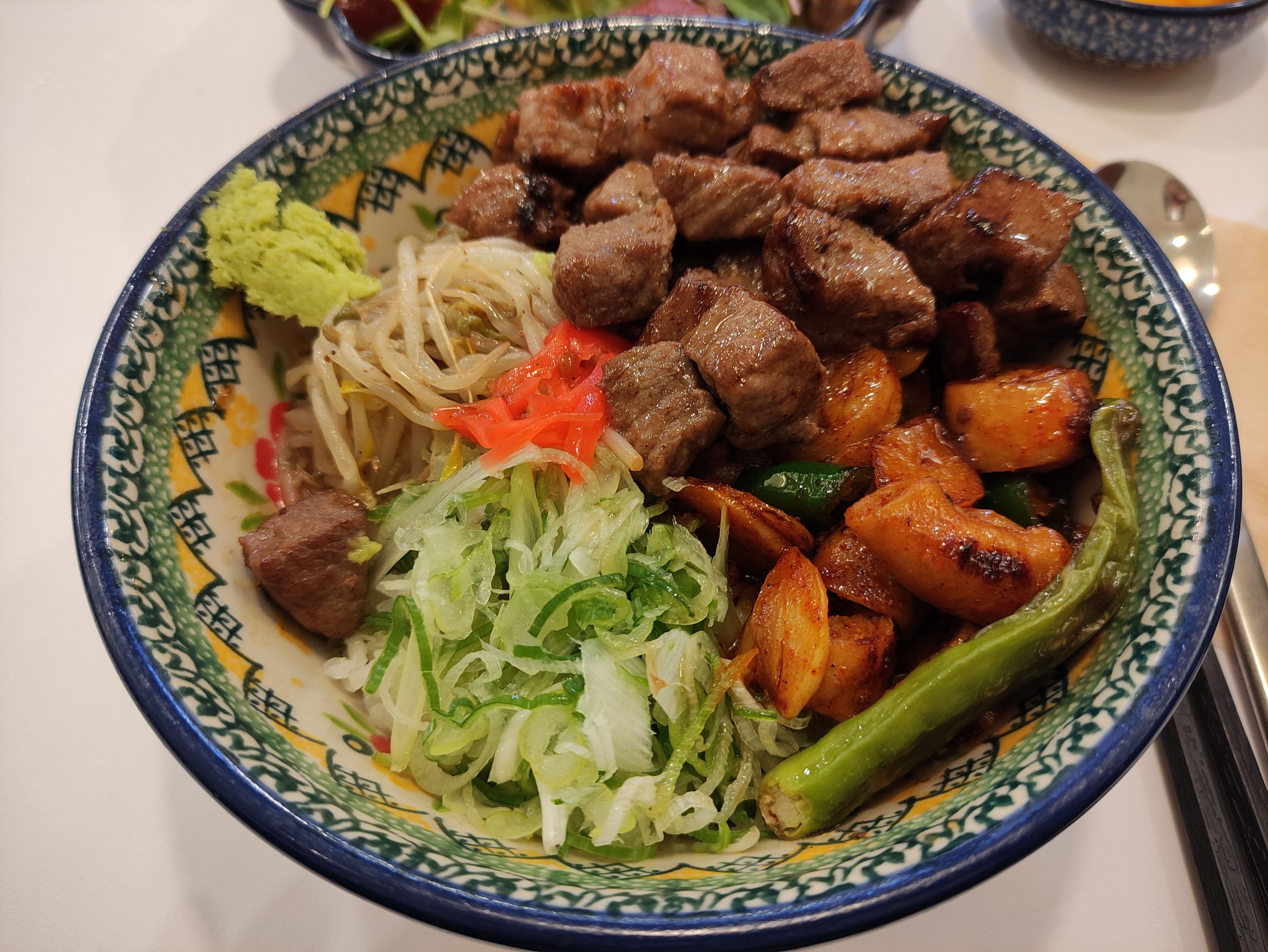 곱대큐덮밥이에요 대창 놀랍도록부드럽고 살살녹고요 곱창 쫄깃해서 씹는맛이좋고 스테이크도 넘넘맛있어요. 특히 곱창소스가 매콤하니 입에 착착붙어서좋았어요.