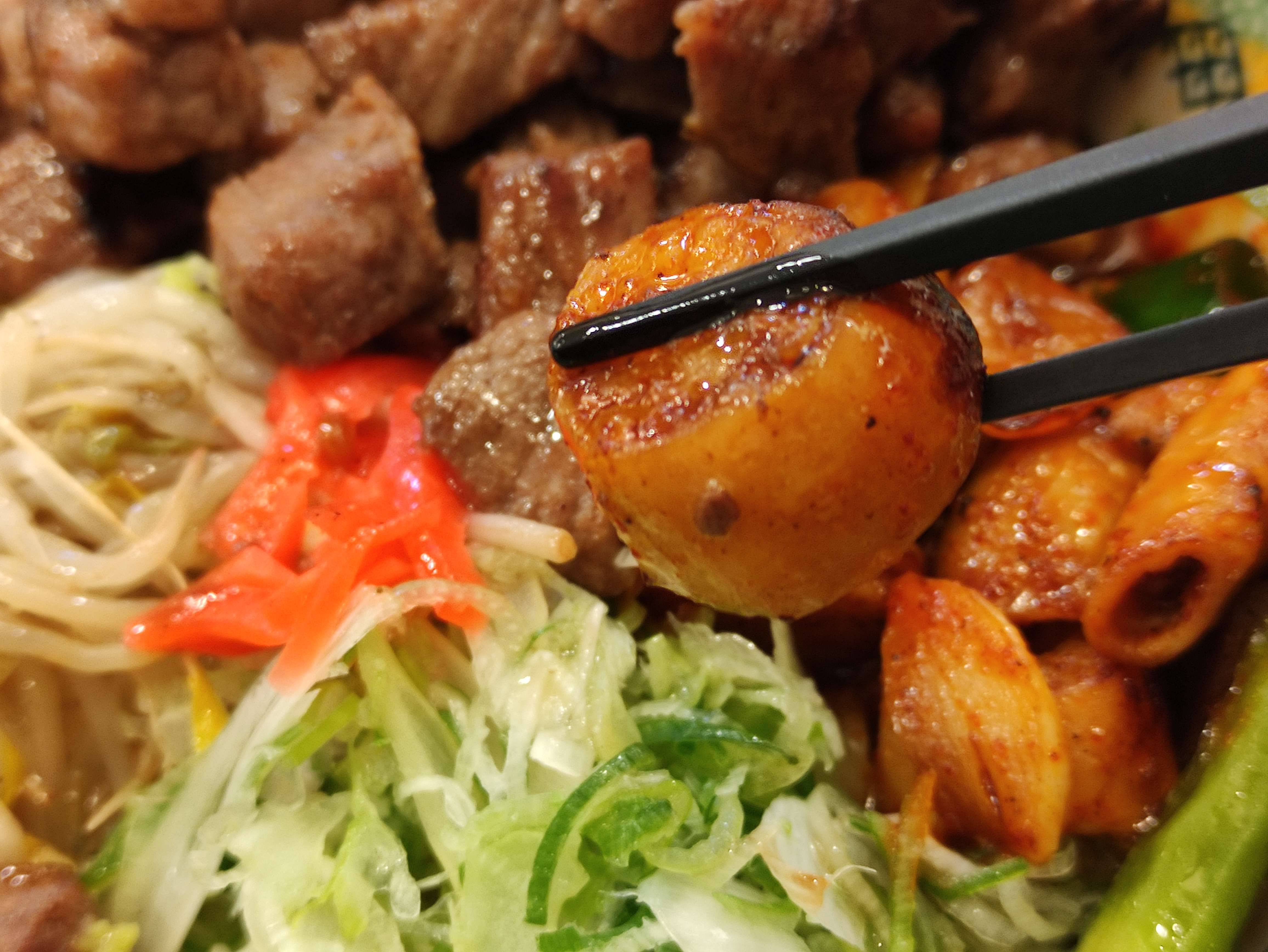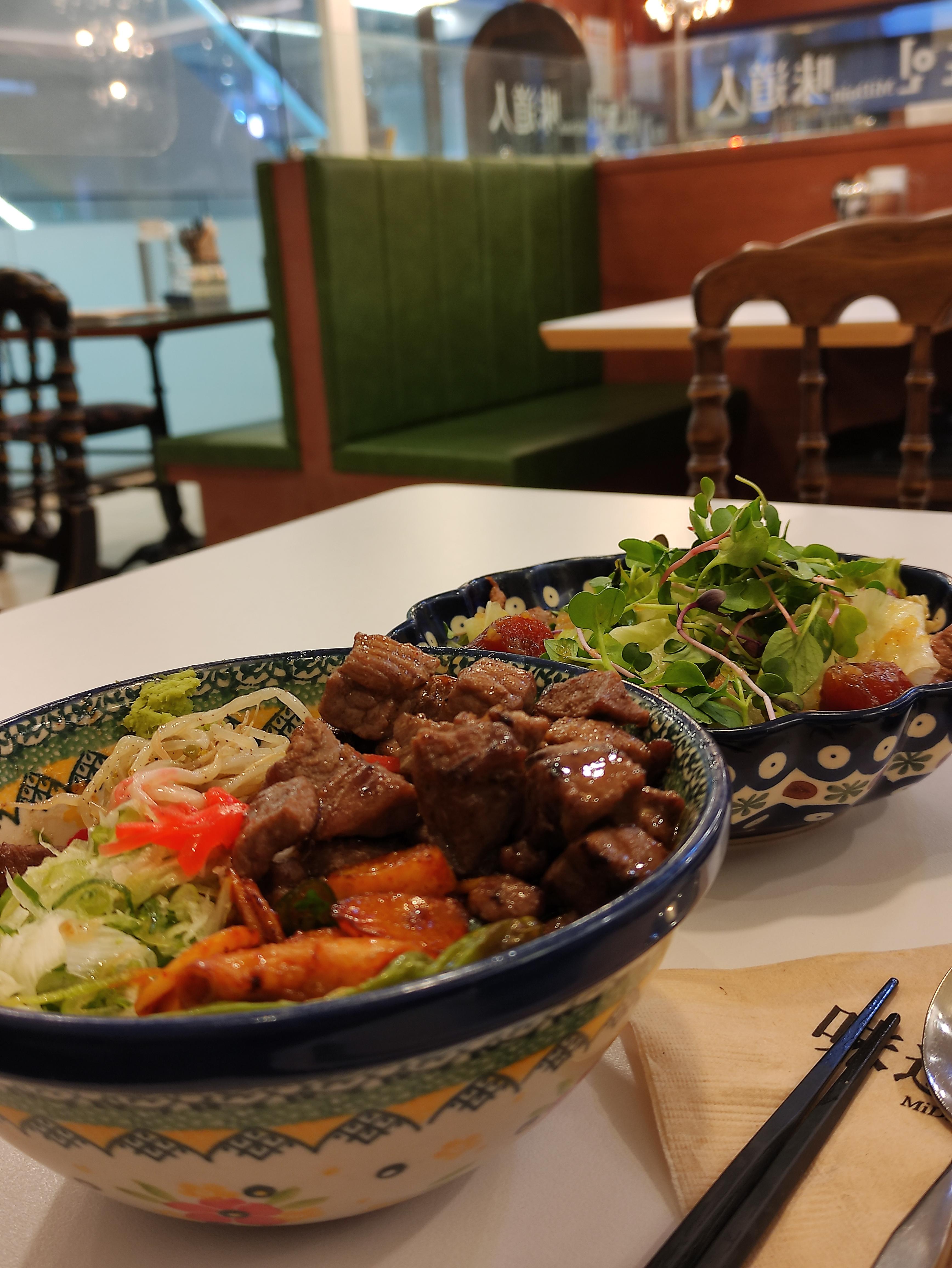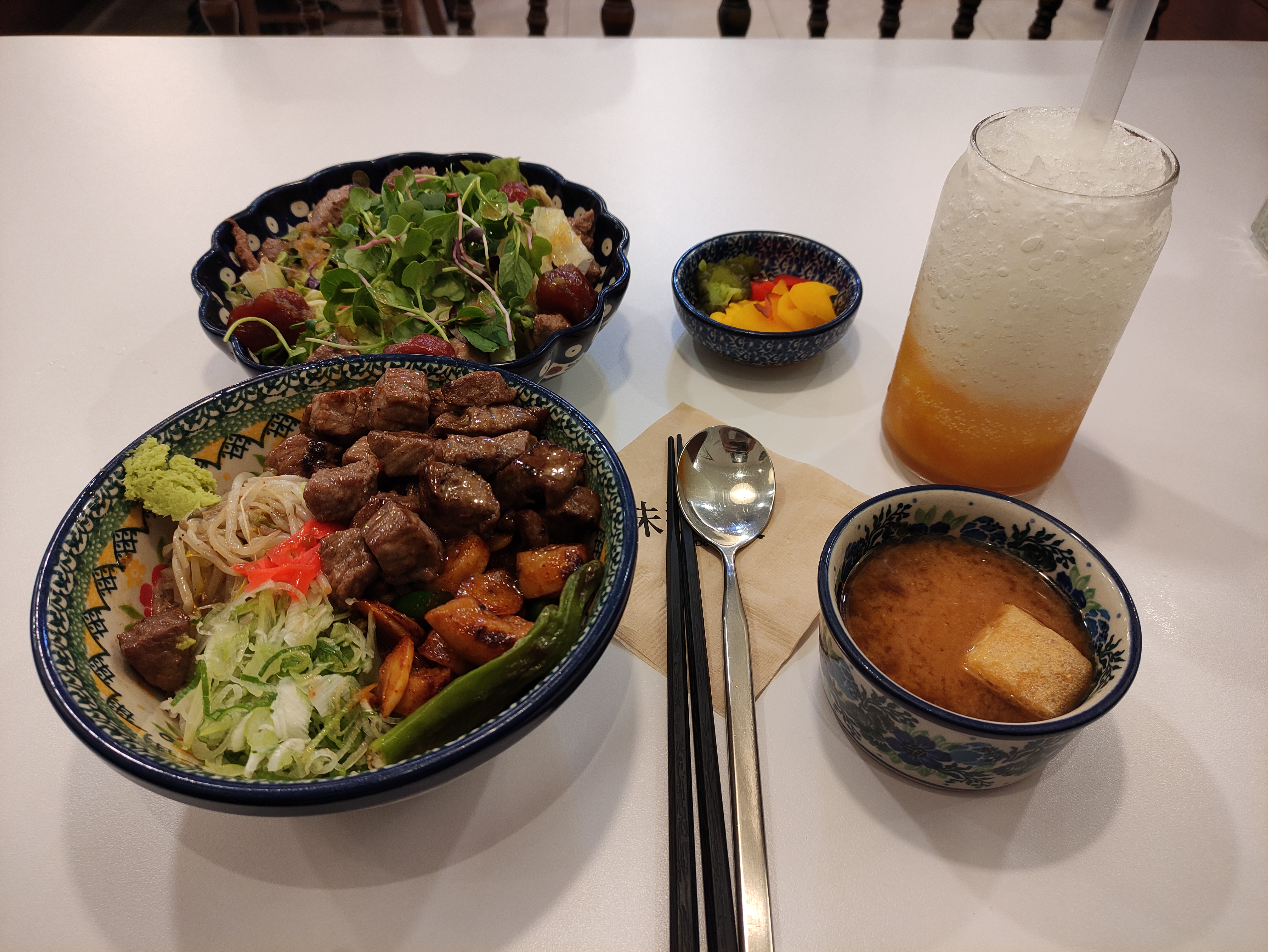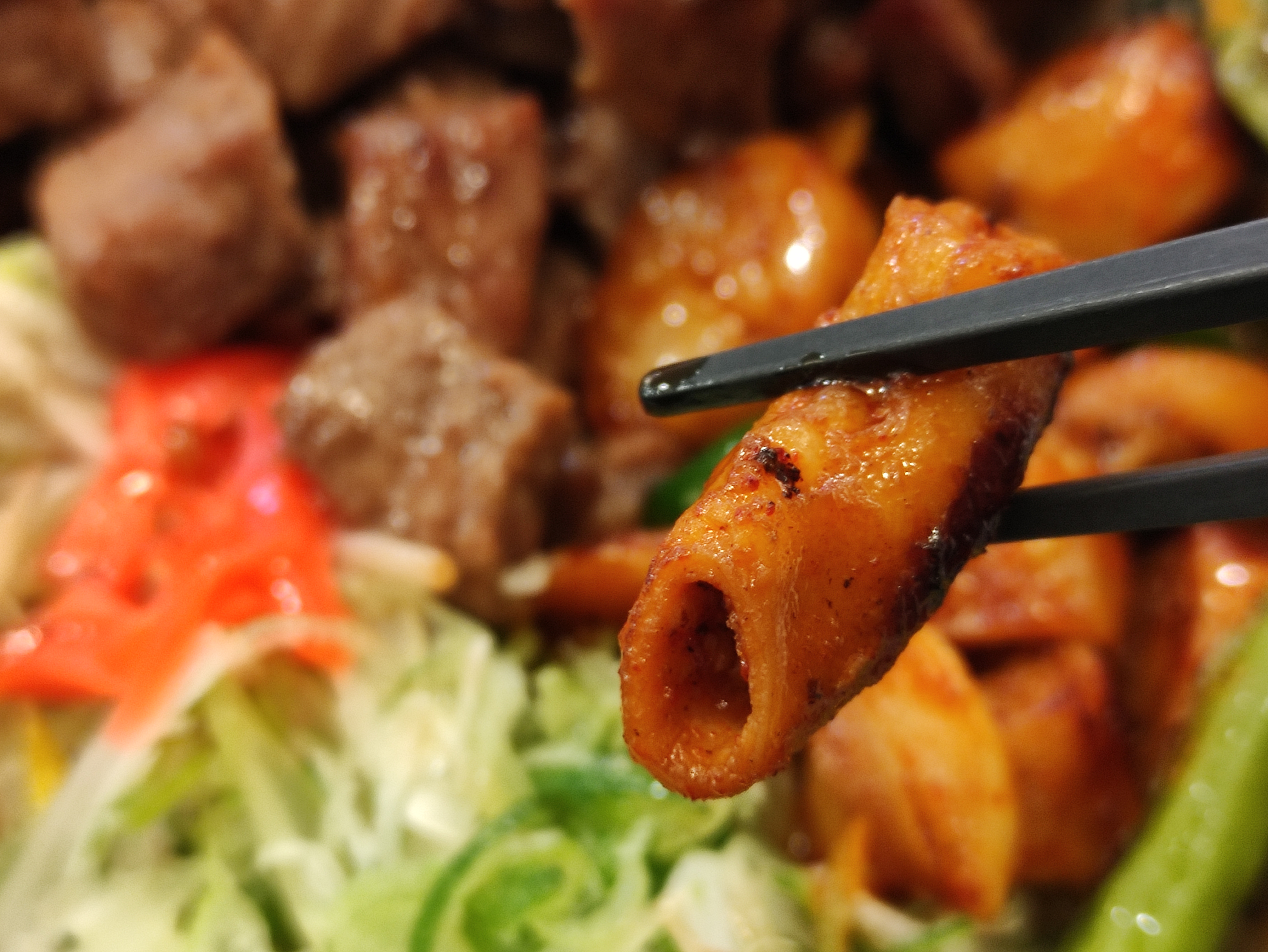 곱대큐덮밥이에요 대창 놀랍도록부드럽고 살살녹고요 곱창 쫄깃해서 씹는맛이좋고 스테이크도 넘넘맛있어요. 특히 곱창소스가 매콤하니 입에 착착붙어서좋았어요.