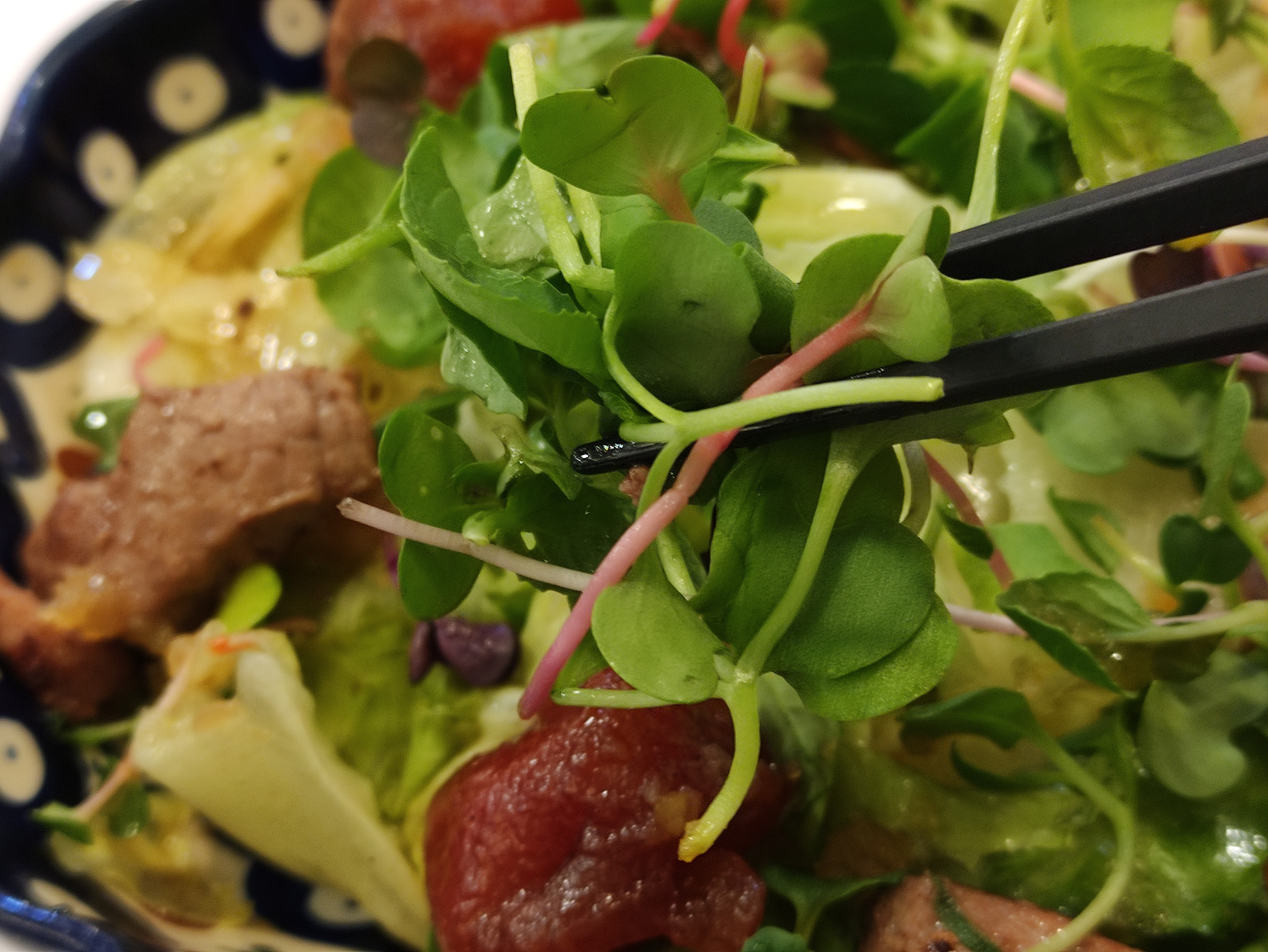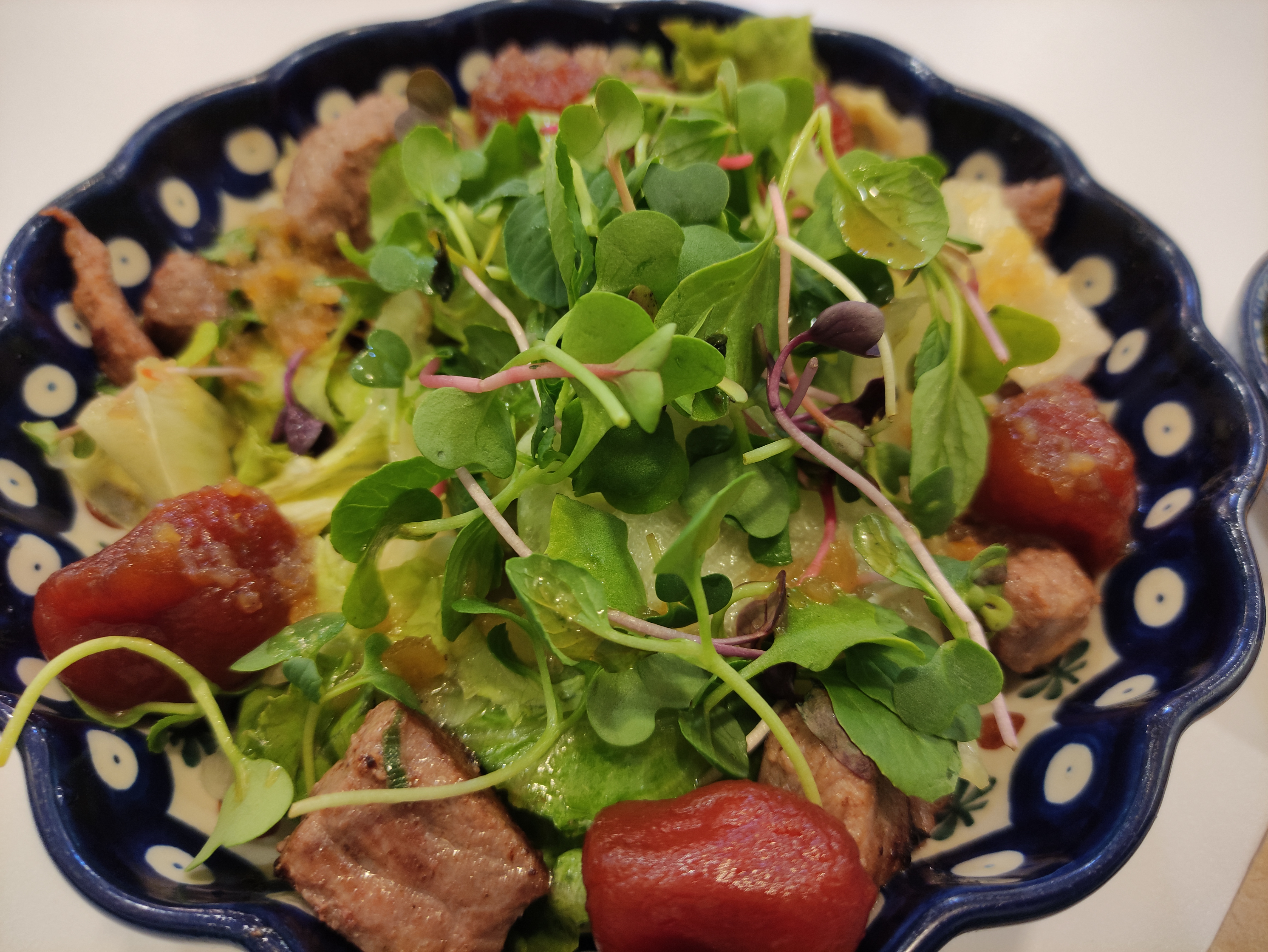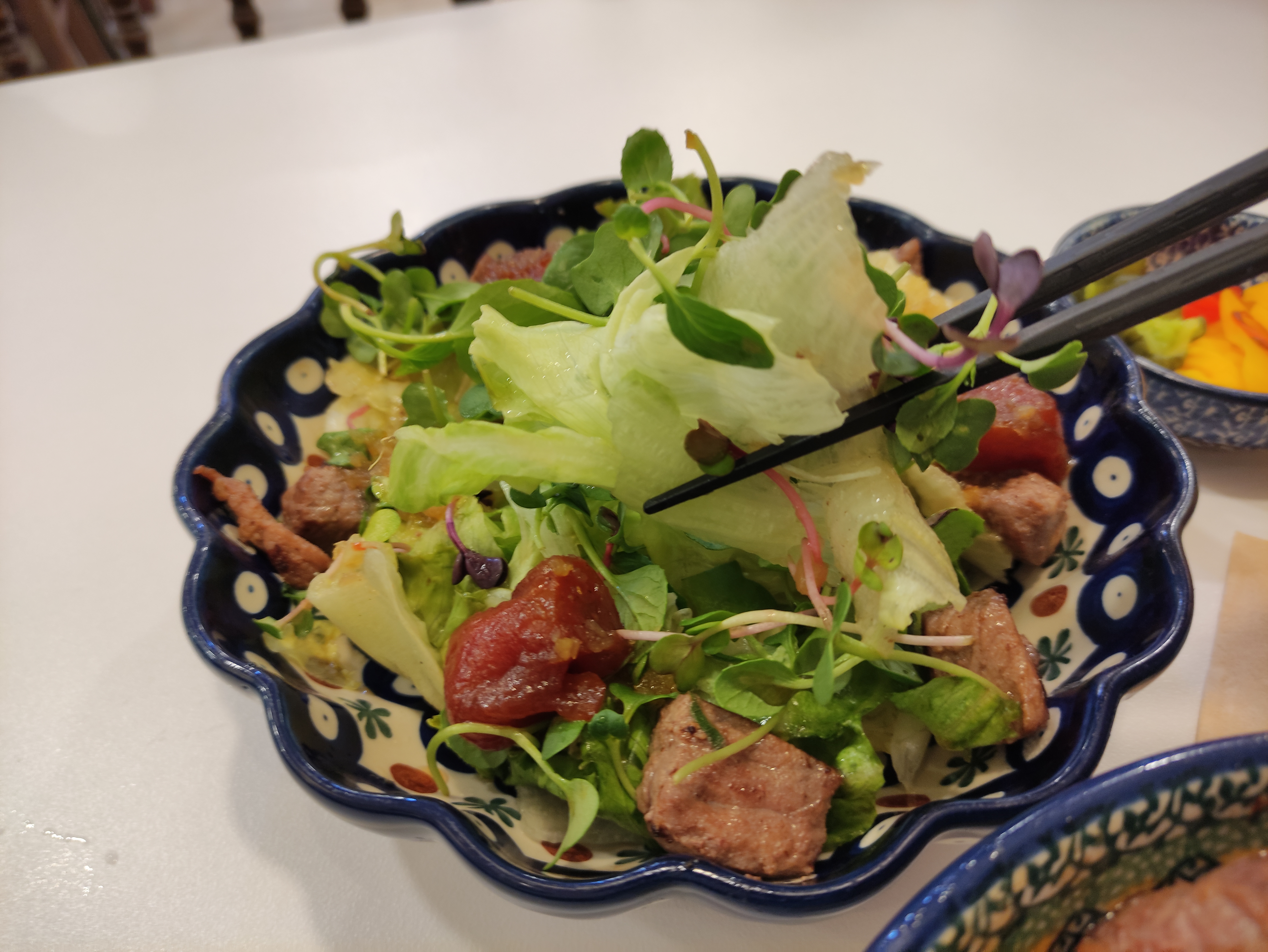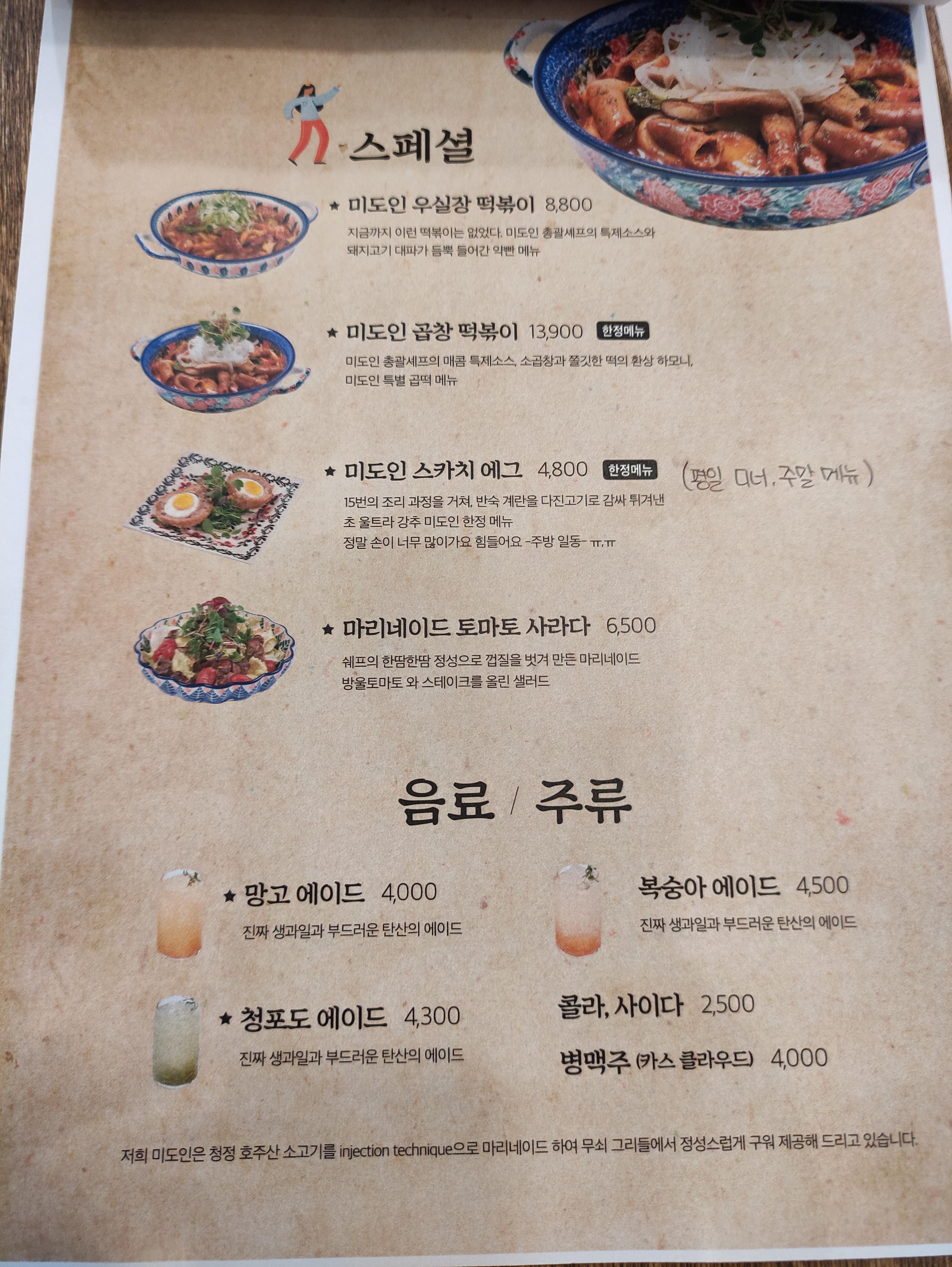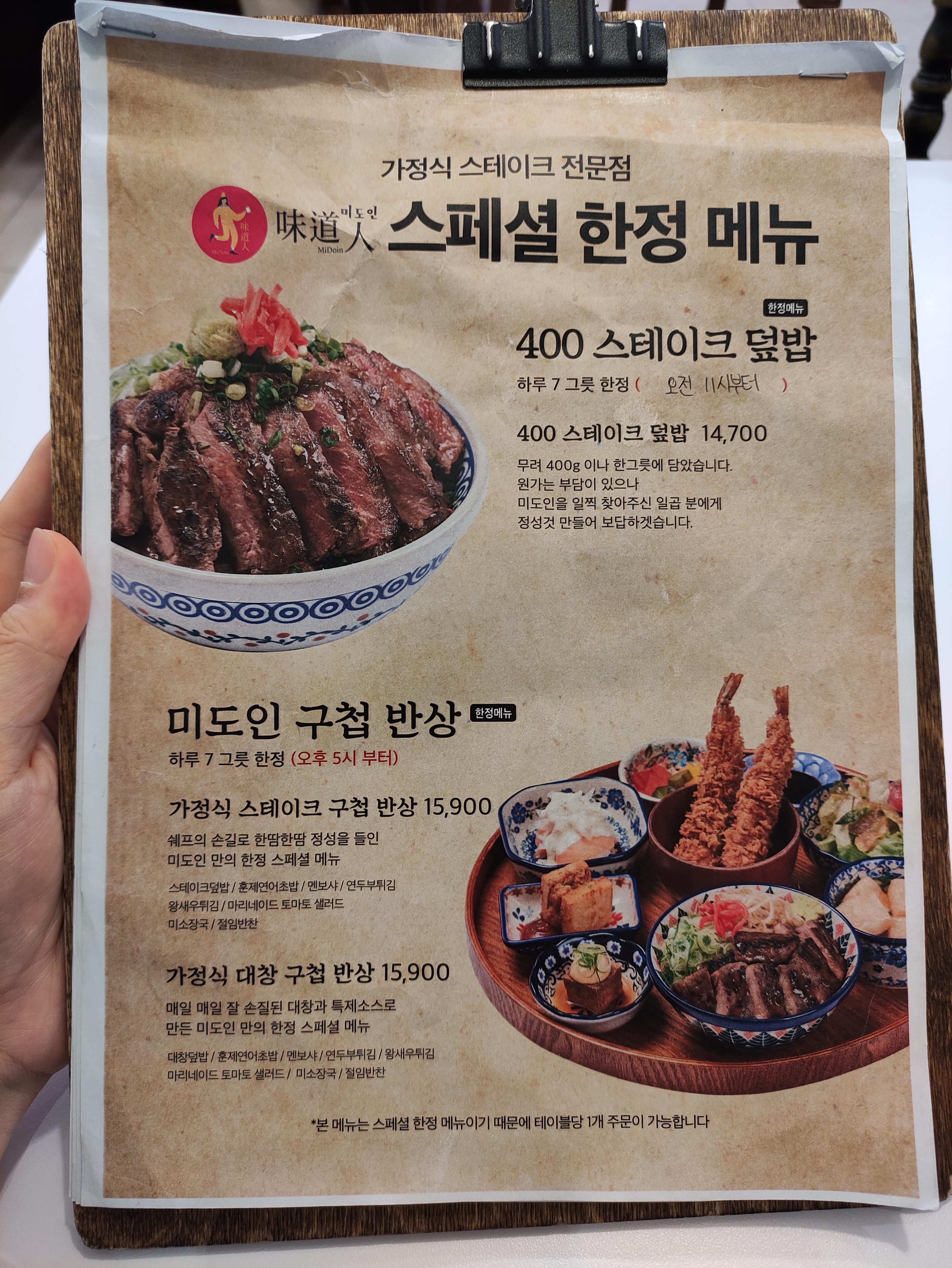 미도인의 메뉴판이에요. 400스테이크덮밥과 구첩반상이 한정메뉴고 뒤에 가정식스테이크 덮밥 면류 스페셜순으로 구성되어있어요. 저는 곱창대창큐브스테이크덮밥과 마리네이드 토마토 사라다를 주문했어요. 마리네이드 토마토 사라다는 껍질을 벗긴 미니토마토가 들어있는 소고기 샐러드에요. 그리고 음료로 망고주스도 주문했어요.