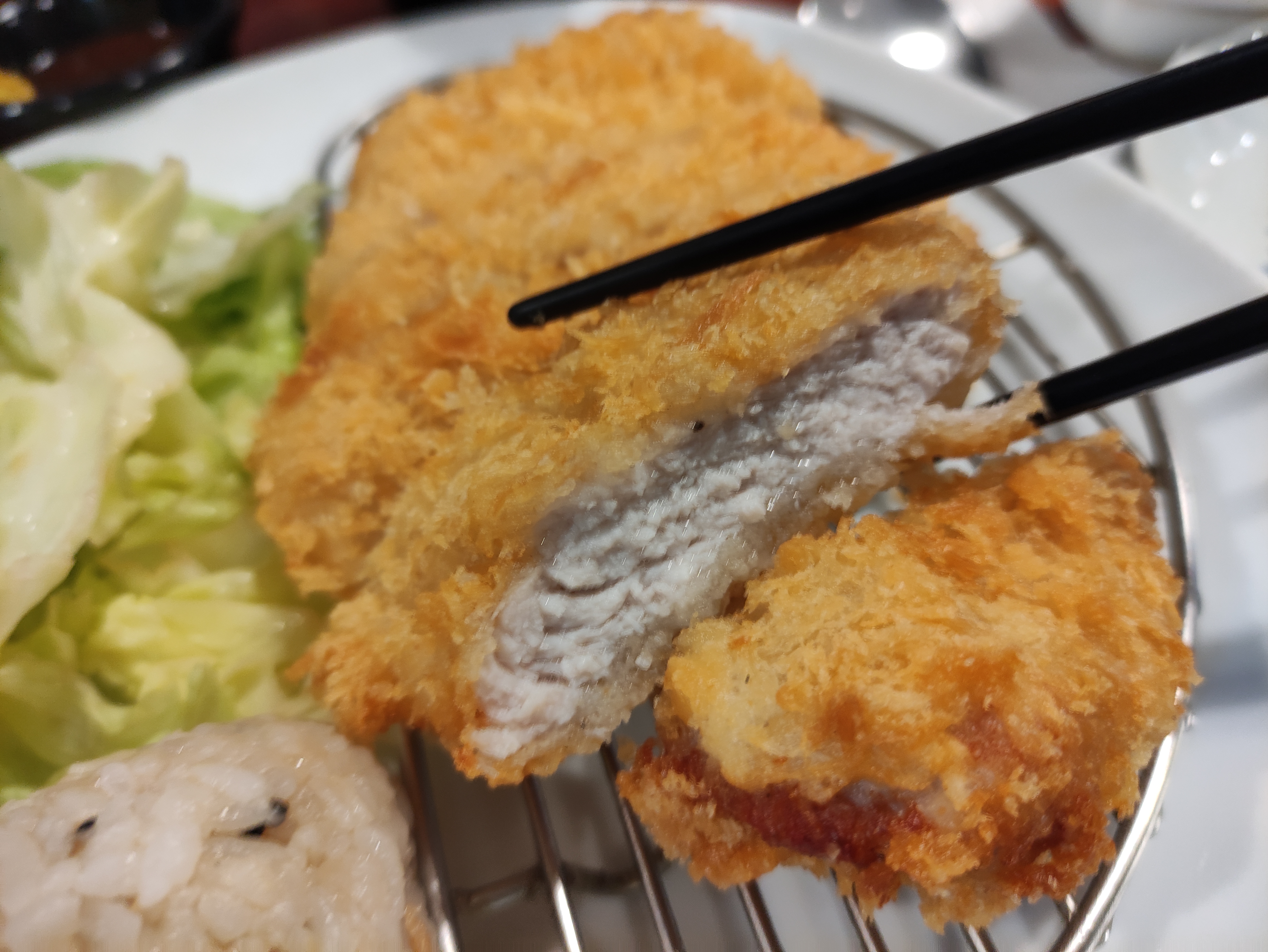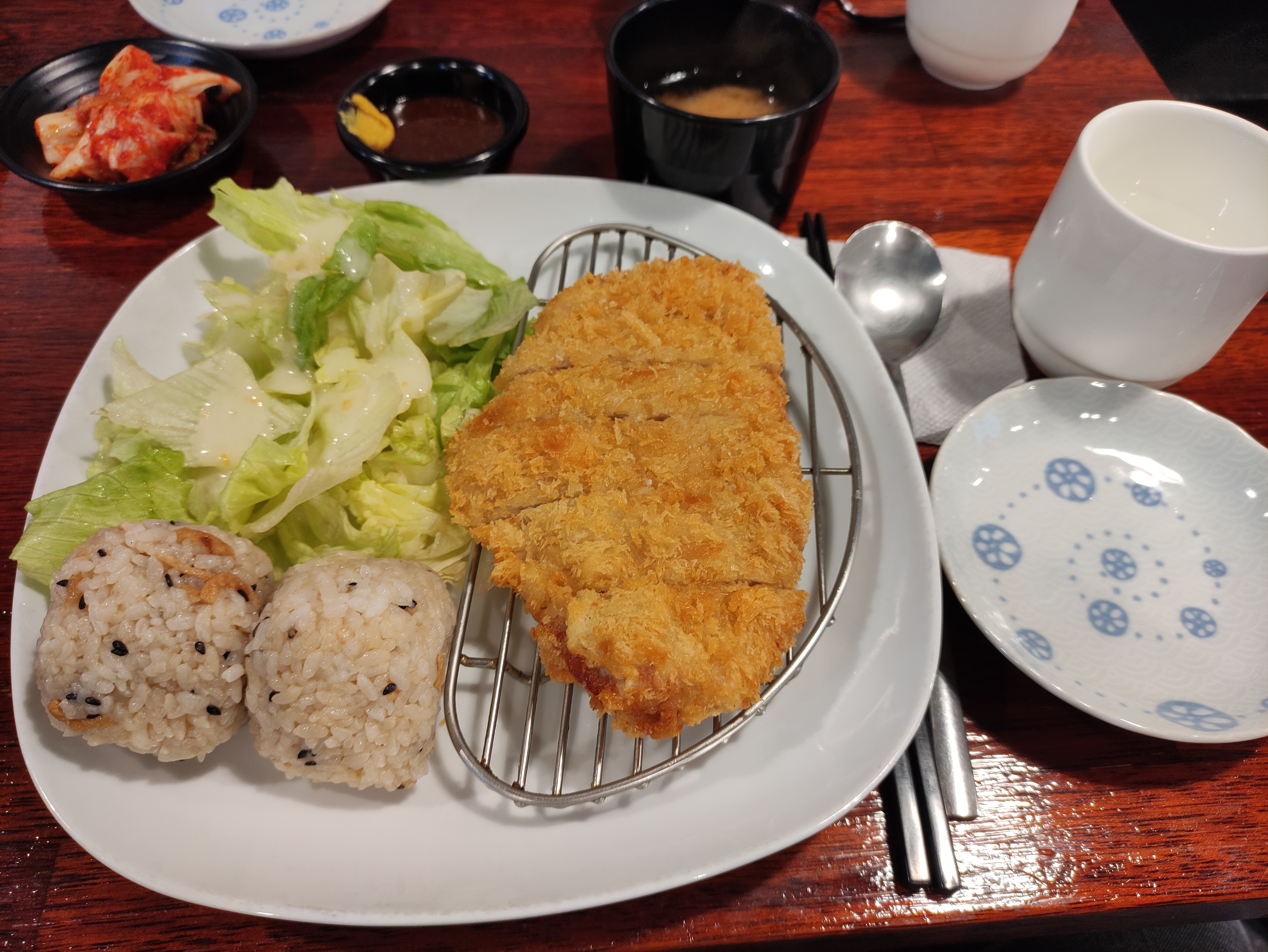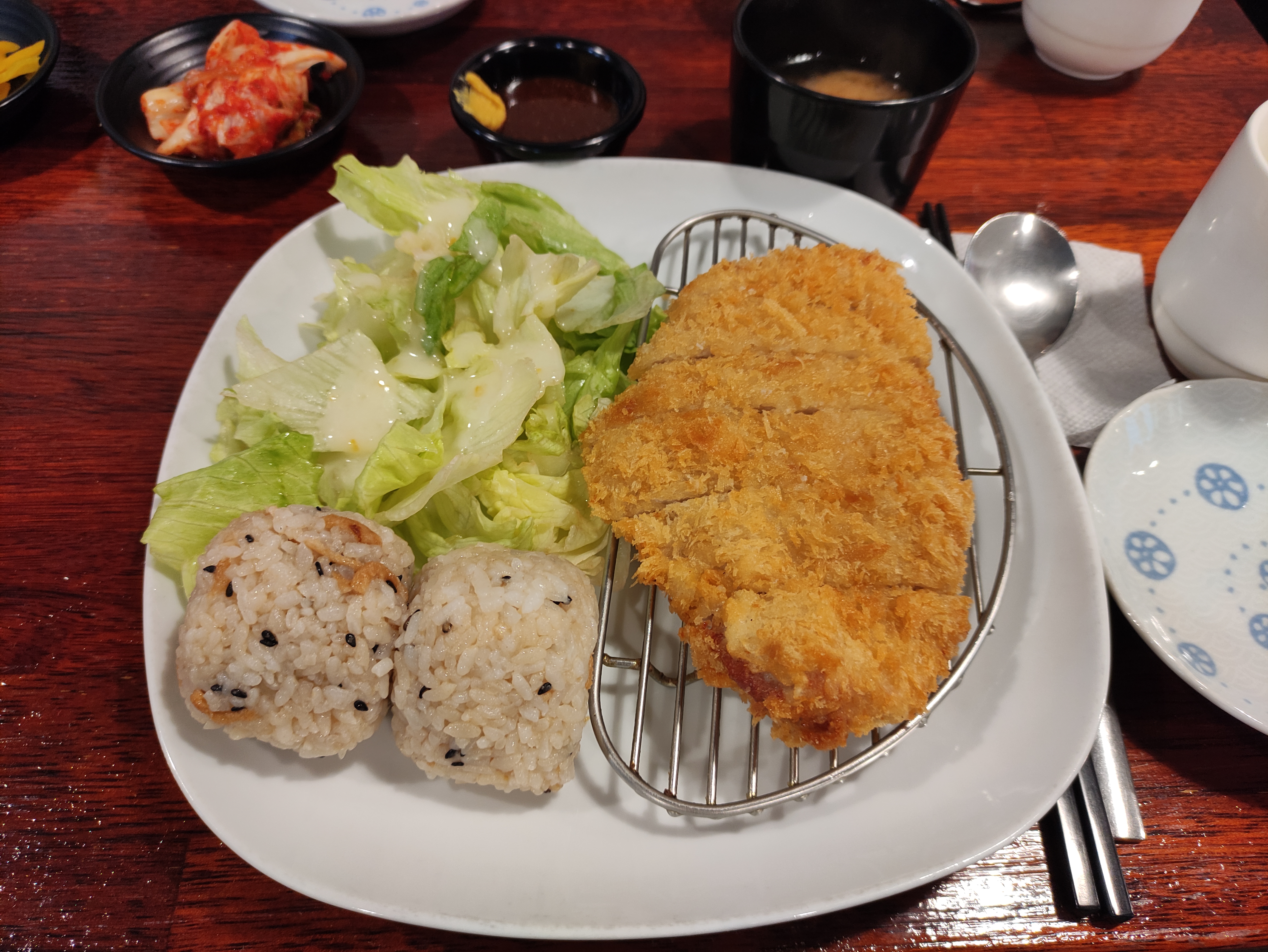 주문한 도톰돈까스가 나왔습니다. 촉촉돈까스와 다르게 도톰돈까스는 샐러드가 좀 적고 대신 주먹밥이 두덩이 나옵니다. 결정적인차이는 도톰돈까스는 돈까스가 샐러드와 따로 있어서 바삭함이 살아있어요. 근데 주먹밥이 두덩이라 촉촉돈까스보다 배부르네요. 전 샐러드를 좋아해서 촉촉이 더 맞는거같아요. 도톰돈까스도 맛있게 잘 먹었습니다. 다음엔 카레돈까스를 먹어볼거에요. ㅎㅎ