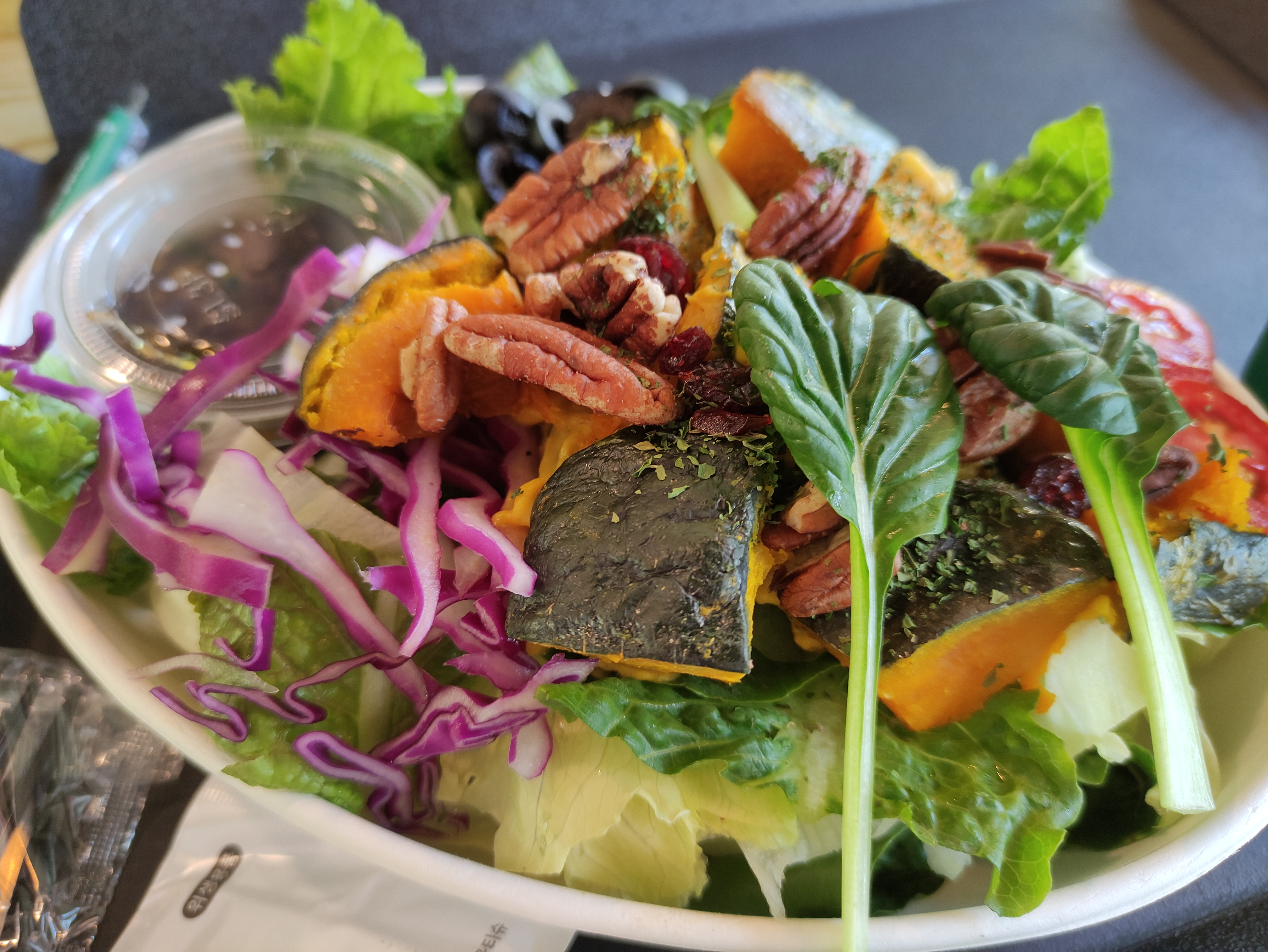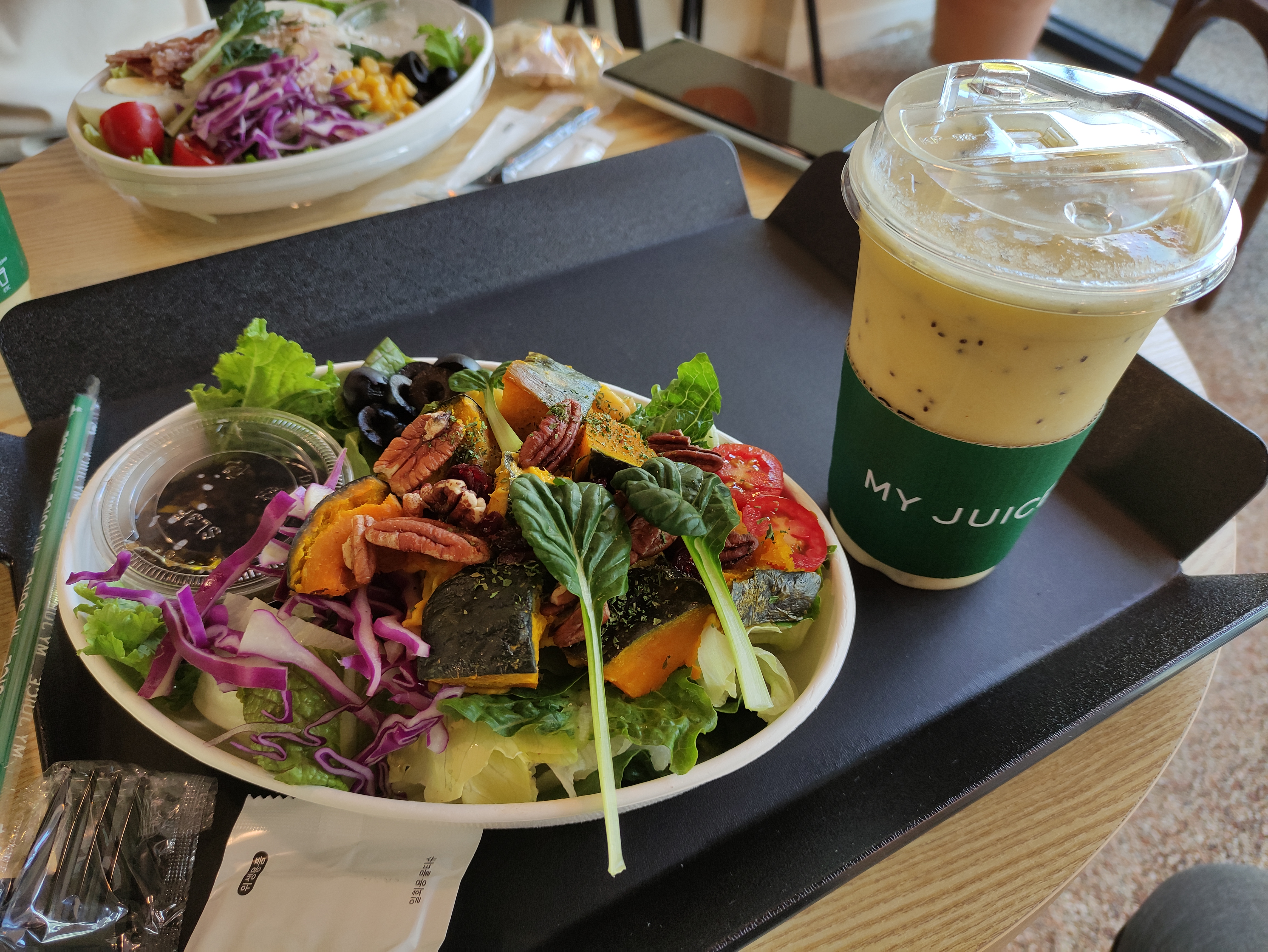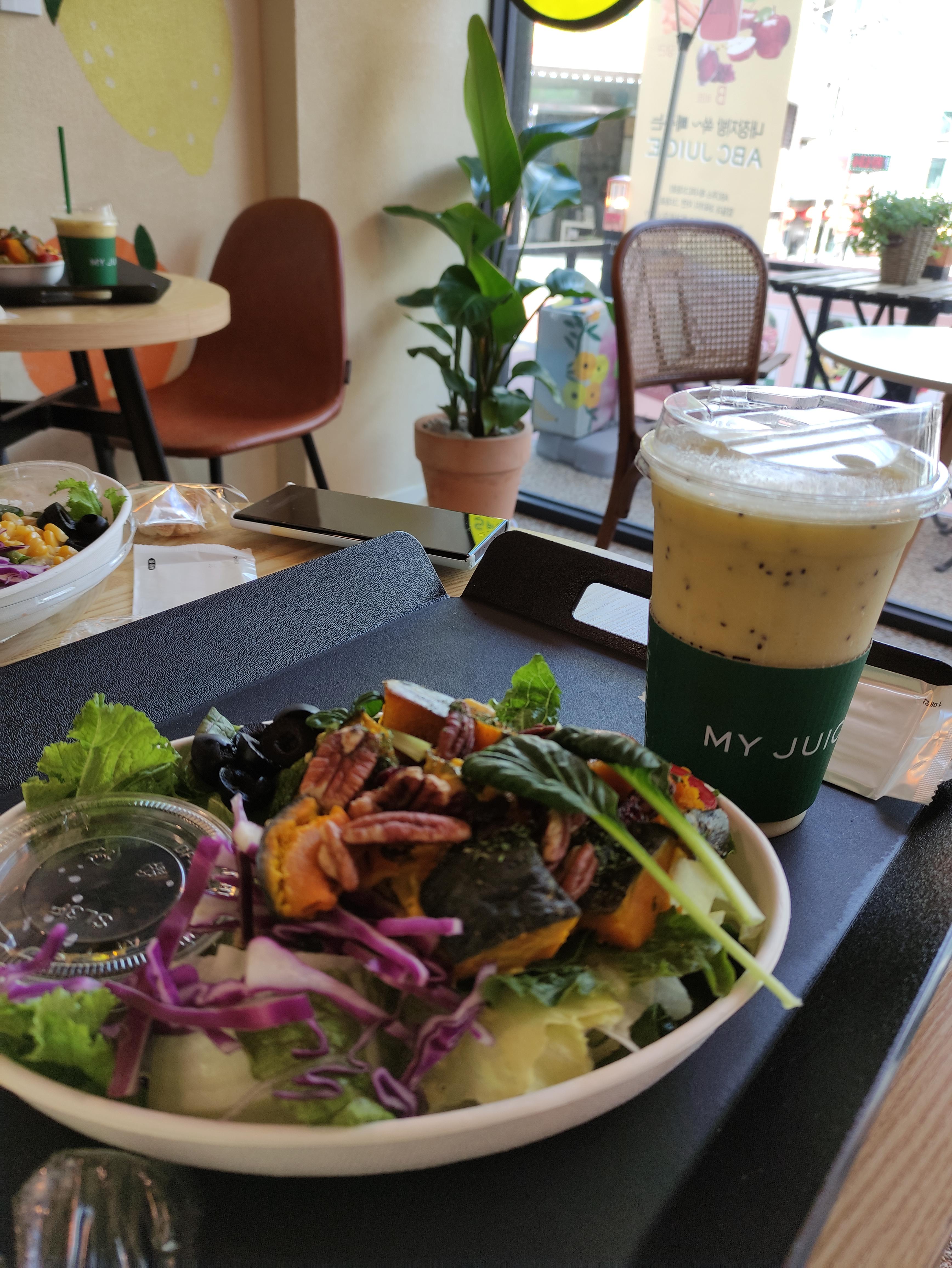 오늘의 쥬스와 단호박샐러드를 주문했어요. 오늘의 쥬스는 키위파인애플쥬스인데 직접만들기때문에 넘 신선해요. 샐러드도 당일아침에 만들거나 다 떨어졌을경우심지어 주문즉시만들어주시기도 하십니다. 그만큼 재료가 신선해서 아삭한 식감을 잘느낄수있어요. 여기는 수비드치킨샐러드가 닭고기가 엄청부드럽대요. 다음번엔 수비드샐러드 먹어봐야겠어요. ㅎㅎ