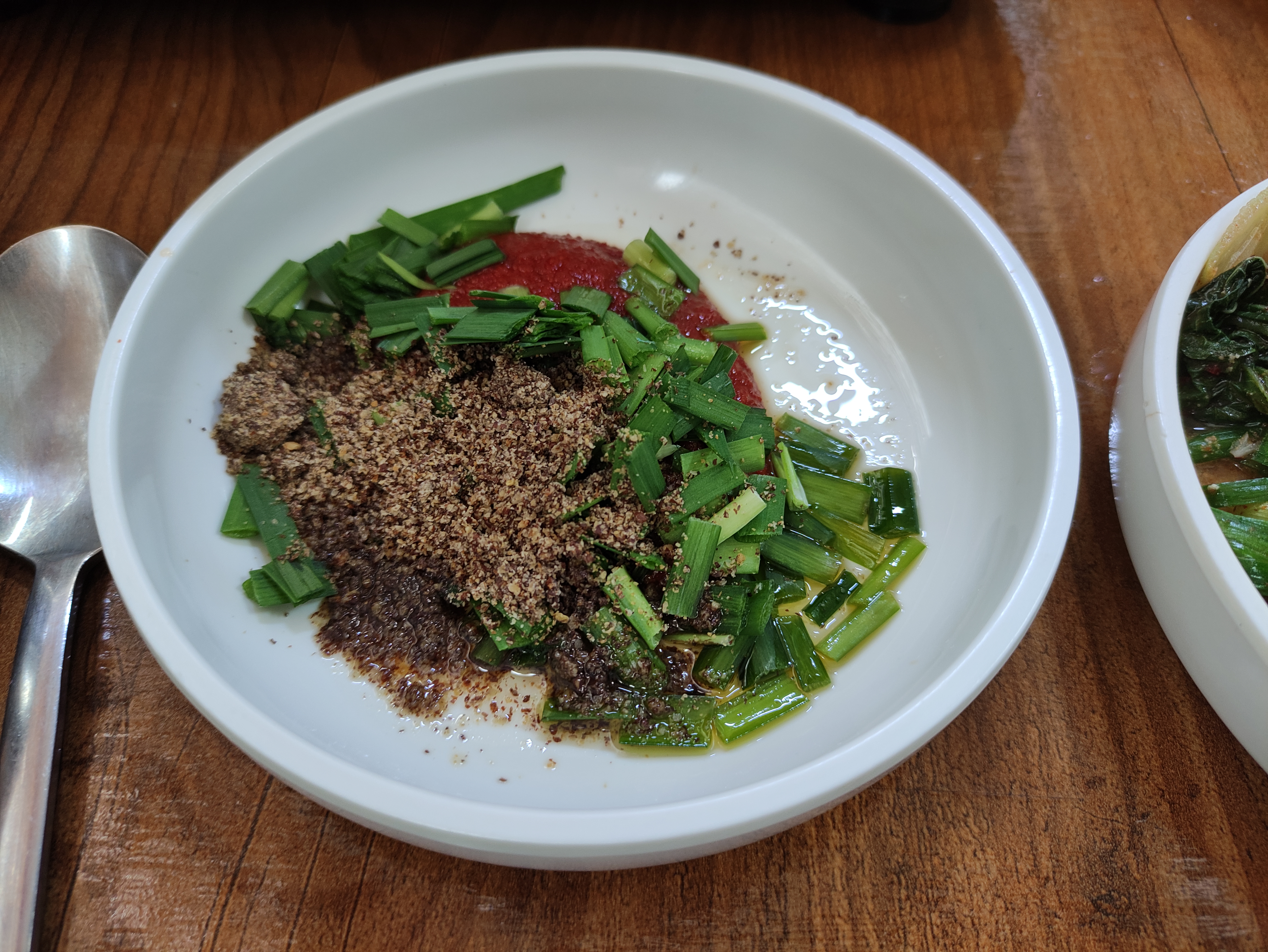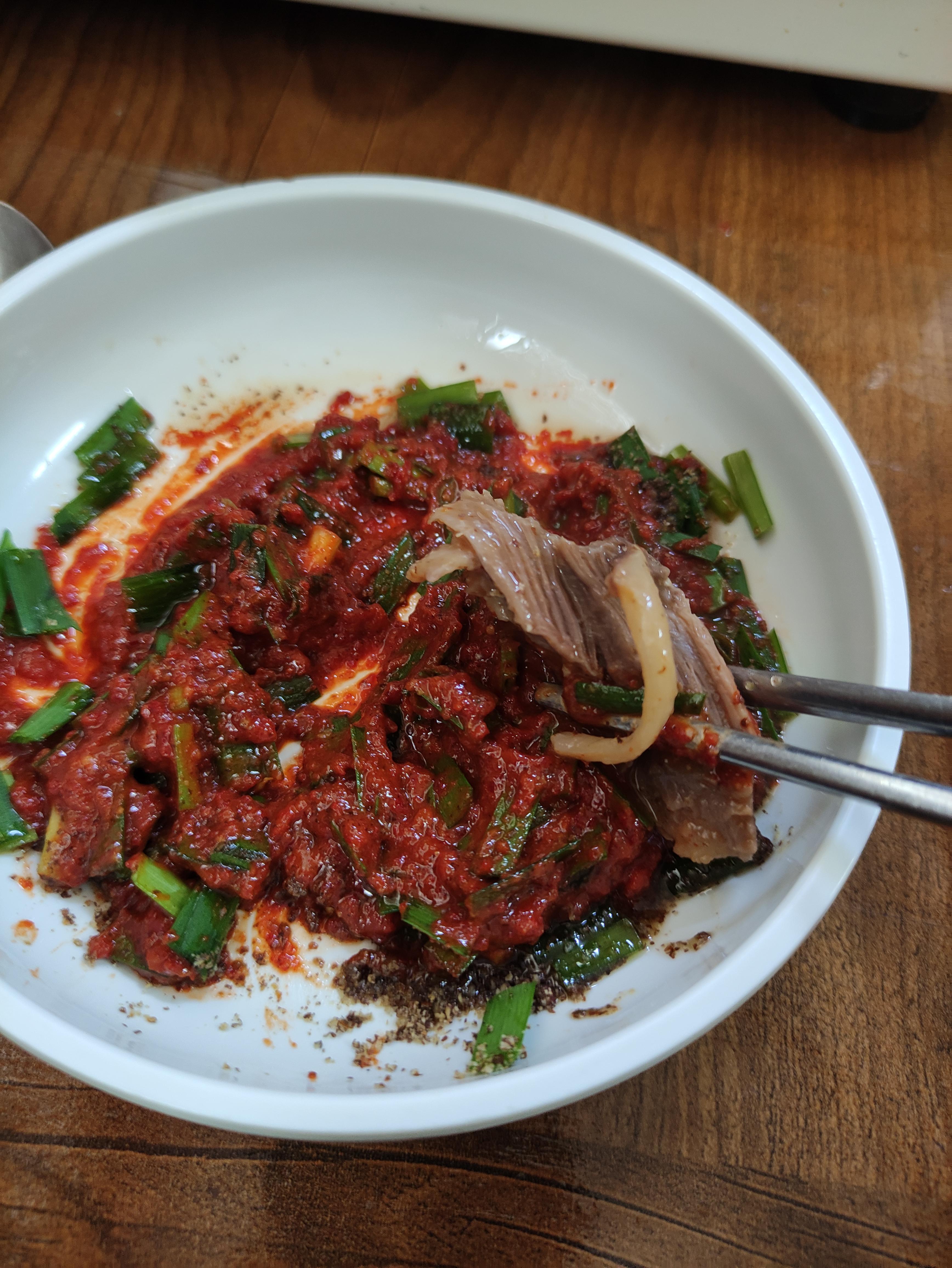 전골에 들어있은 흑염소고기용 소스에요 잘 섞어서 흑염소고기 찍어먹어봐요 ㅎㅎ 흑염소라고 딱히 잡내같은것은 없고요. 식감이부드러운데 돼지고기나 닭고기랑은 달라요.