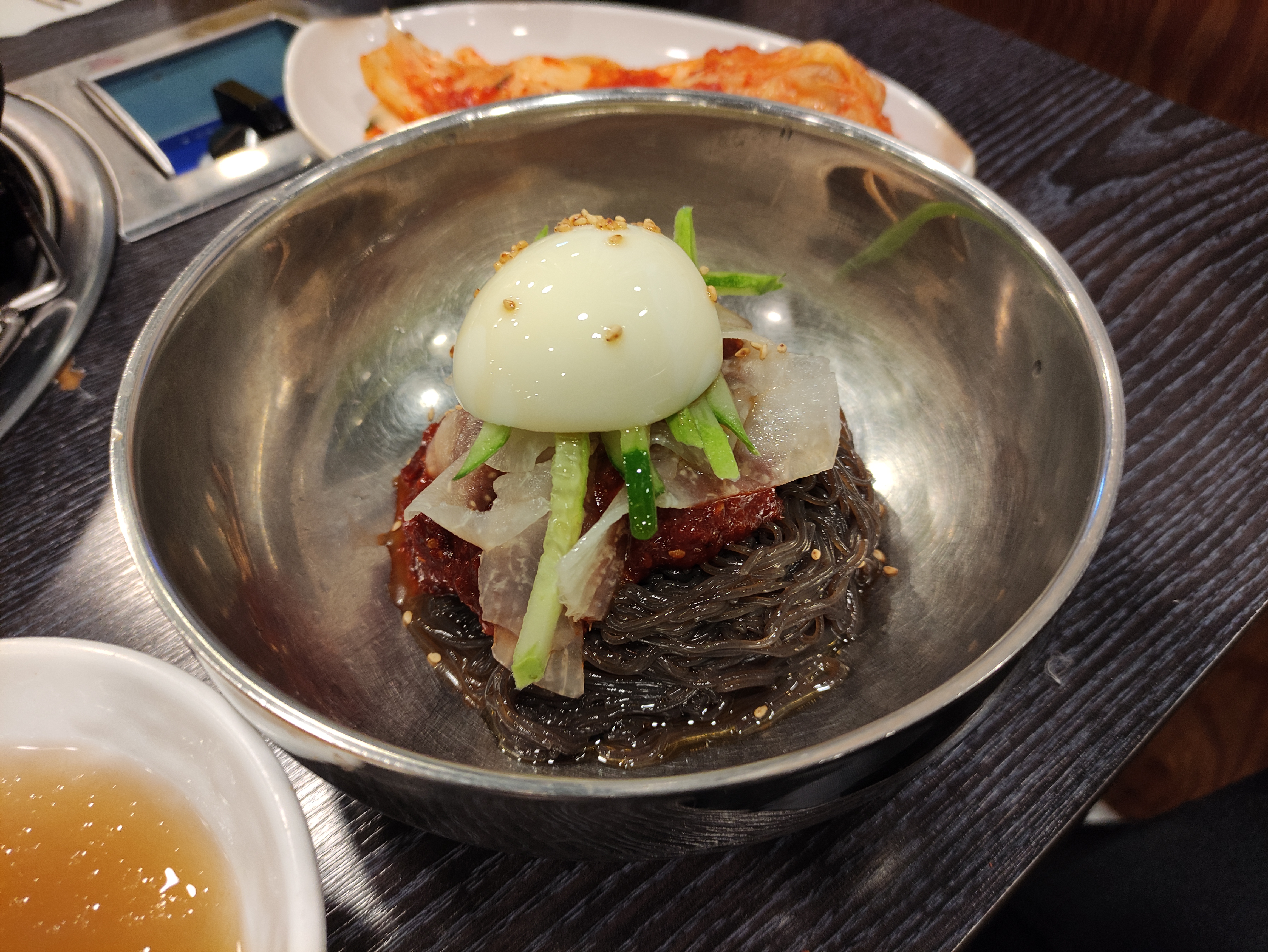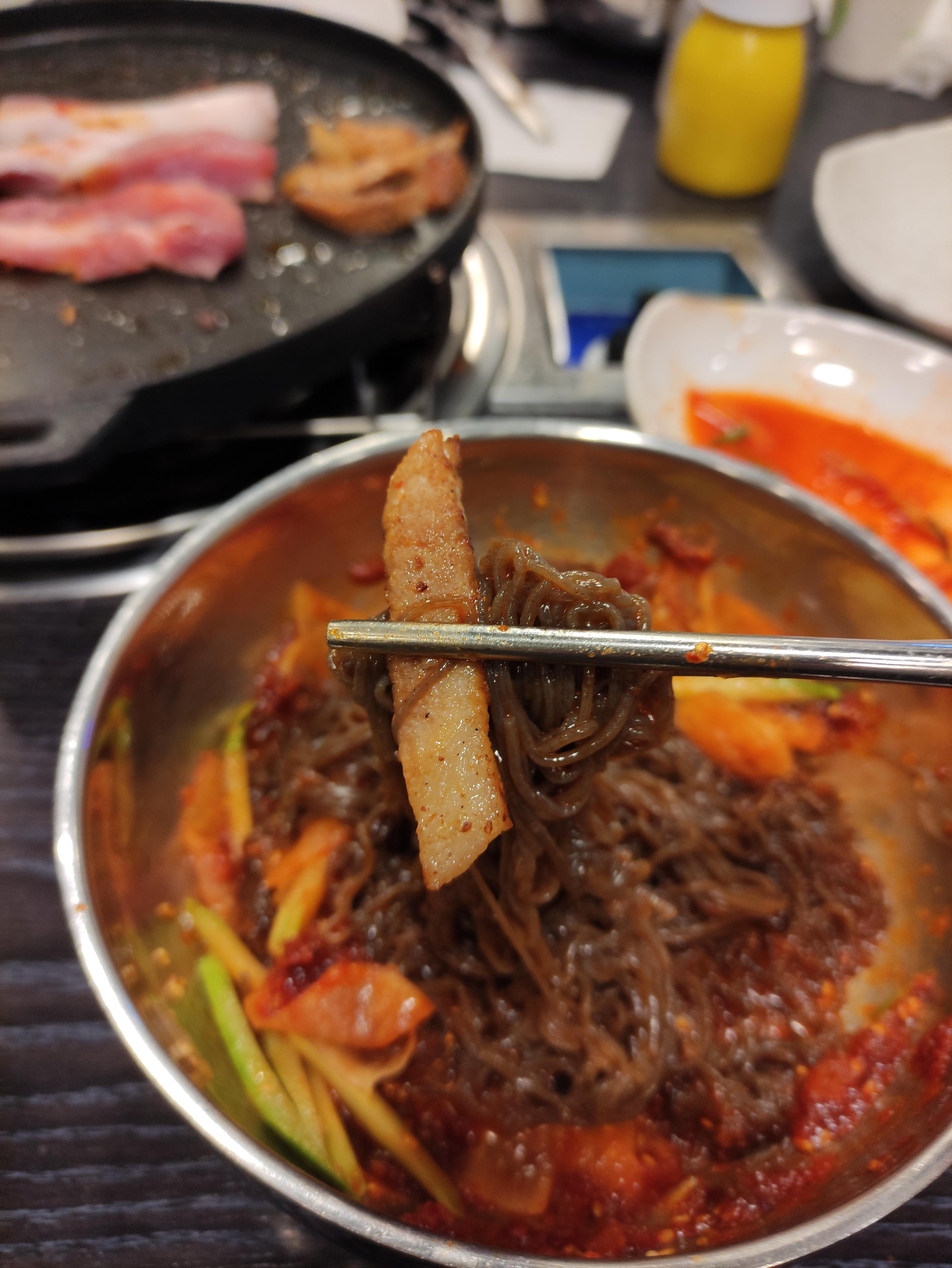 고기를 맛있게 구워봅니다. 굽다보니 냉면생각이나서 비빔냉면하나 물냉면하나 이렇게 추가주문했어요. 공기밥도 한그릇주문 ㅎ