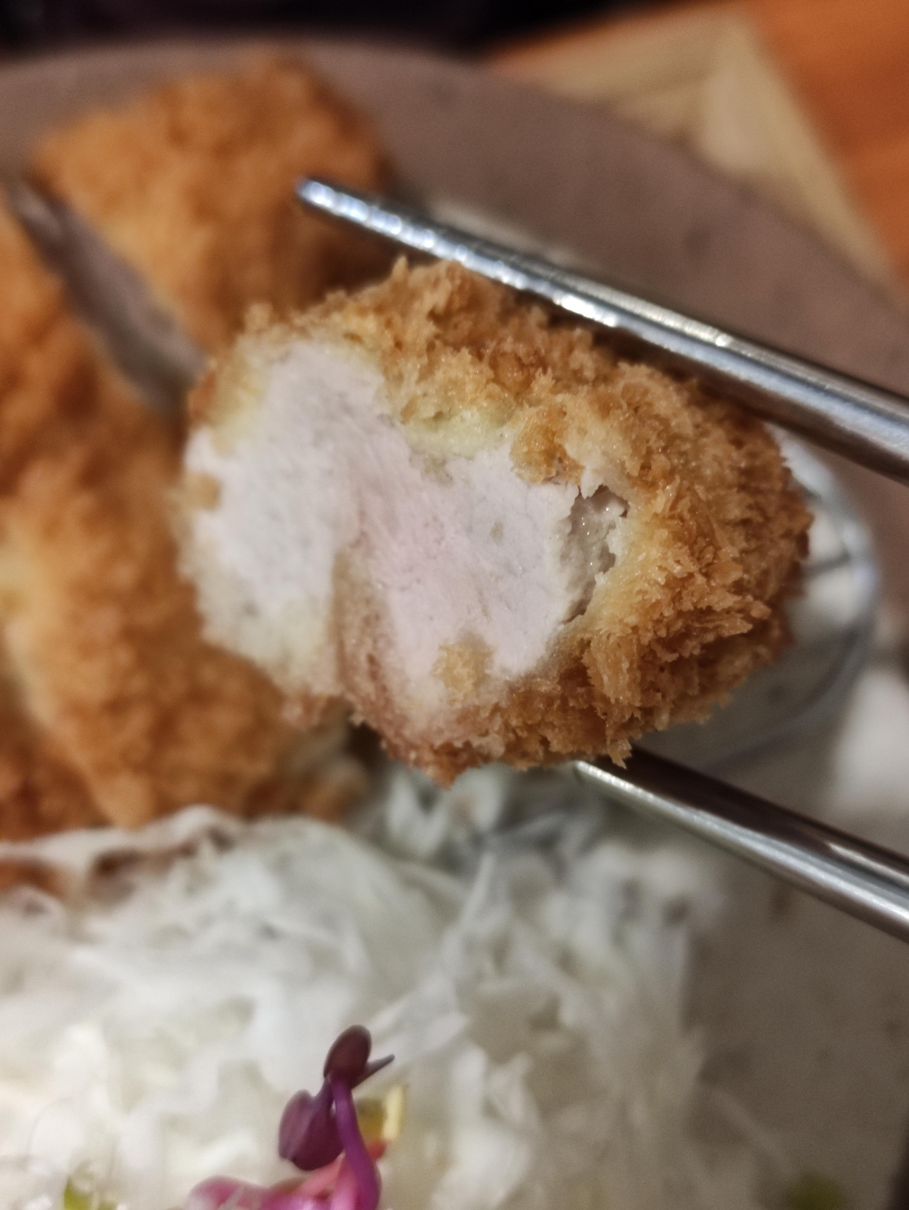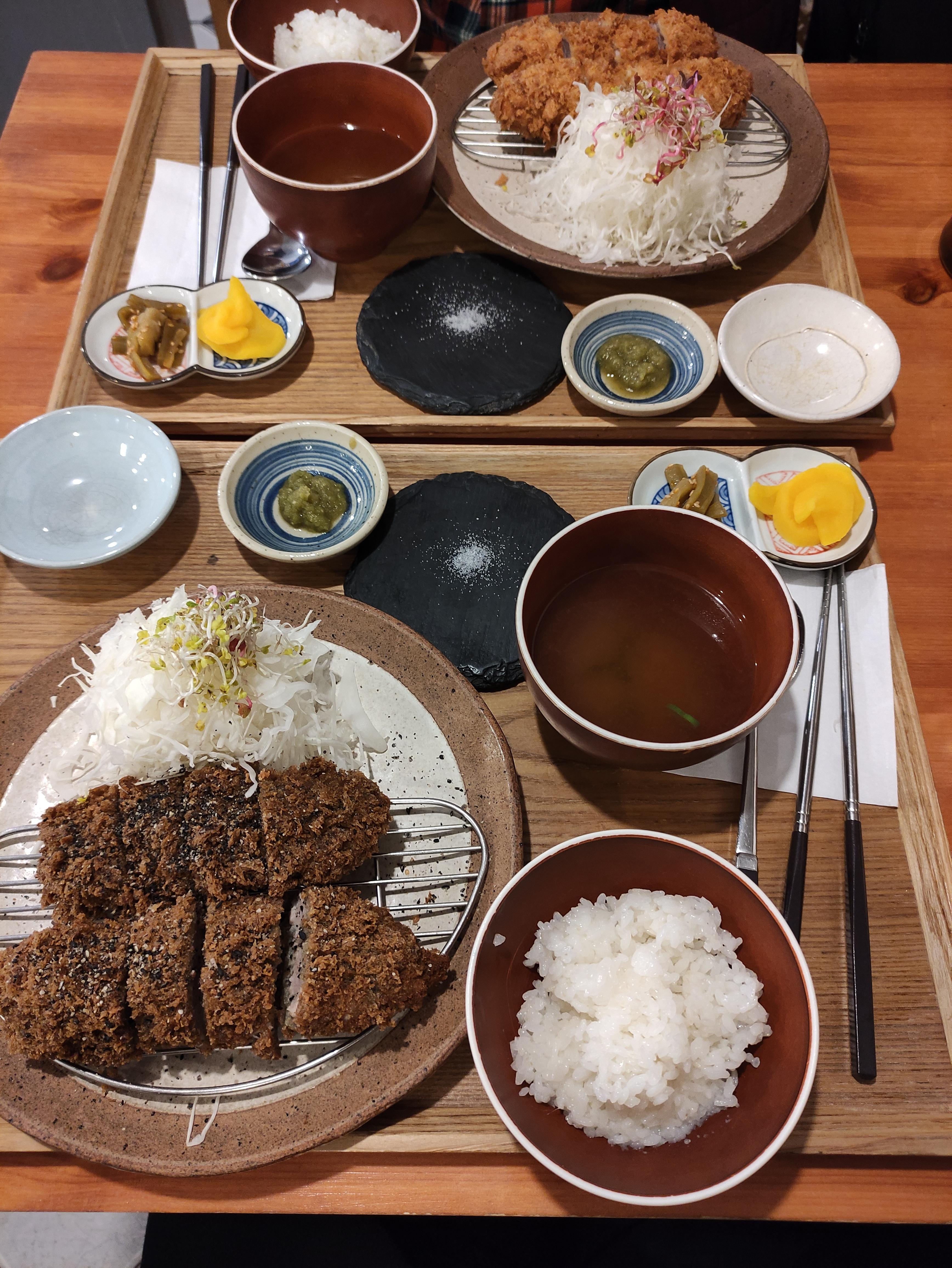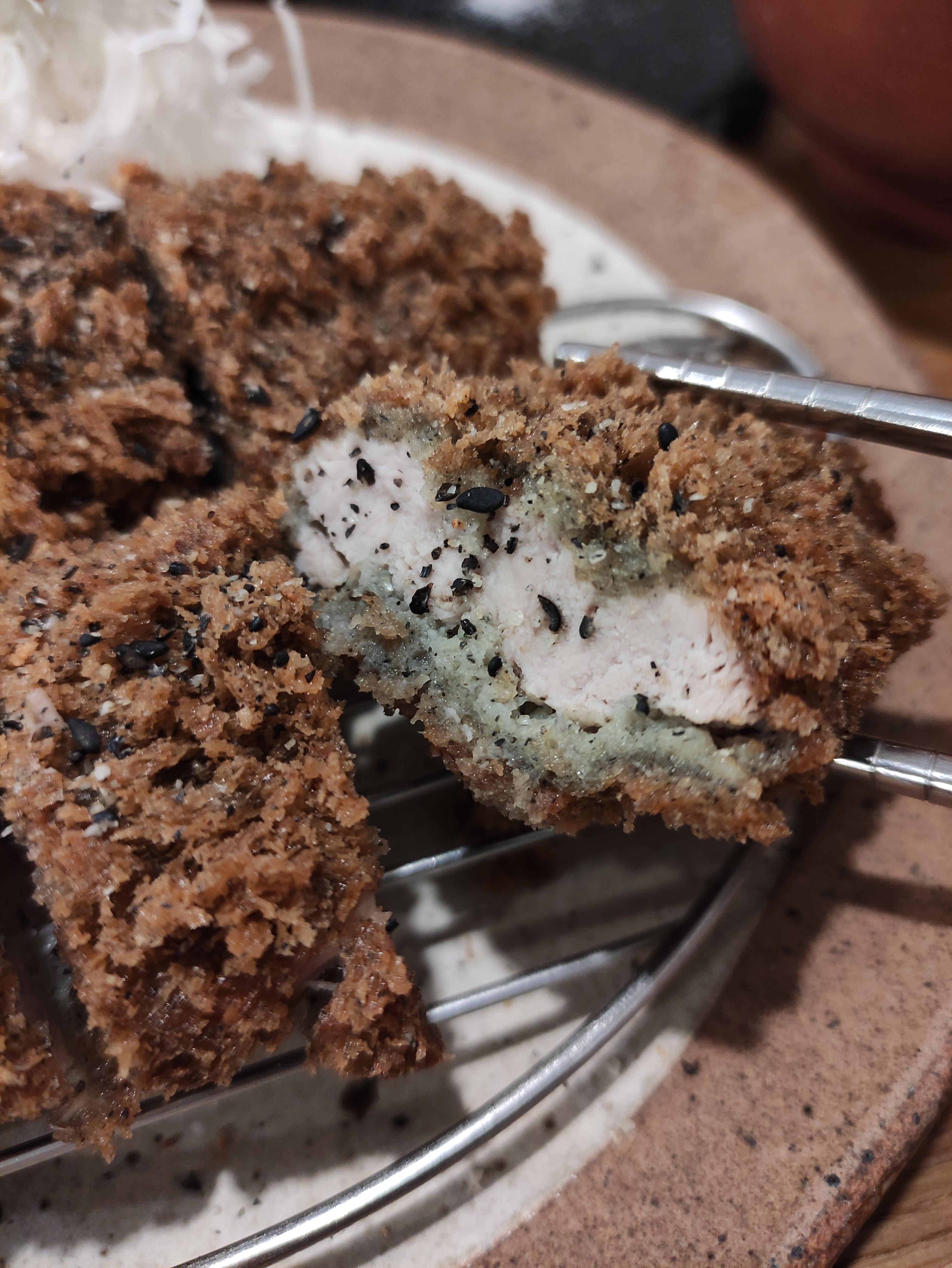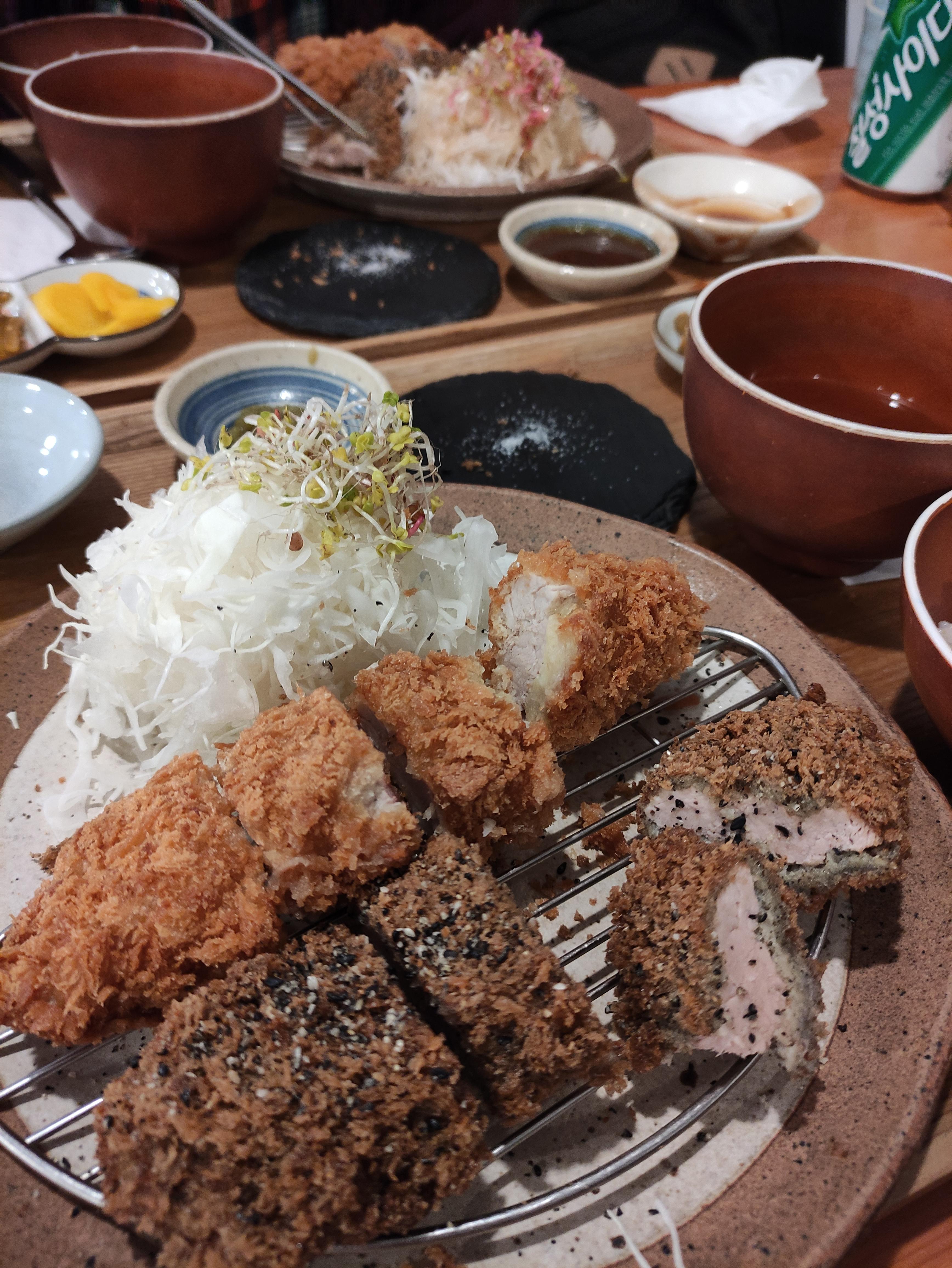 흑카츠와 안심카츠에요. 흑카츠도 독특하고 안심카츠도 넘 맛있어보여요. 단면을보니 튀김은바삭 속은촉촉느낌 제대로에요. 겉바속촉굿