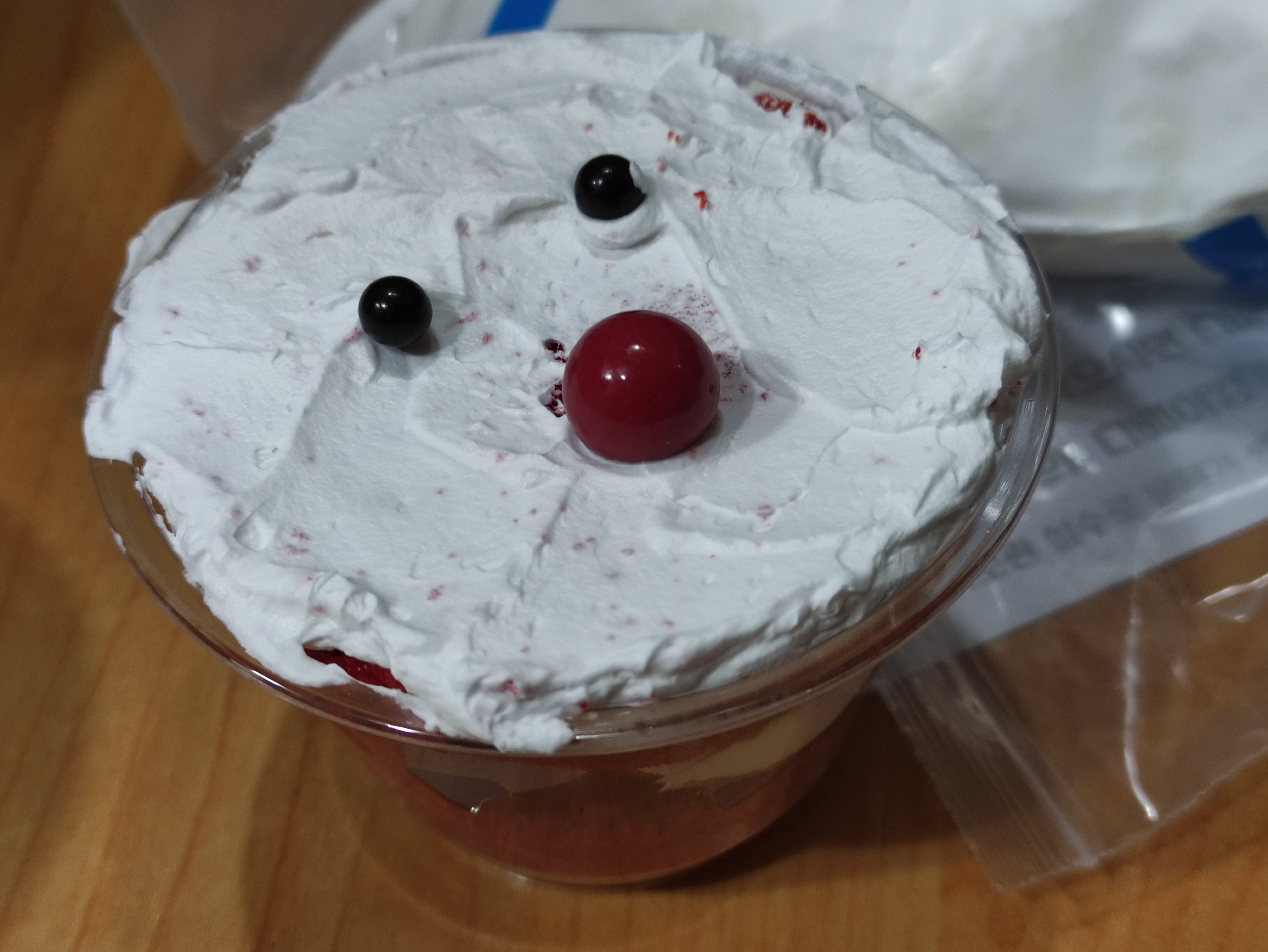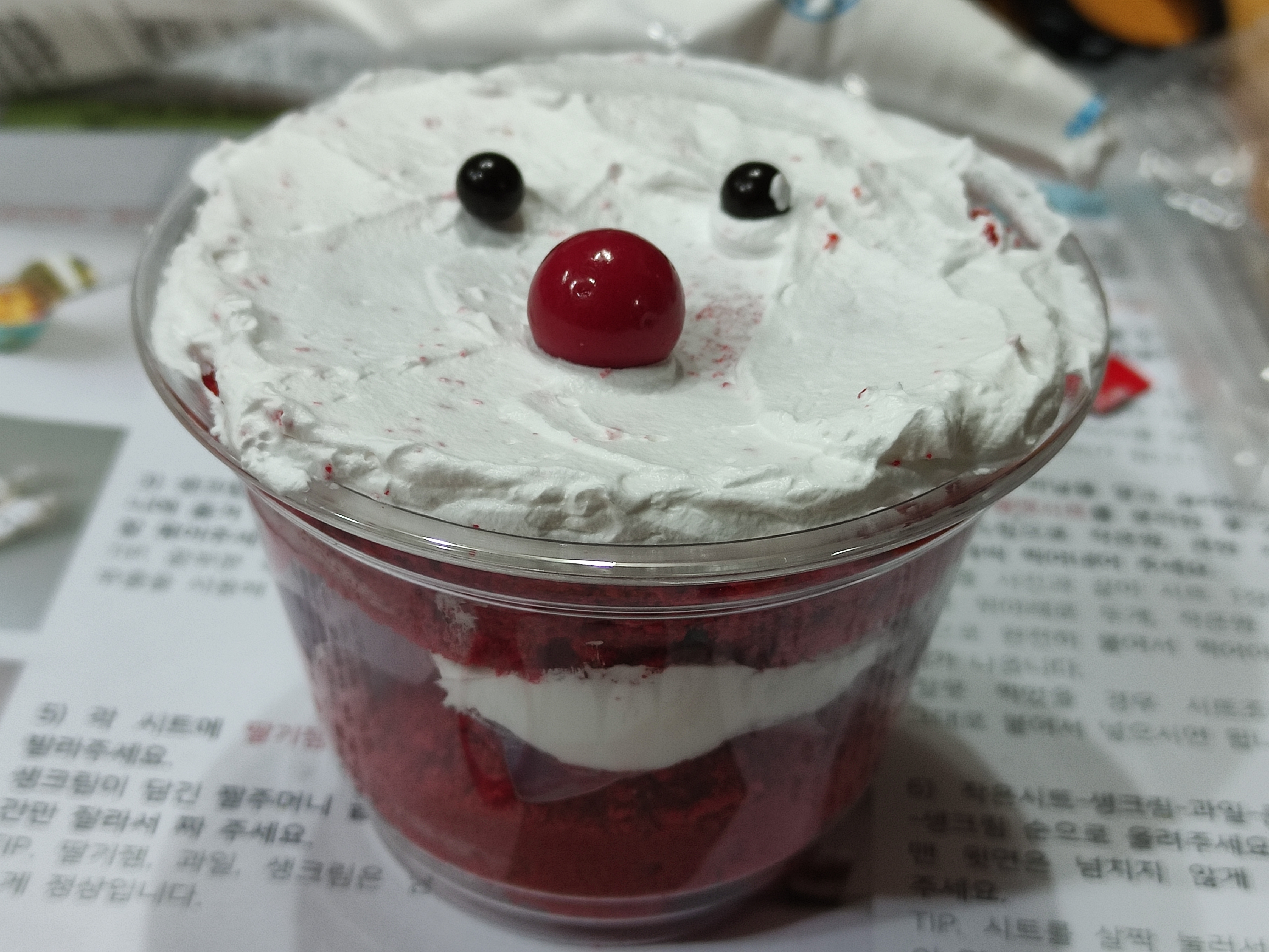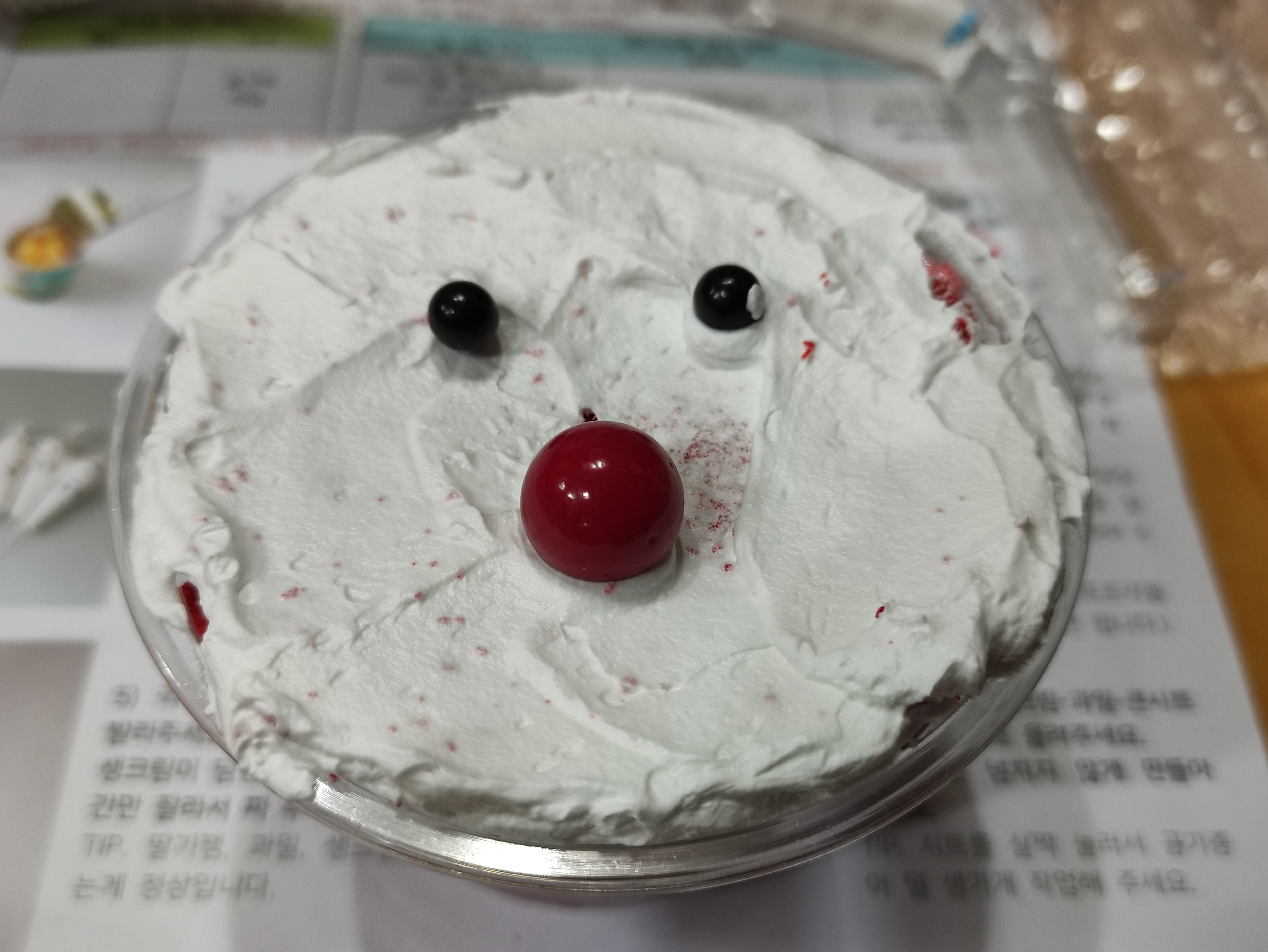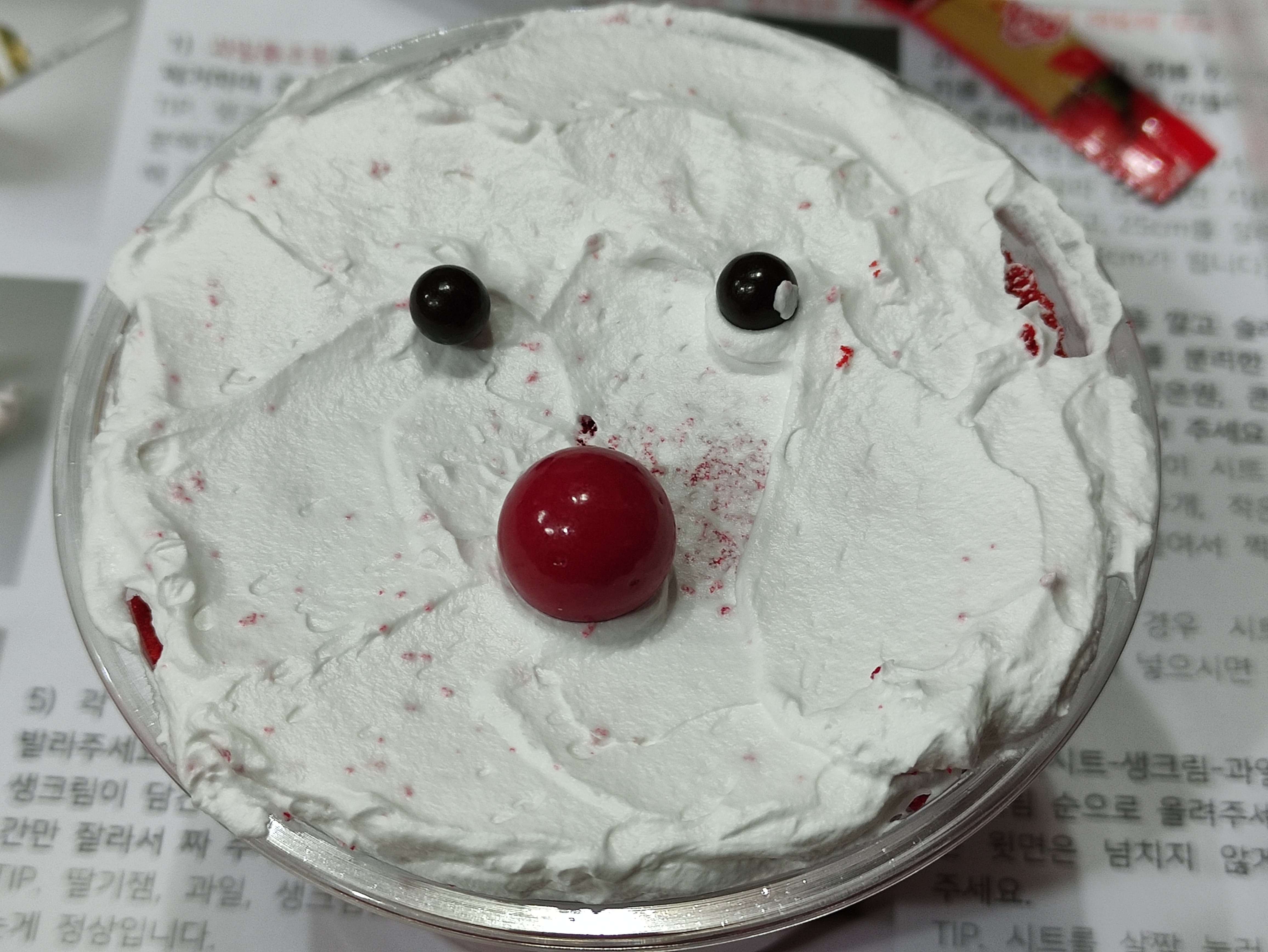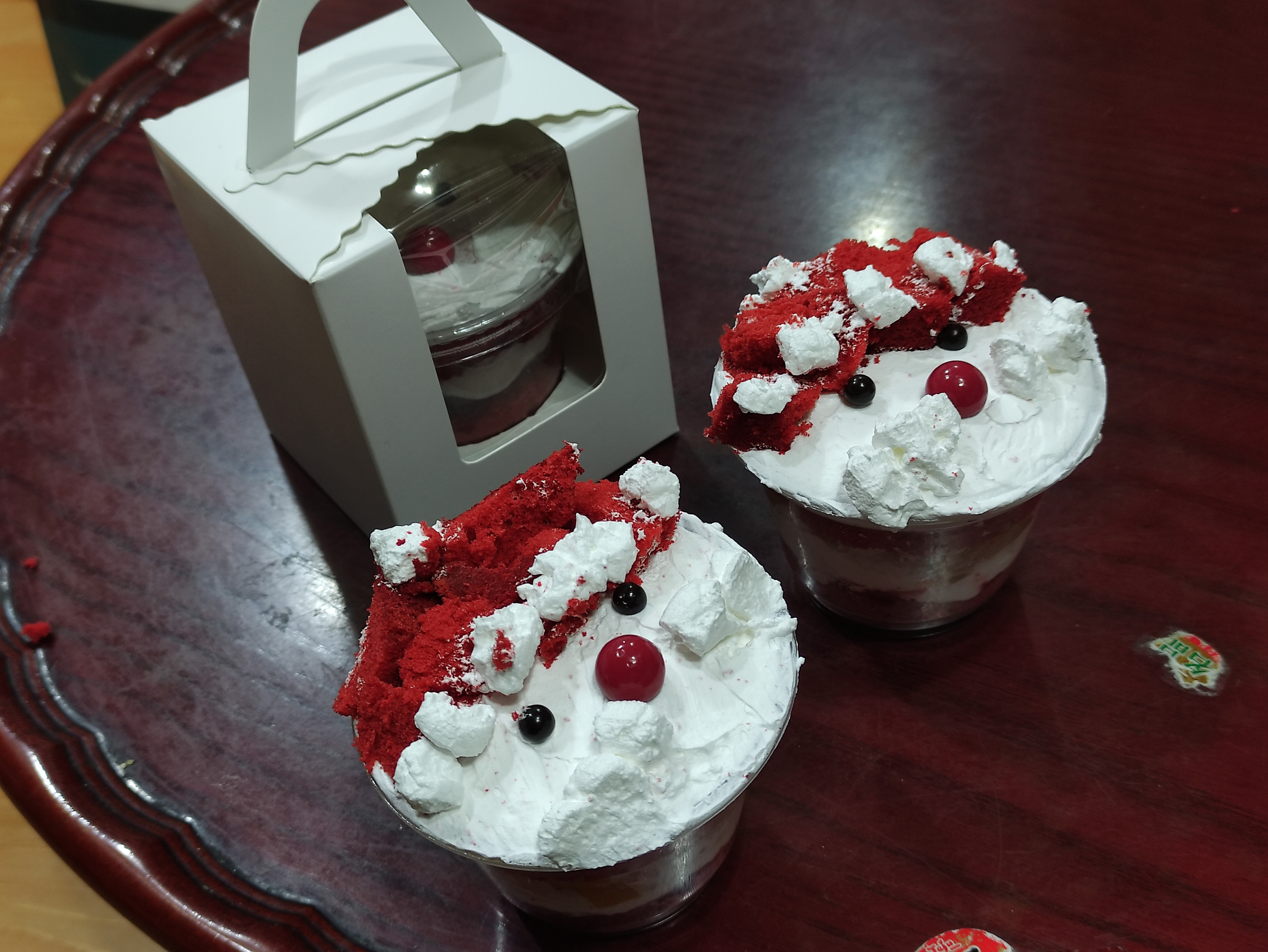두개 더 만듭니다. 케익시트를 잘게 찢어서 모자모양을 만들고 생크림으로 수염도 만드니 더 보기가 좋네요.
