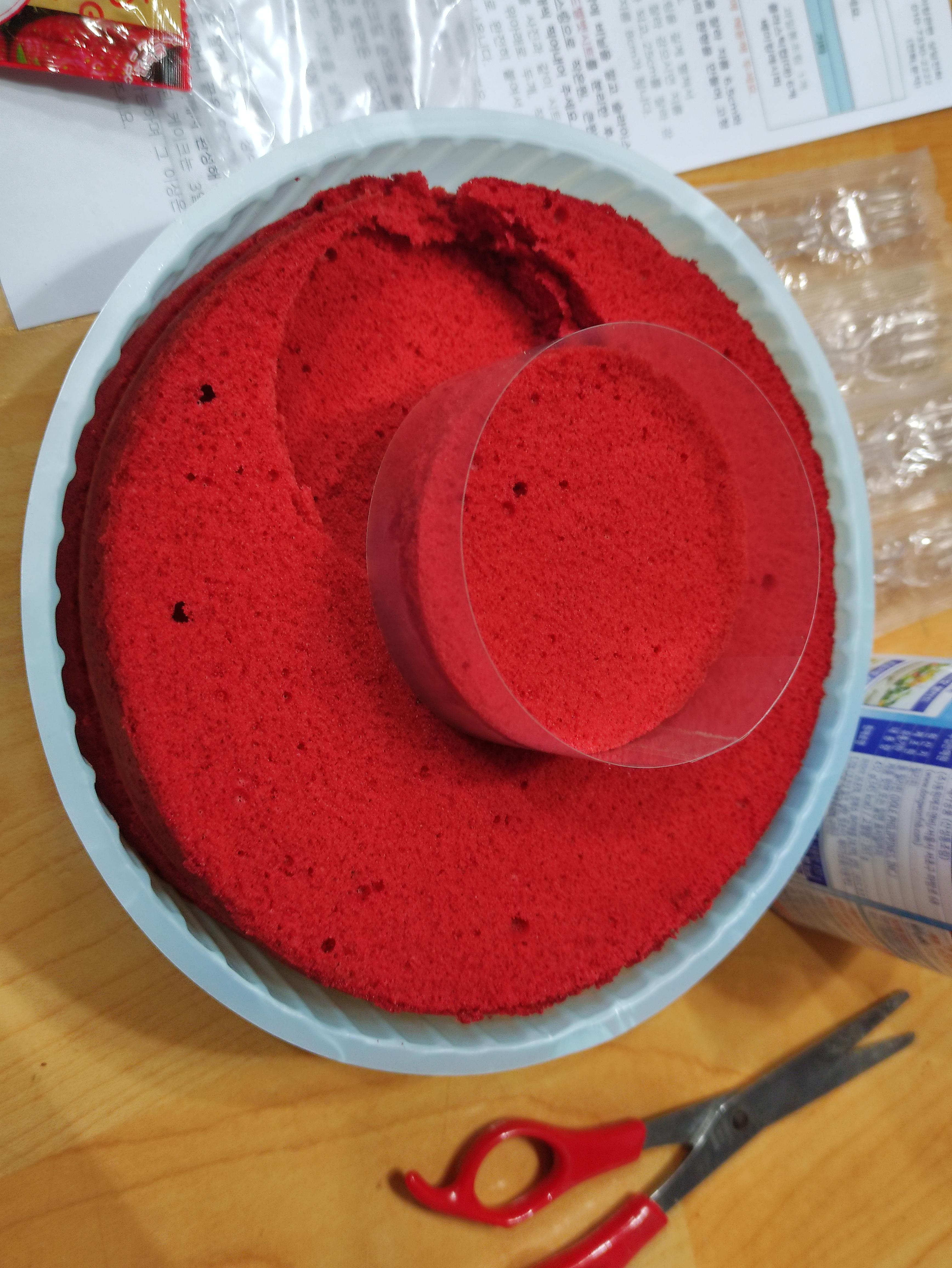 케이크 시트는 냉동보관해두었다가 만들기 1시간전에 꺼내놓았고요. 생크림도 냉동보관했다가 해동시켜놓습니다. 저는 택배가 온 다음날 만들어서 따로 얼리지 않고 김치냉장고에 보관해놓았다 꺼냈어요. 하루정도 보관이면 김치냉장고도 좋아요.