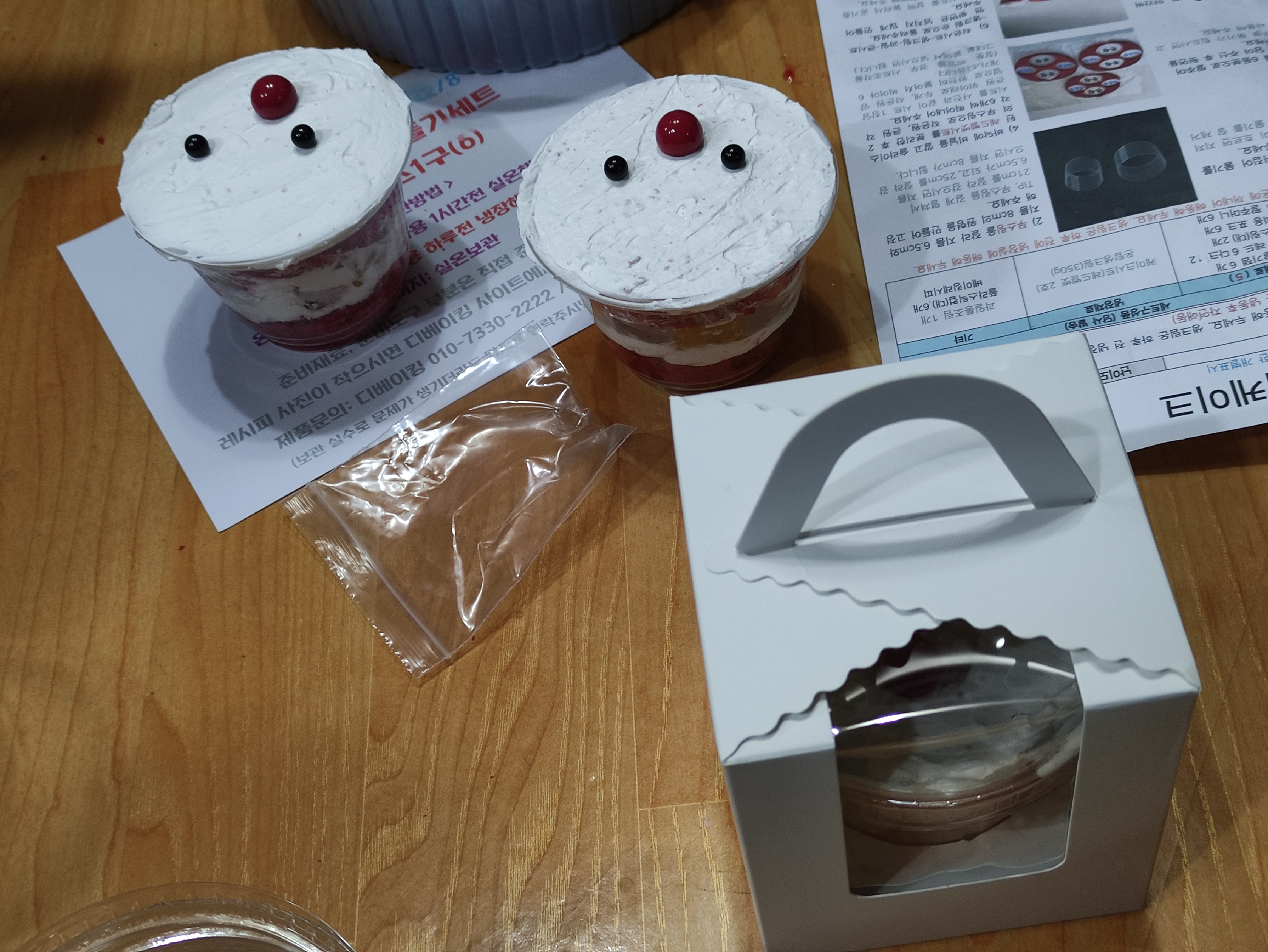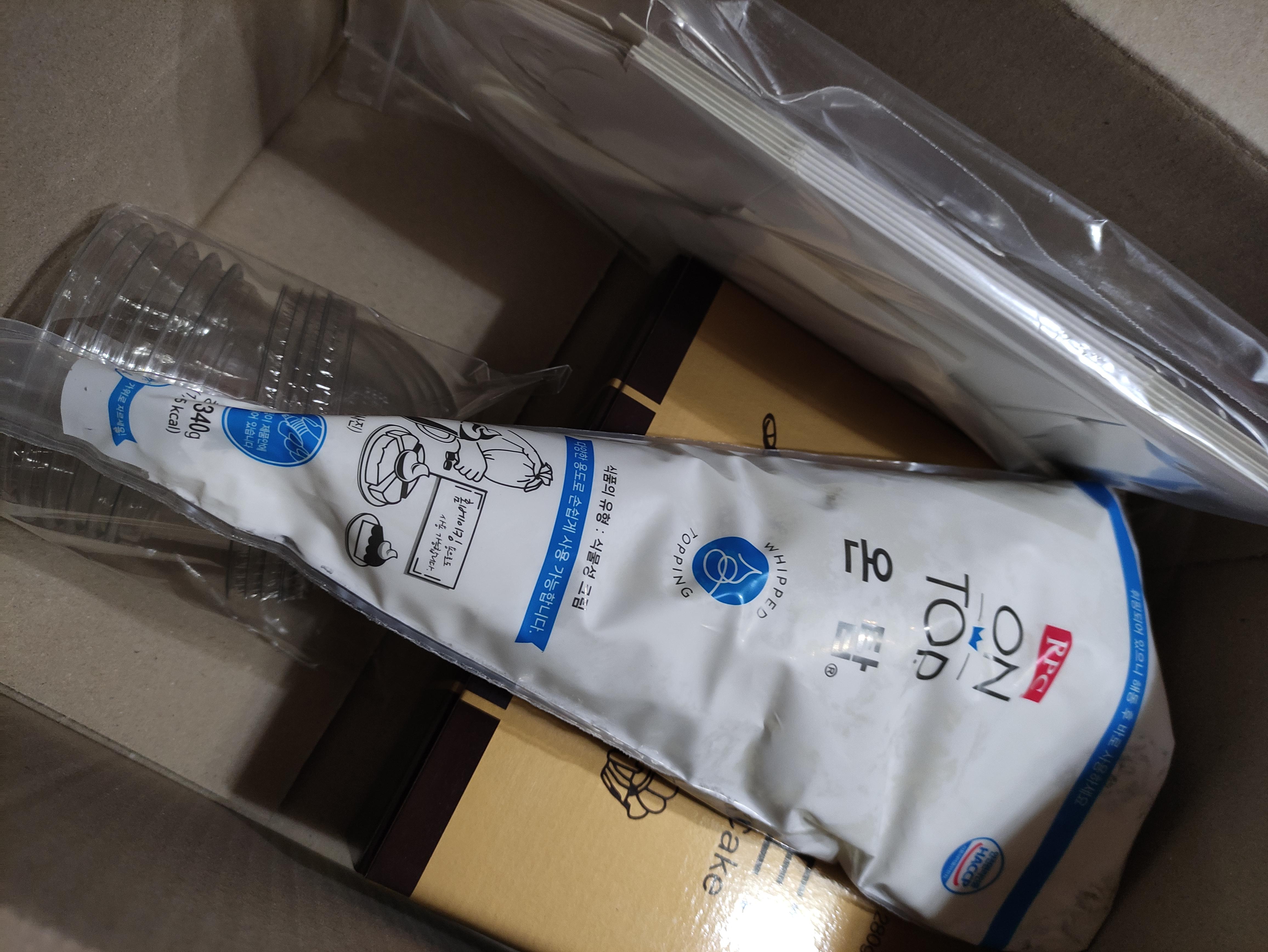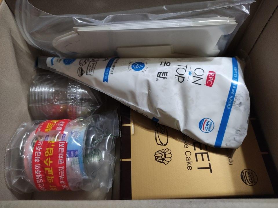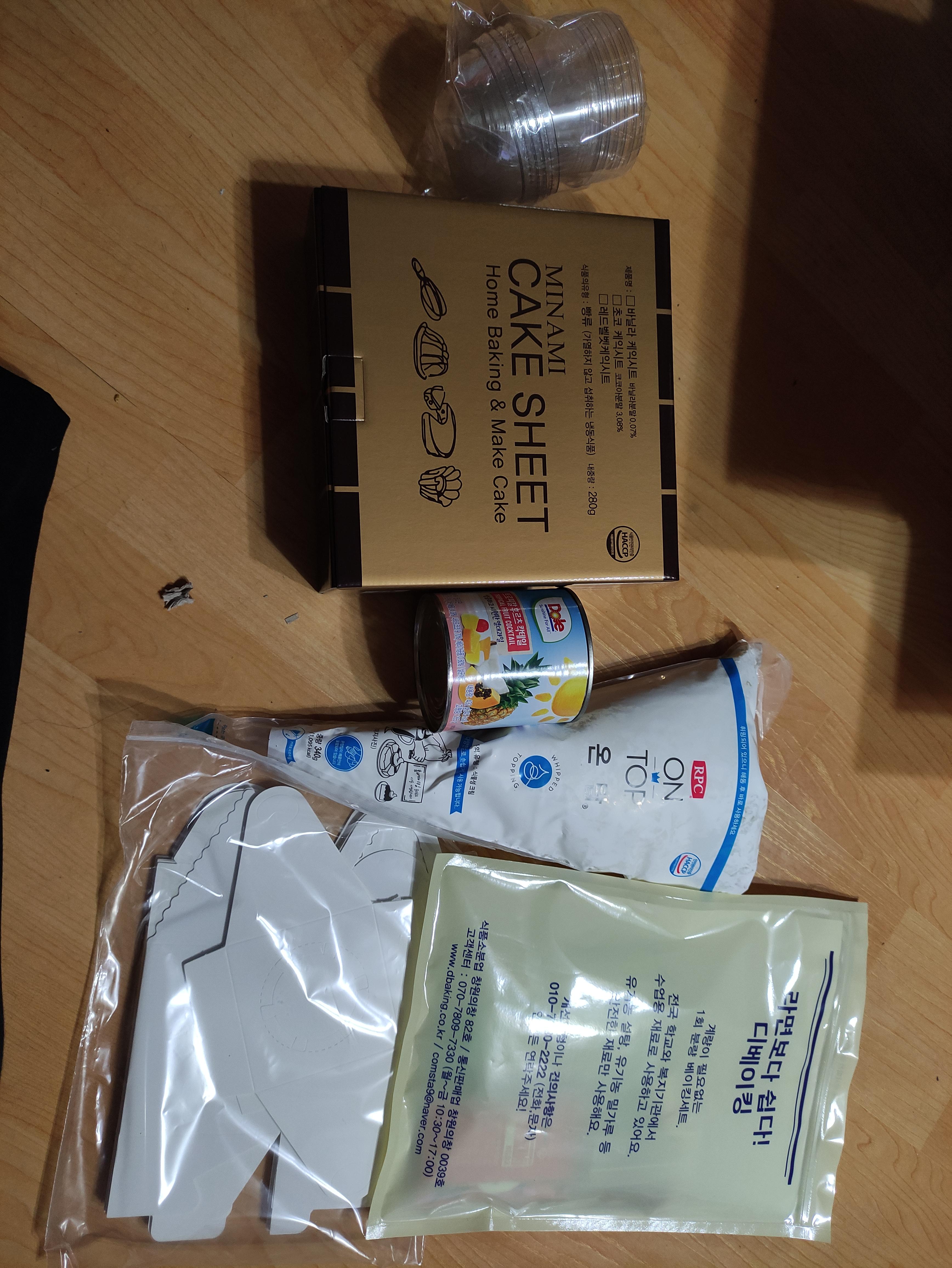 케이크 시트과 생크림, 그리고 케익컵과 포장상자까지 알차게 들어있어요.