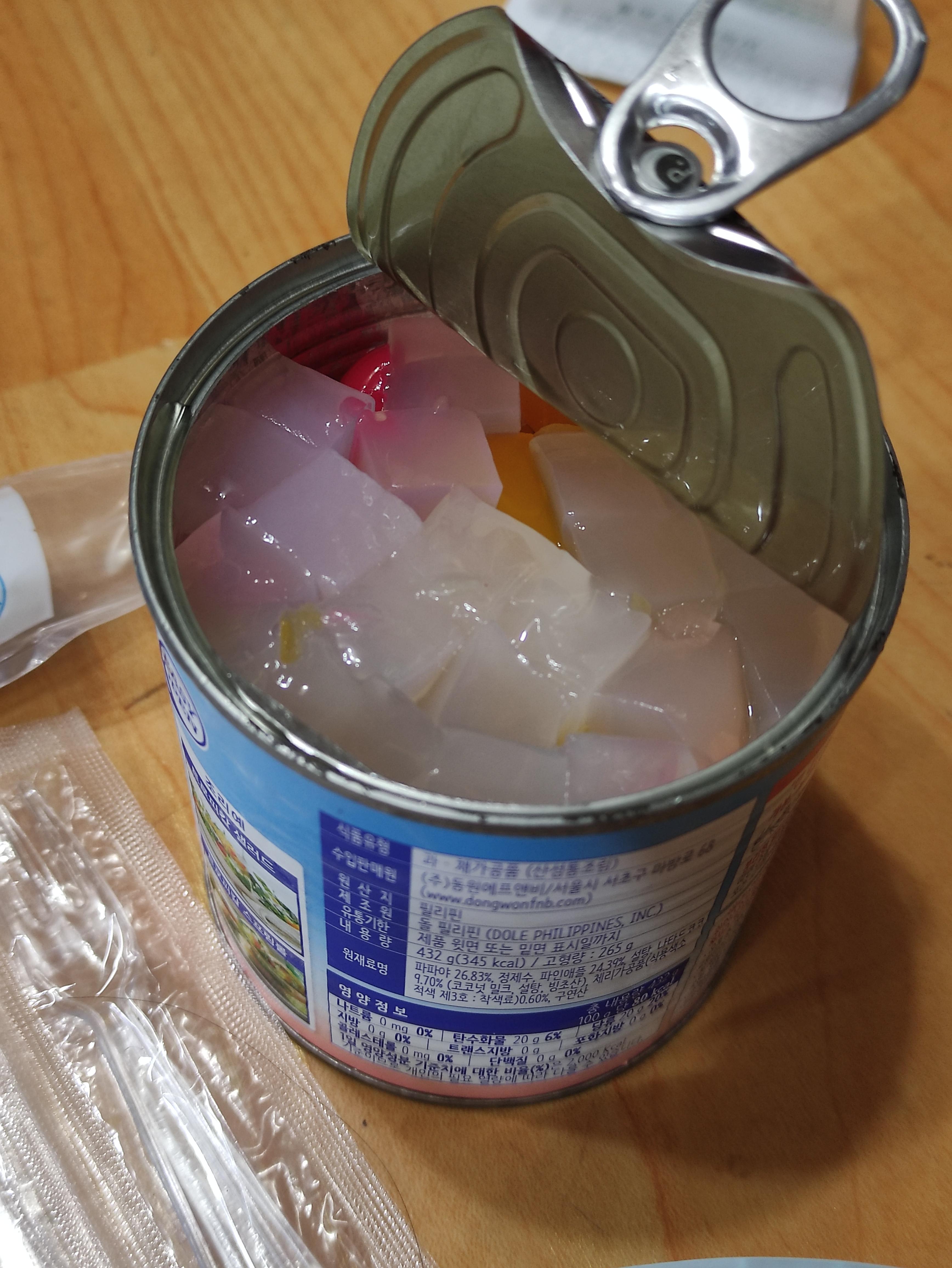 우선 과일통조림을 열고, 그 안에 물을 따라서 과일만 남겨놓습니다.