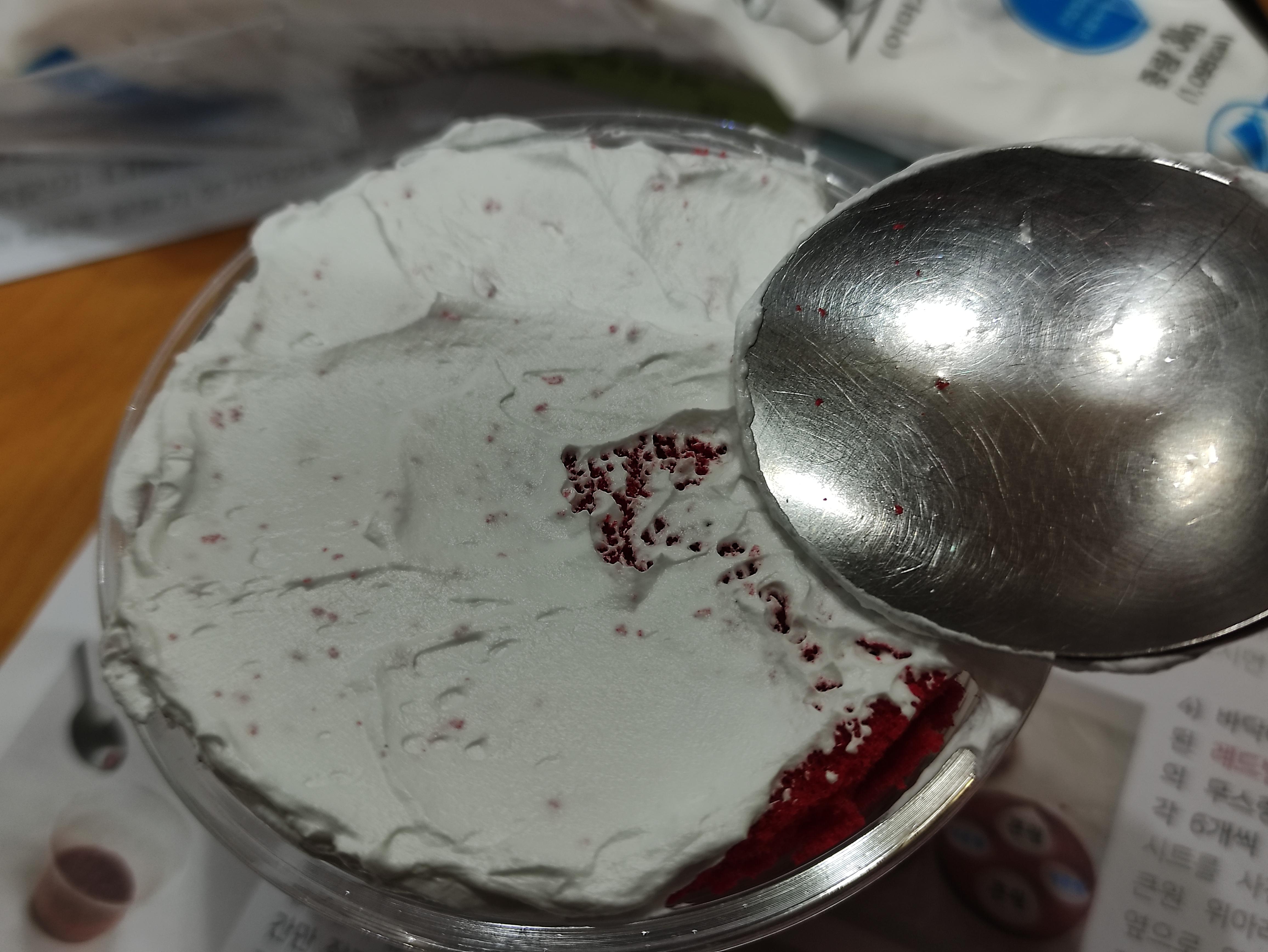 시트로 덮고나서 그 위에 생크림을 올리고 수저로 얇고 넓게 펴바릅니다.