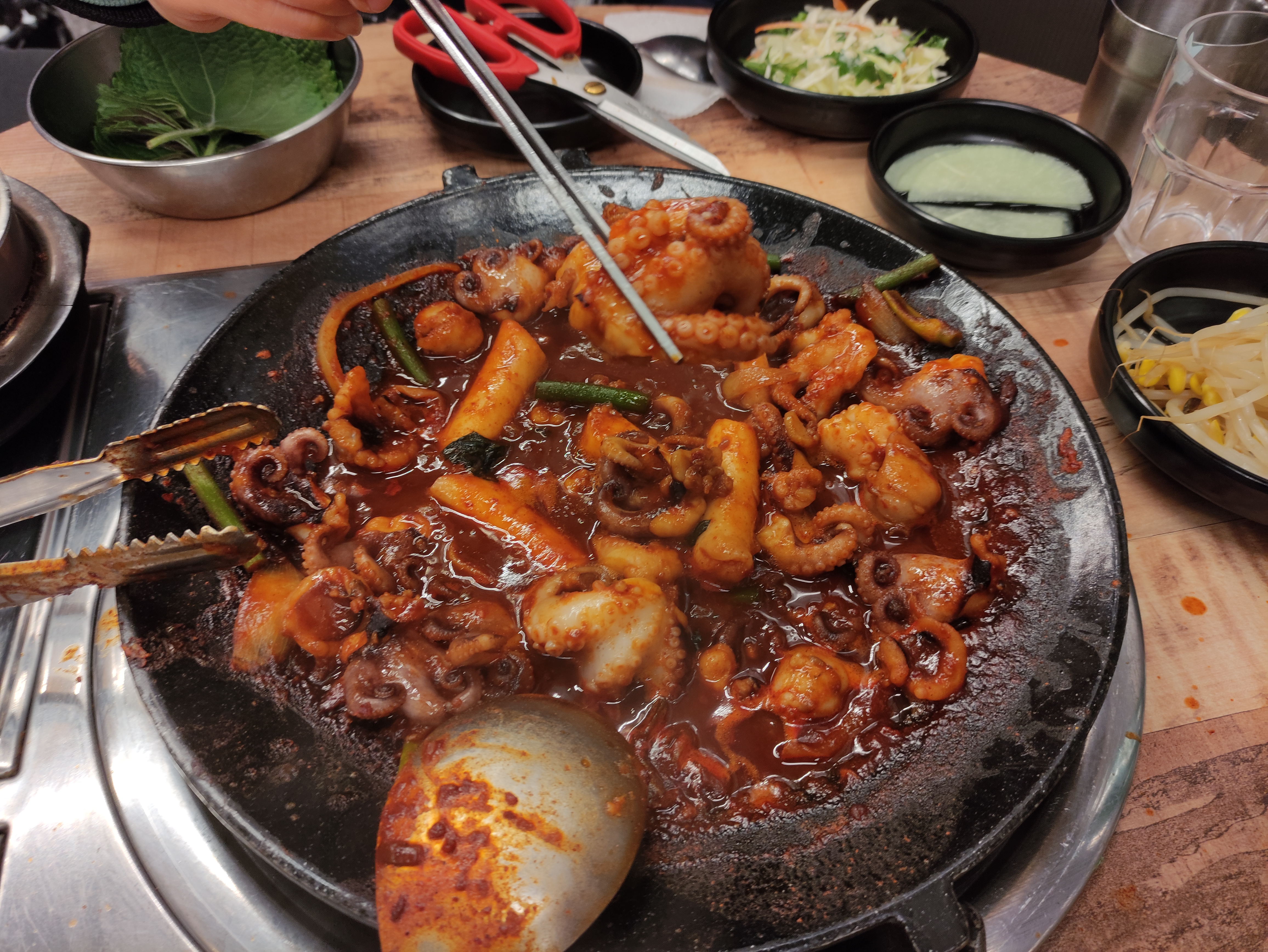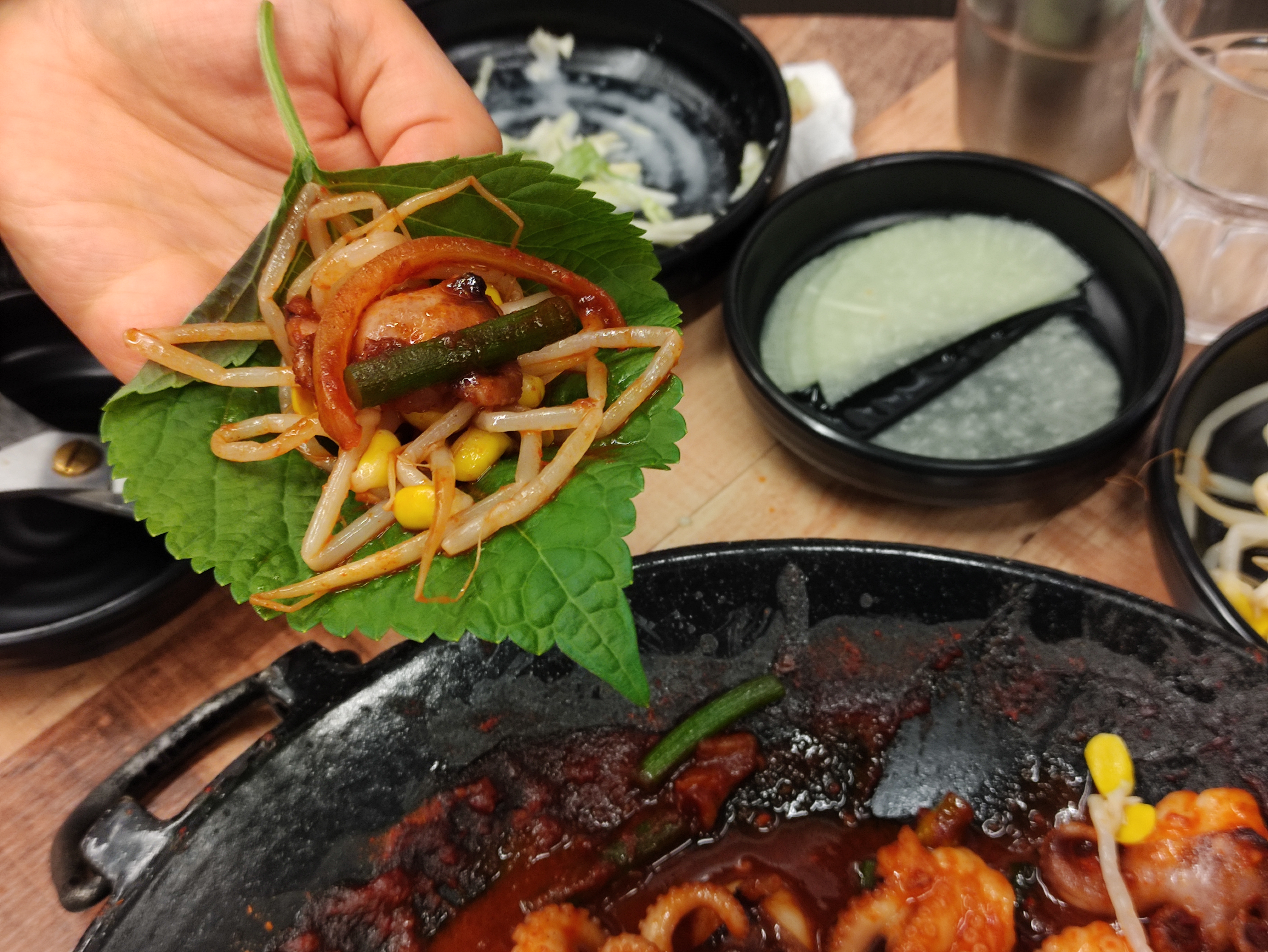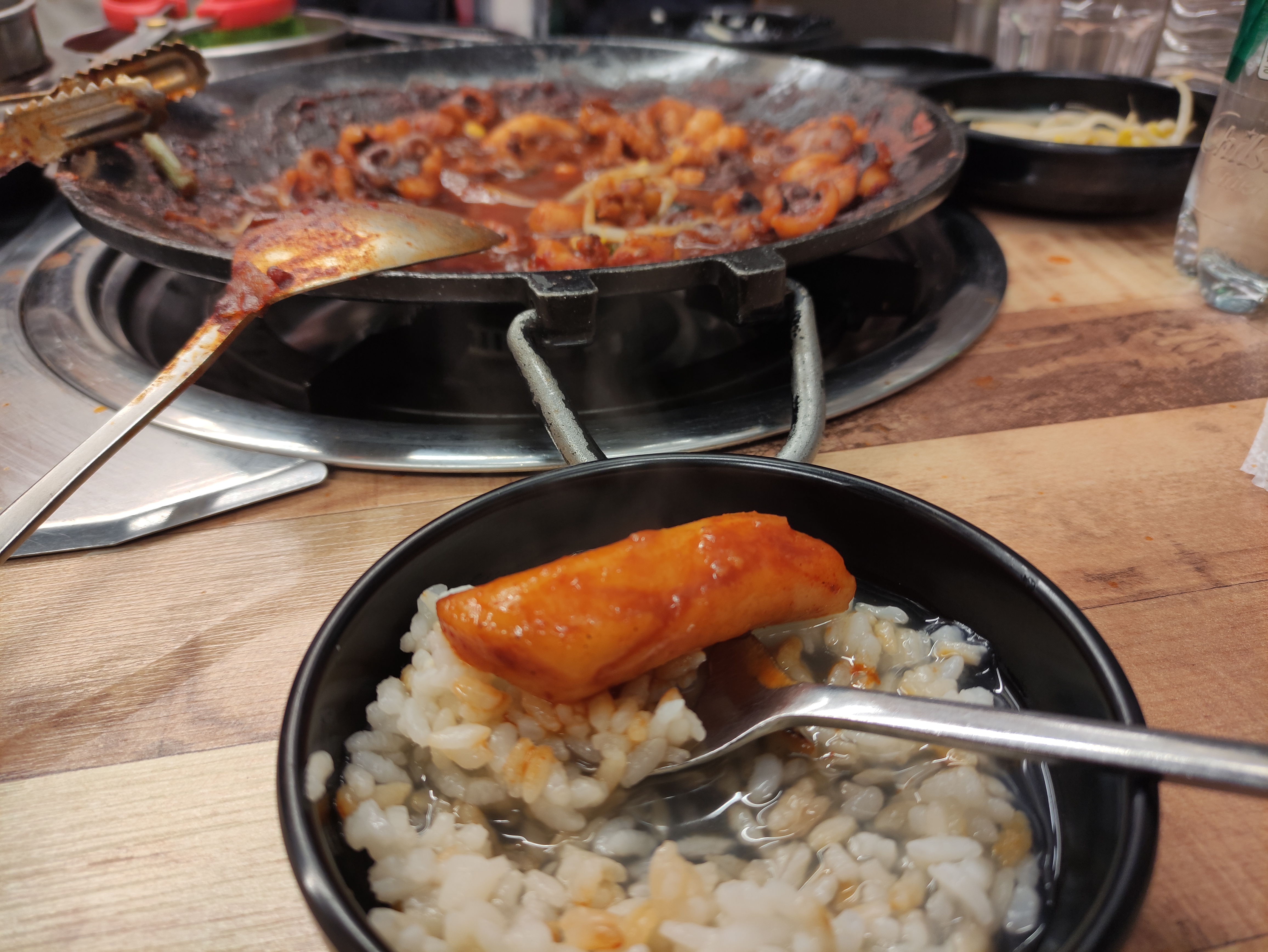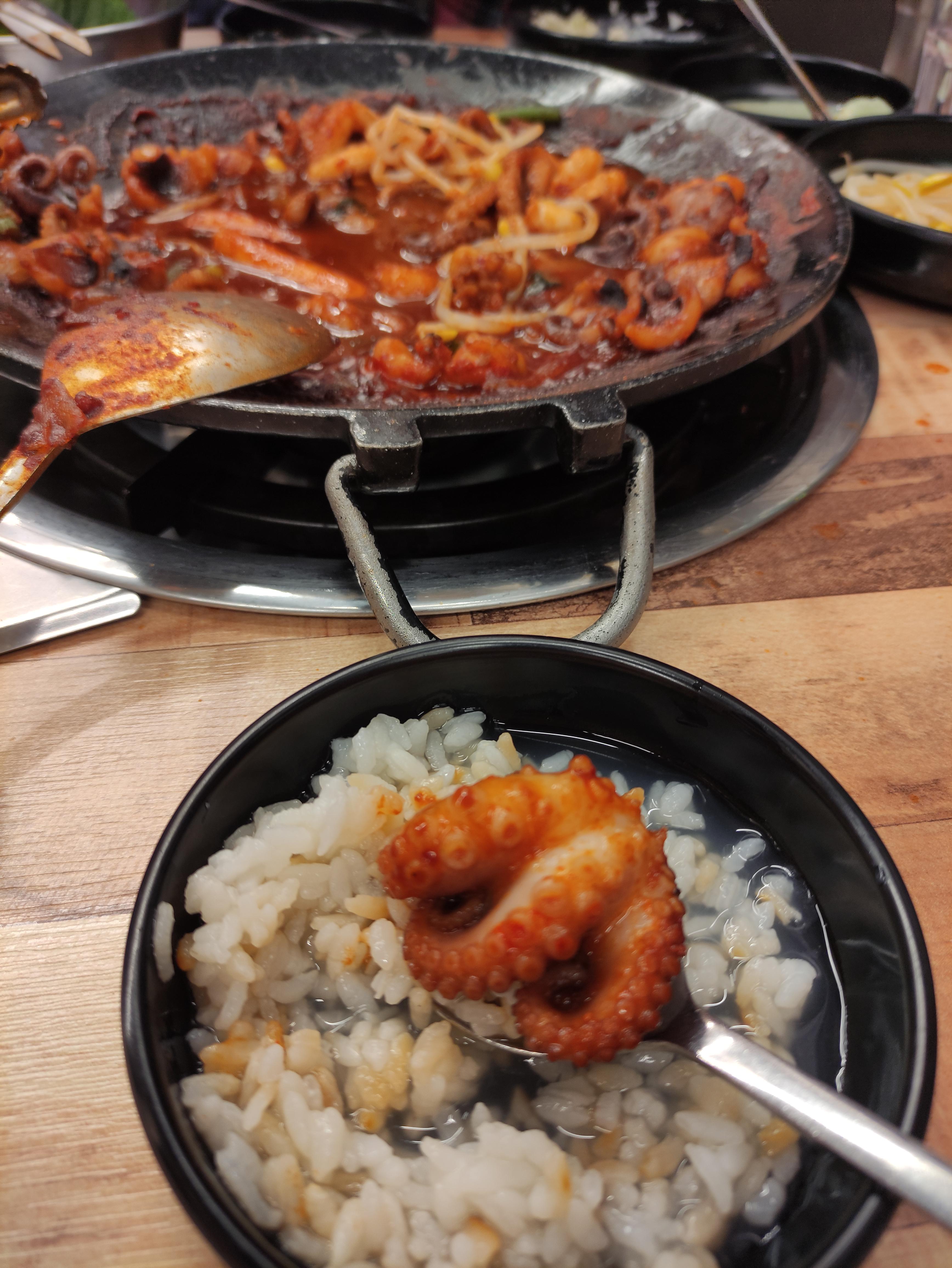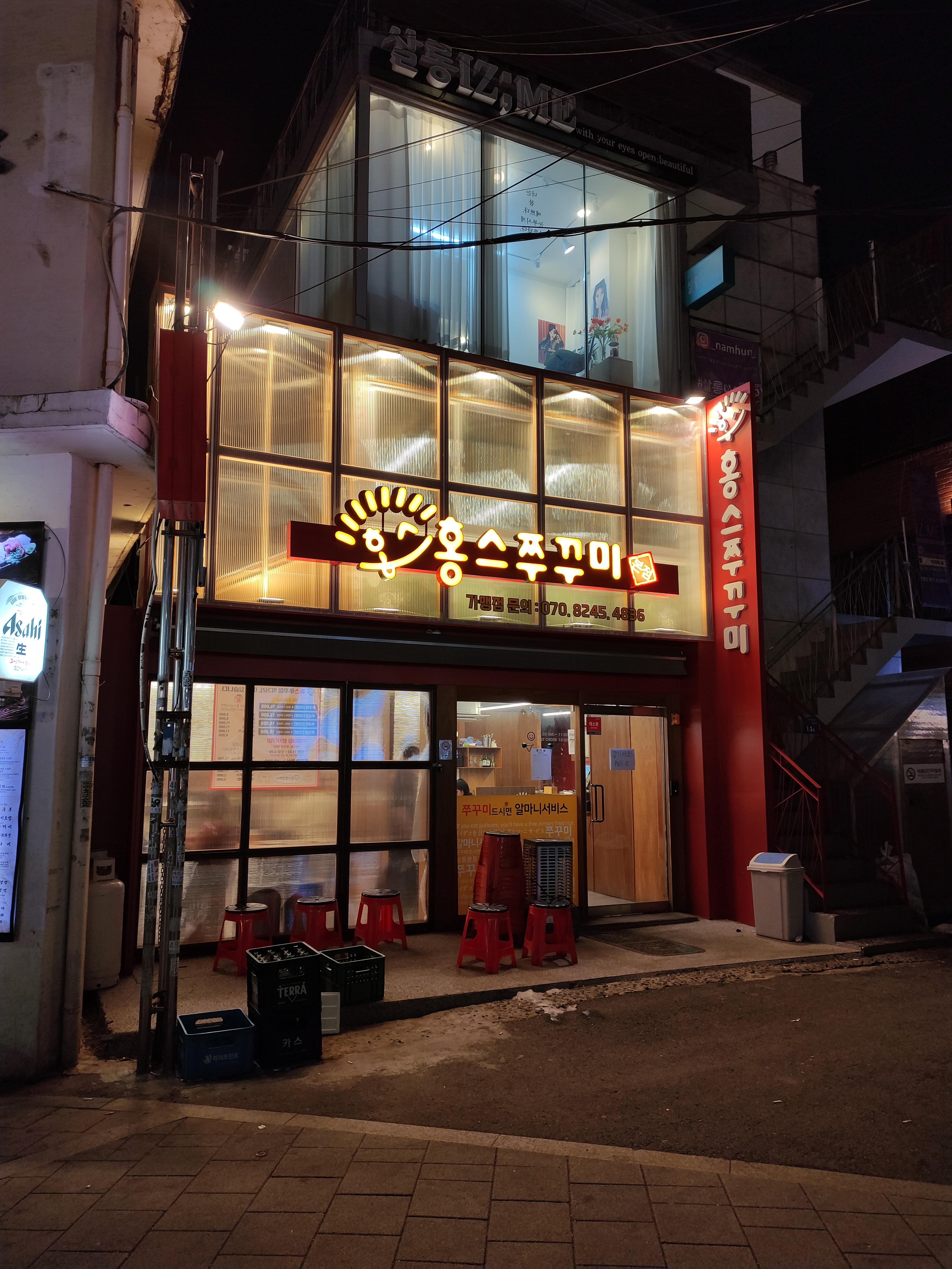맛은 다소 맵지만, 누룽지를 같이 주기때문에 맵찔이인 저도 맛있게 먹었습니다. 그리고 콩나물도 넣어 먹으면 매운맛이 중화되고 좋아요. 쭈꾸미와 양념 등이 나와서 조리해서 먹는 방식입니다. 쭈꾸미 살이 통통하고요. 식감이 쫄깃해서 참 좋네요. 매운맛 좋아하시는 분들도 좋아할 수 있게 맛있게 맵습니다. 홍대거리에 위치해 있어서 젊은 분들이 많이 찾고요. 아까 적은대로 외국인도 종종 옵니다.