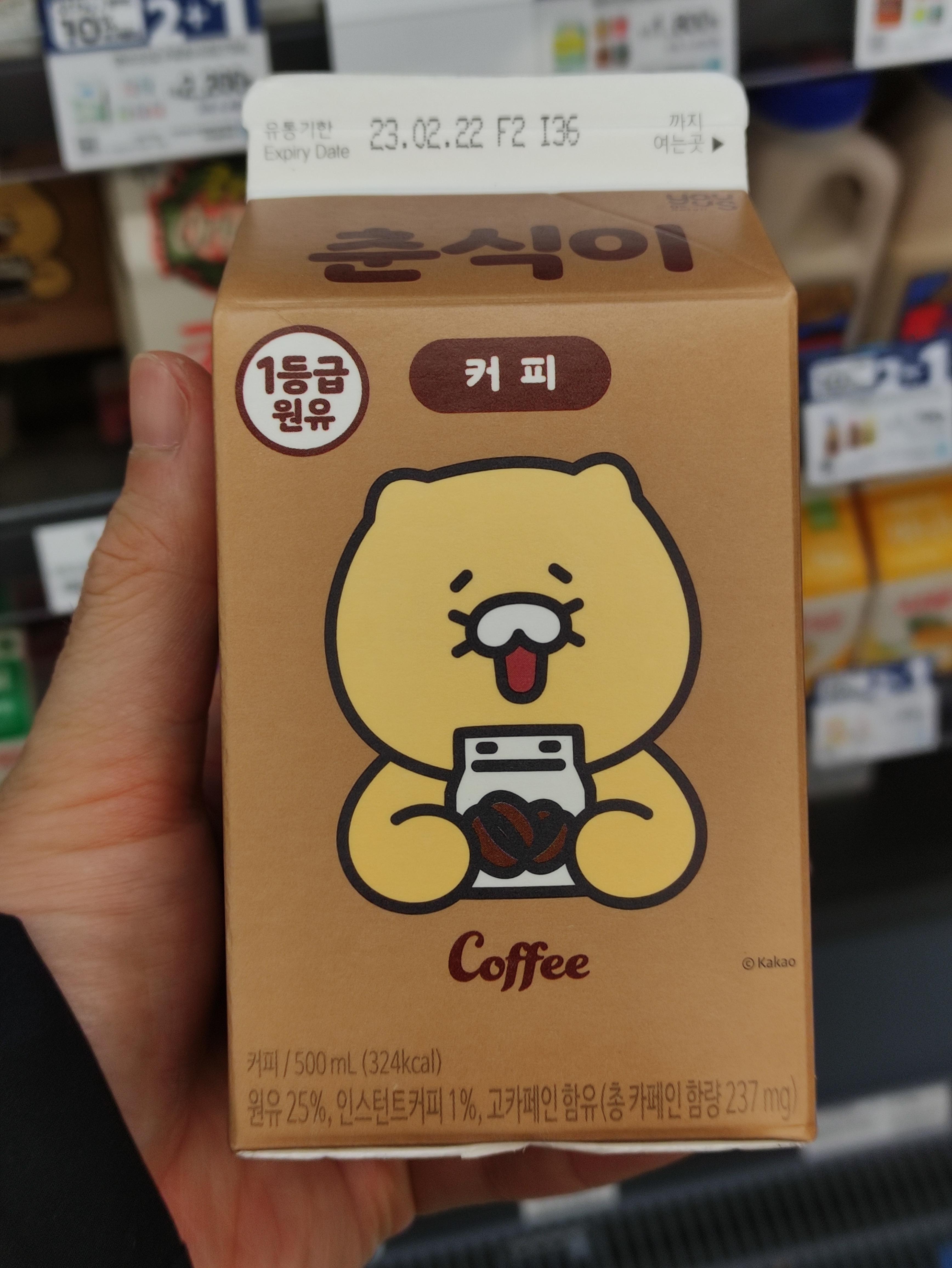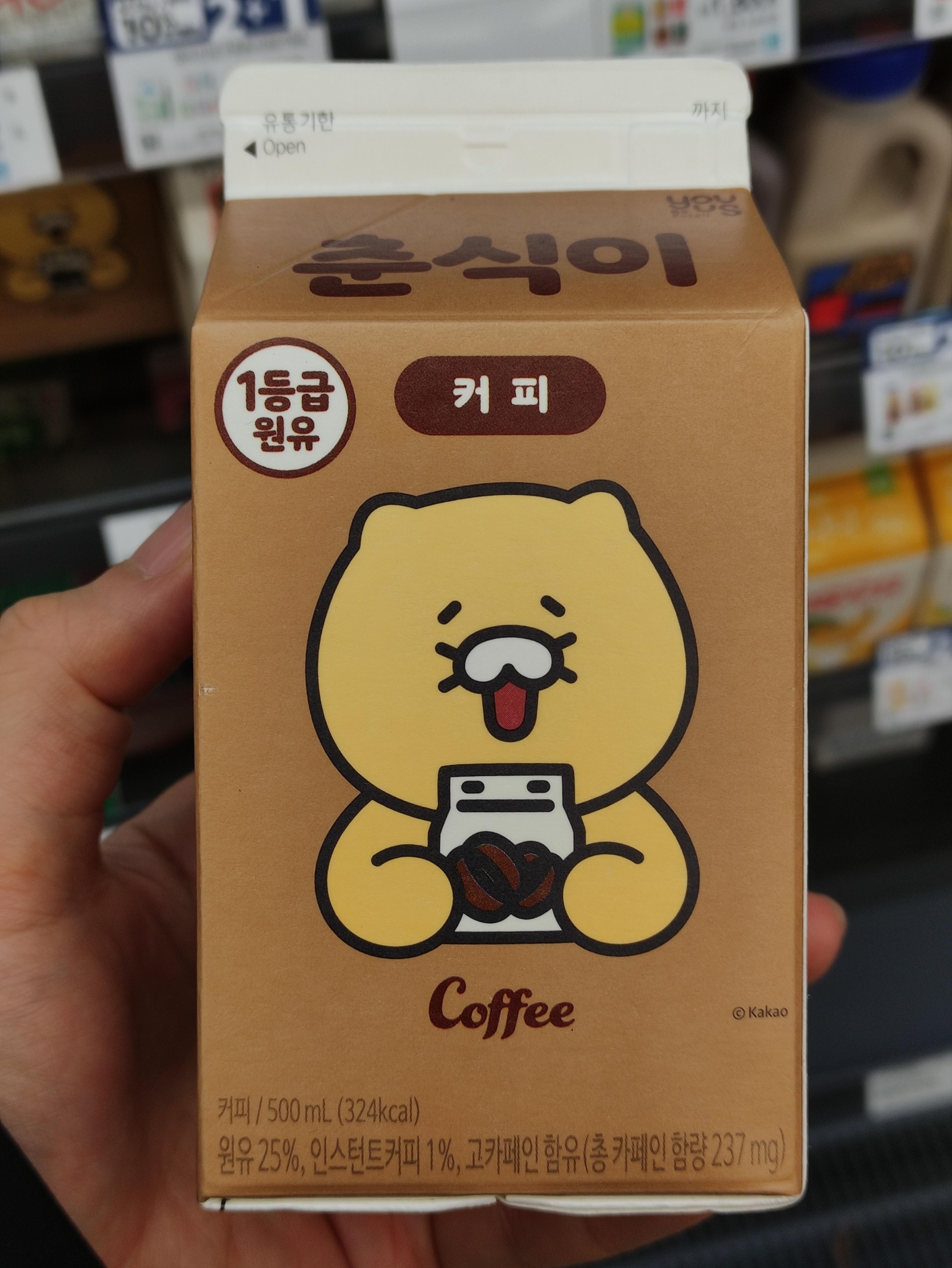 이름도 컨츄리한 춘식이 커피우유 입니다. 500ml 대용량 커피우유고요. 다 마시면 324kcal 입니다.