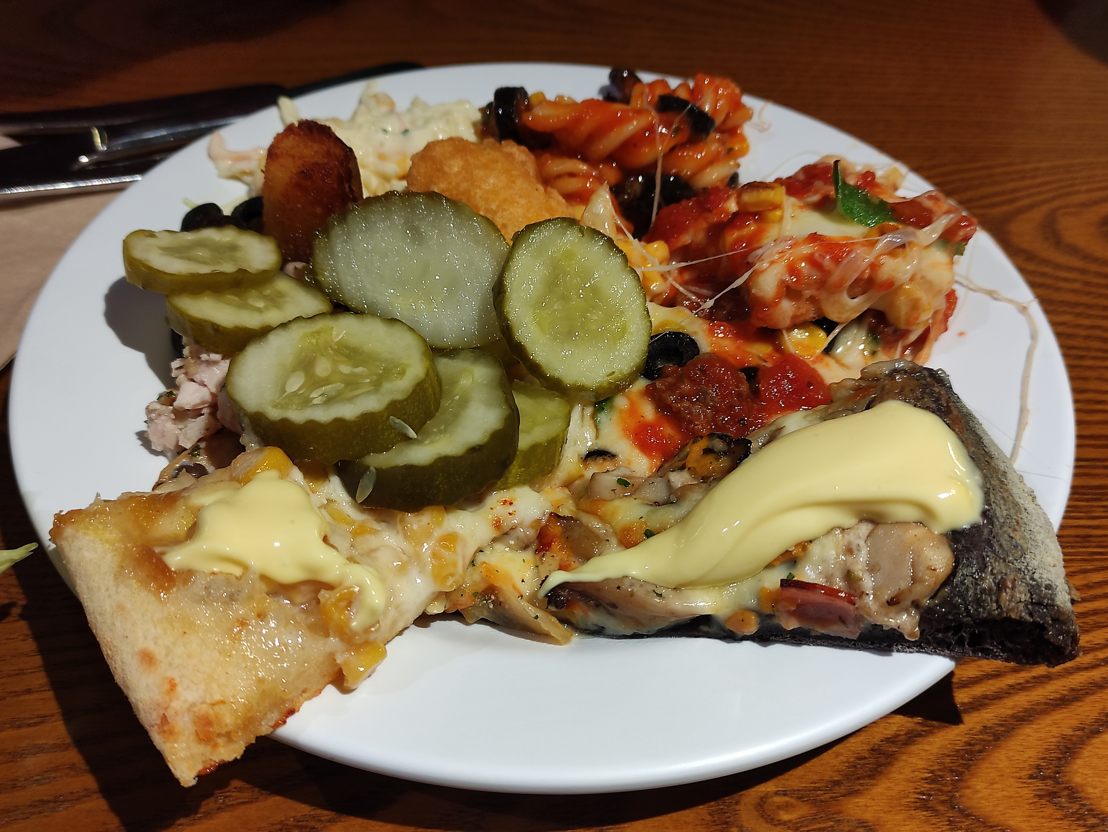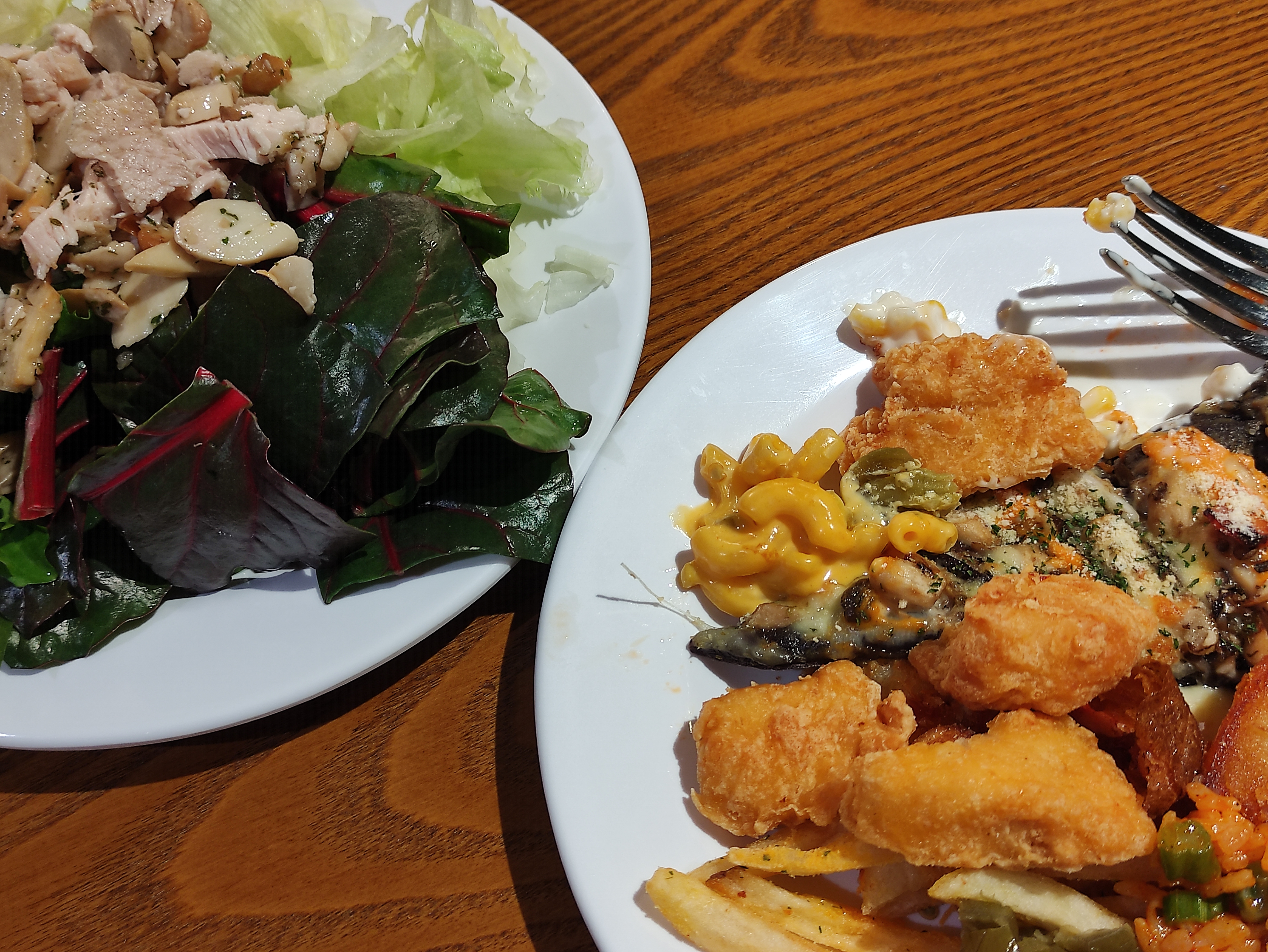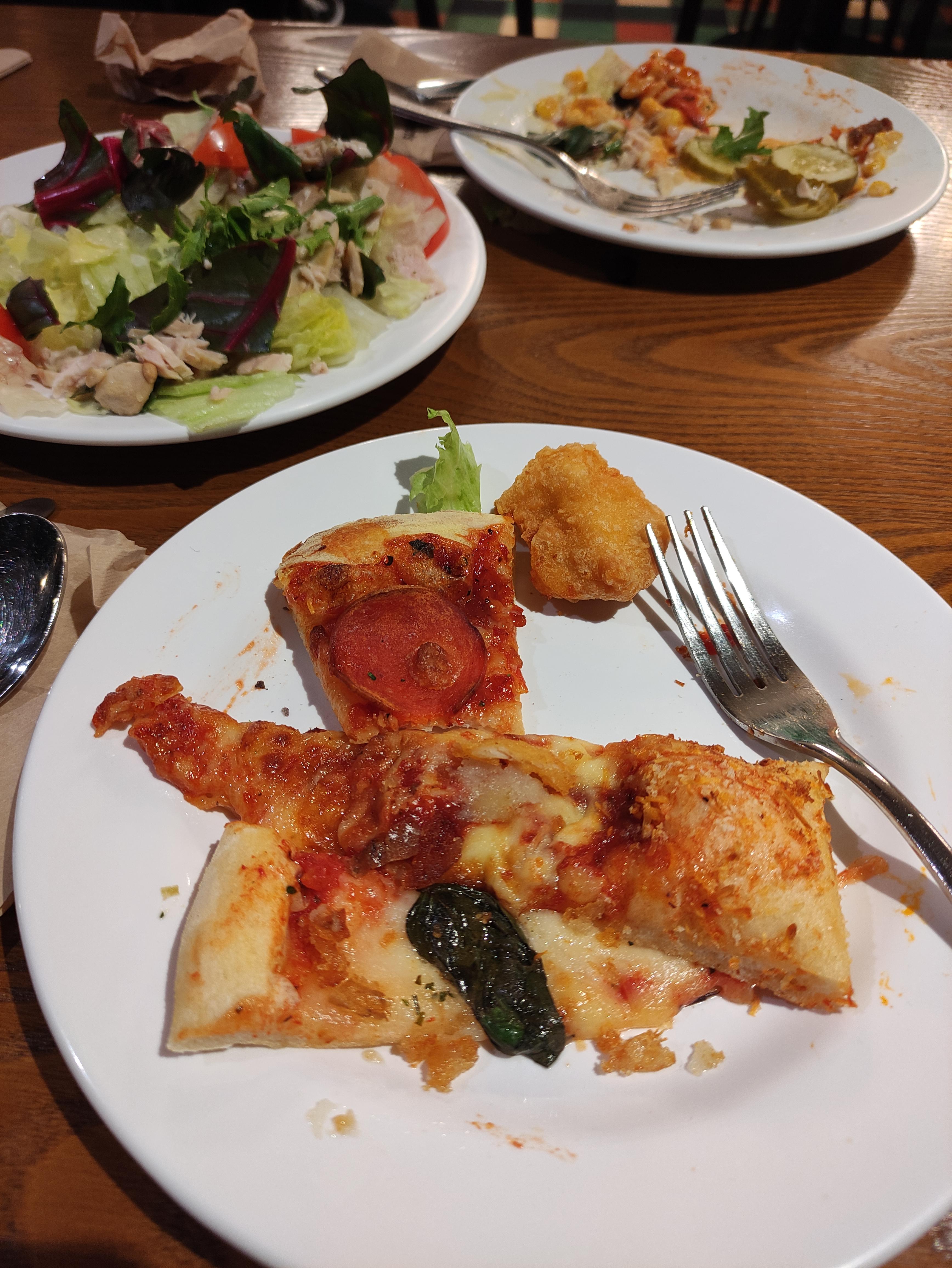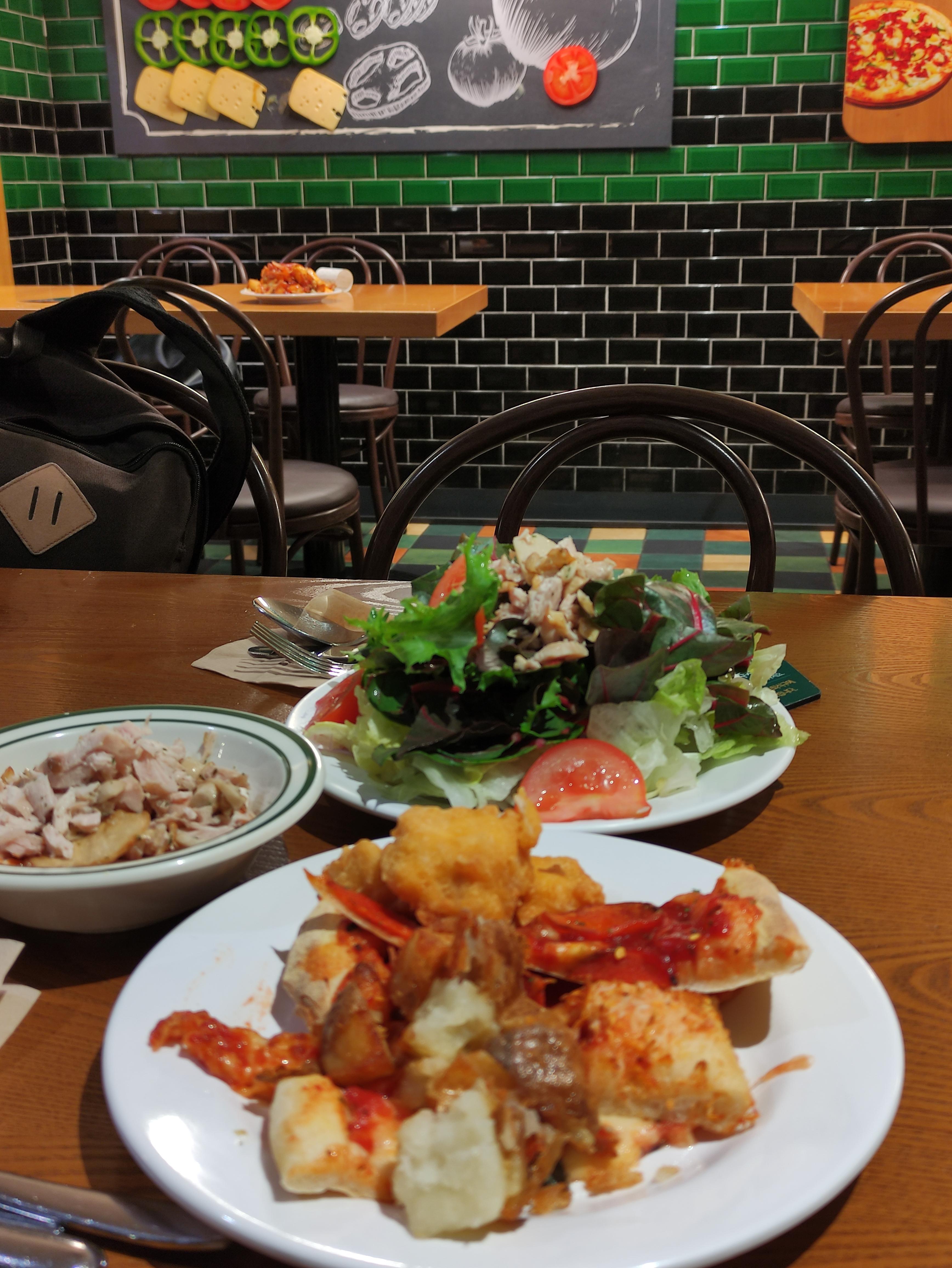 저는 신촌 피자몰 오면, 크림리조또에다가 닭가슴살 삶은거 많이 넣어 먹습니다. 그럼 닭가슴살이 퍽퍽함도 덜하고 크림도고소하고 밥하고도 잘 어울려서 종종 먹어요. 그리고 피자몰이니 피자 먹어야죠. 한접시는 피자랑 샐러드들로 채우고 나머지 한접시는 샐러드로 채웁니다. 채소 많이 먹어야죠. 그래야 나중에 속이 편합니다.