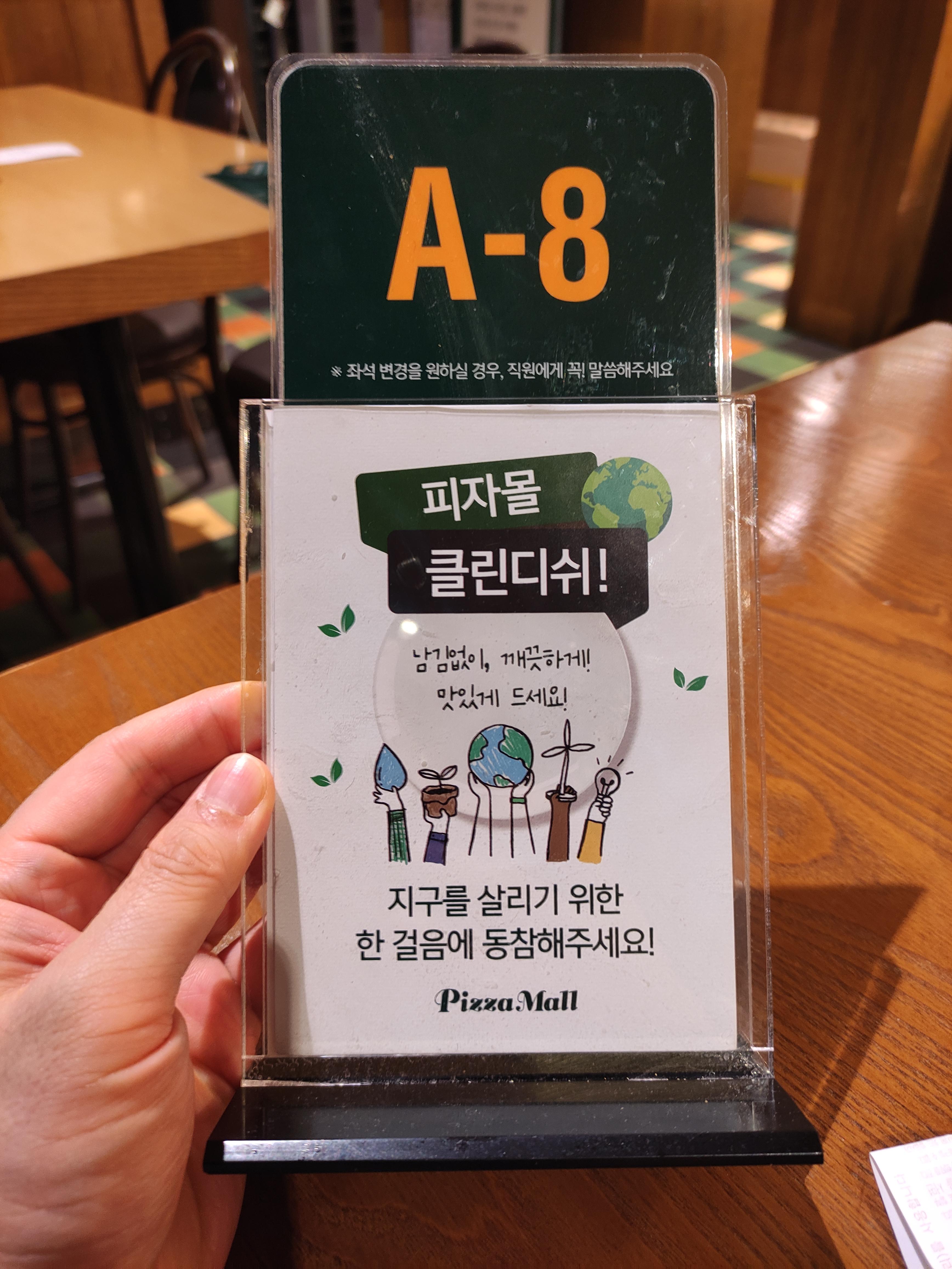 남김없이 깨끗하게 맛있게, 지구를 살리기위한 한걸음 피자몰 클린디쉬 캠페인을 진행중입니다. 제 자리는 A-8입니다. 직원분께 요청하면 자리도 바꿀수 있는것 같지만 그자리가 그자리니 그냥 앉아 먹습니다.