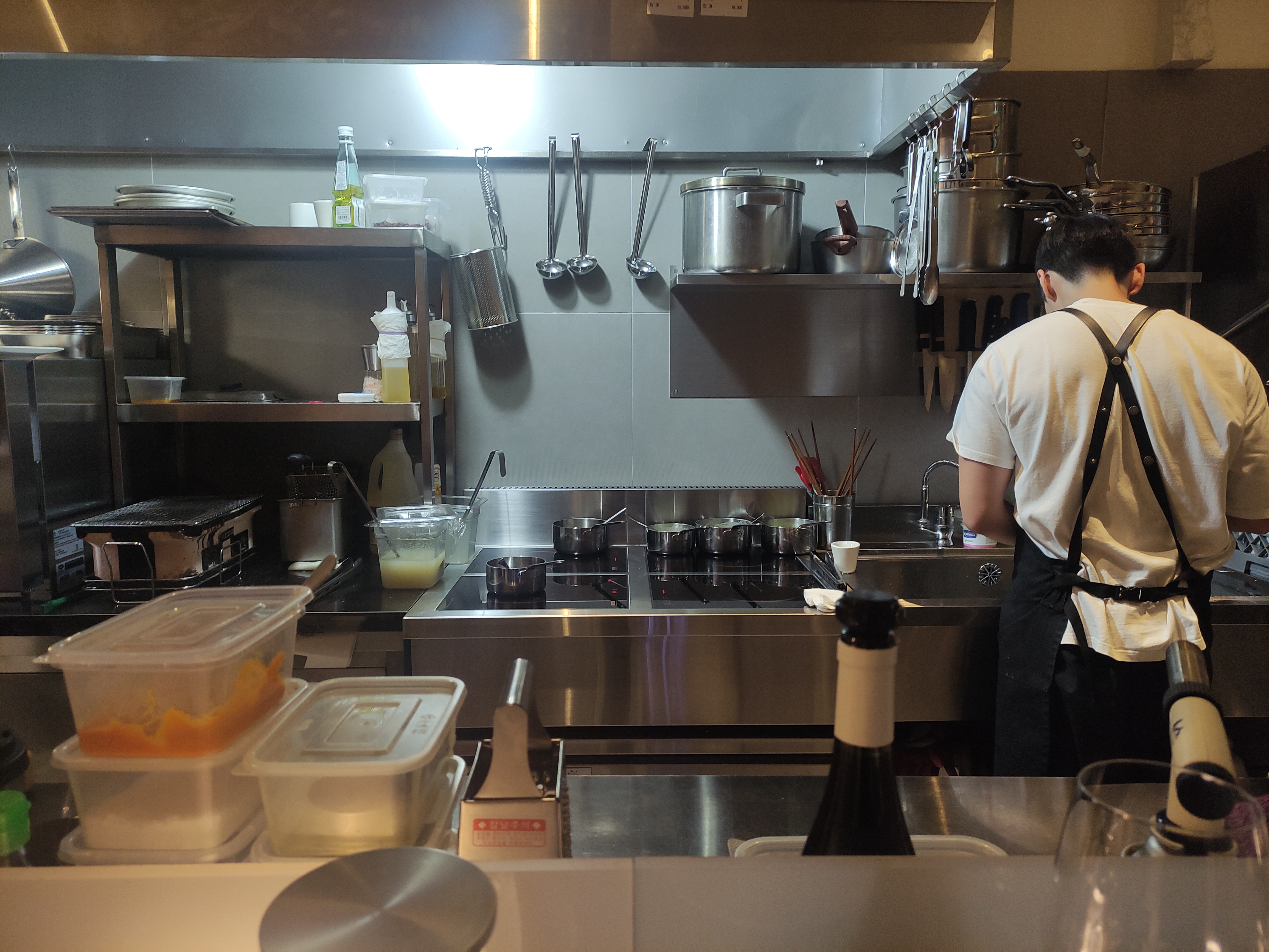 음식을 조리하고 계십니다. 마침 제 자리가 딱 인덕션 자리어서, 파스타 만드는 모습을 직관할 수 있었어요. 단정에서는 인덕션을 사용하는데 화력이 좋아보입니다. 요즘 인덕션 참 좋네요. 오른쪽은 손을 씻는 곳이고, 왼쪽은 오븐이 있는데, 고기류는 이 곳에서 한번 조리하고 난 뒤 오븐 옆에 있는 화로에서 한번 더 익혀주시더라고요.