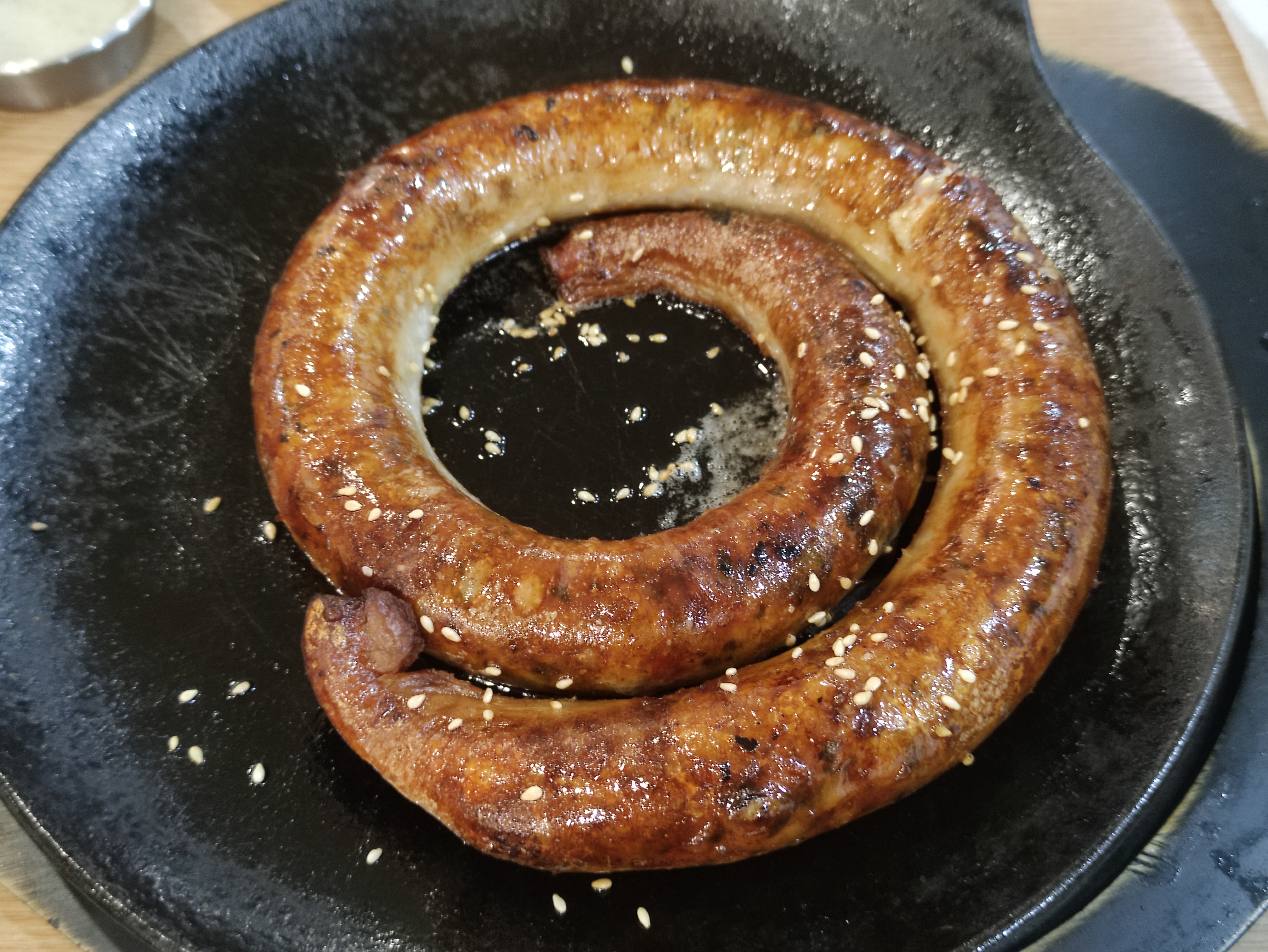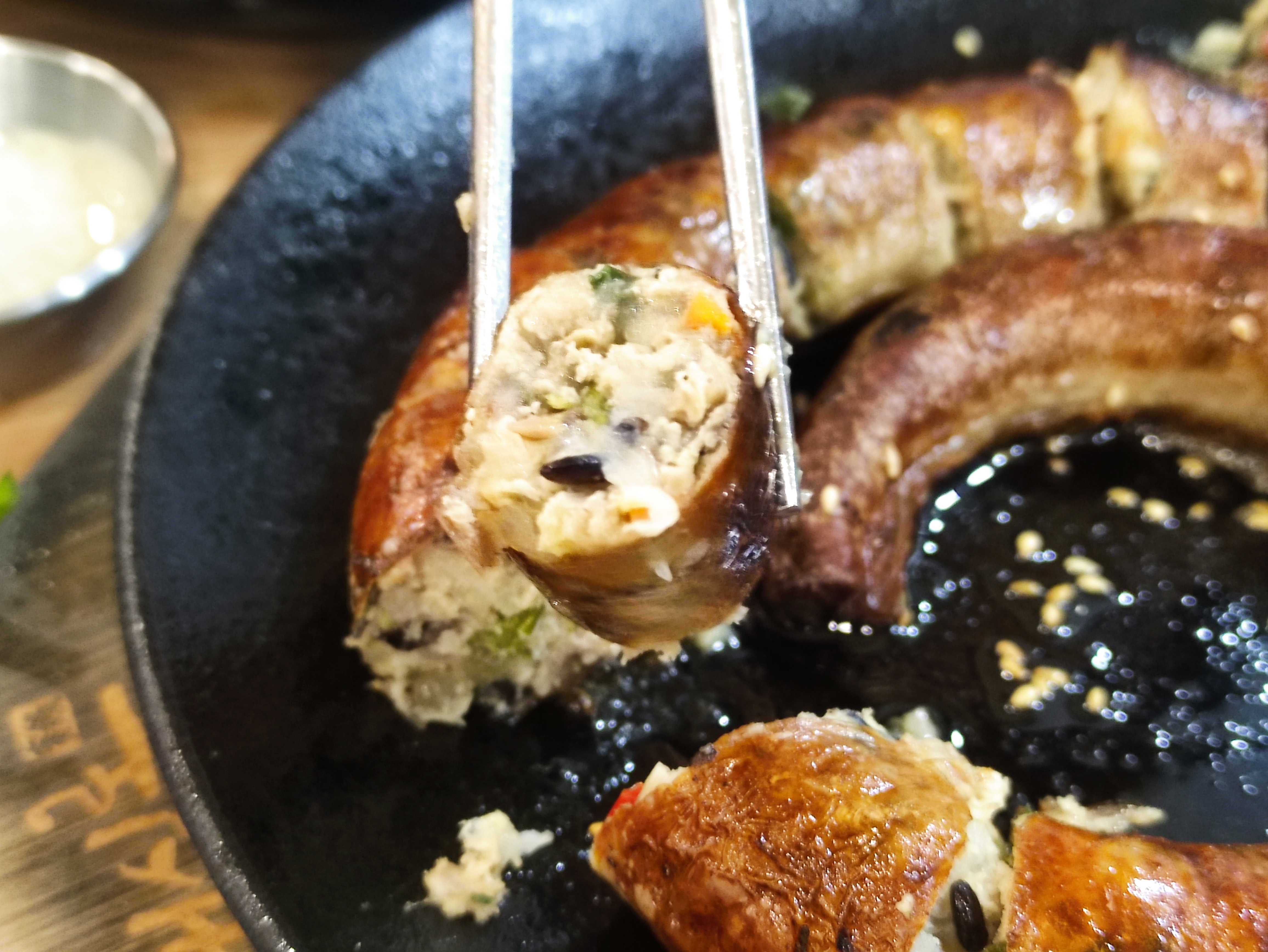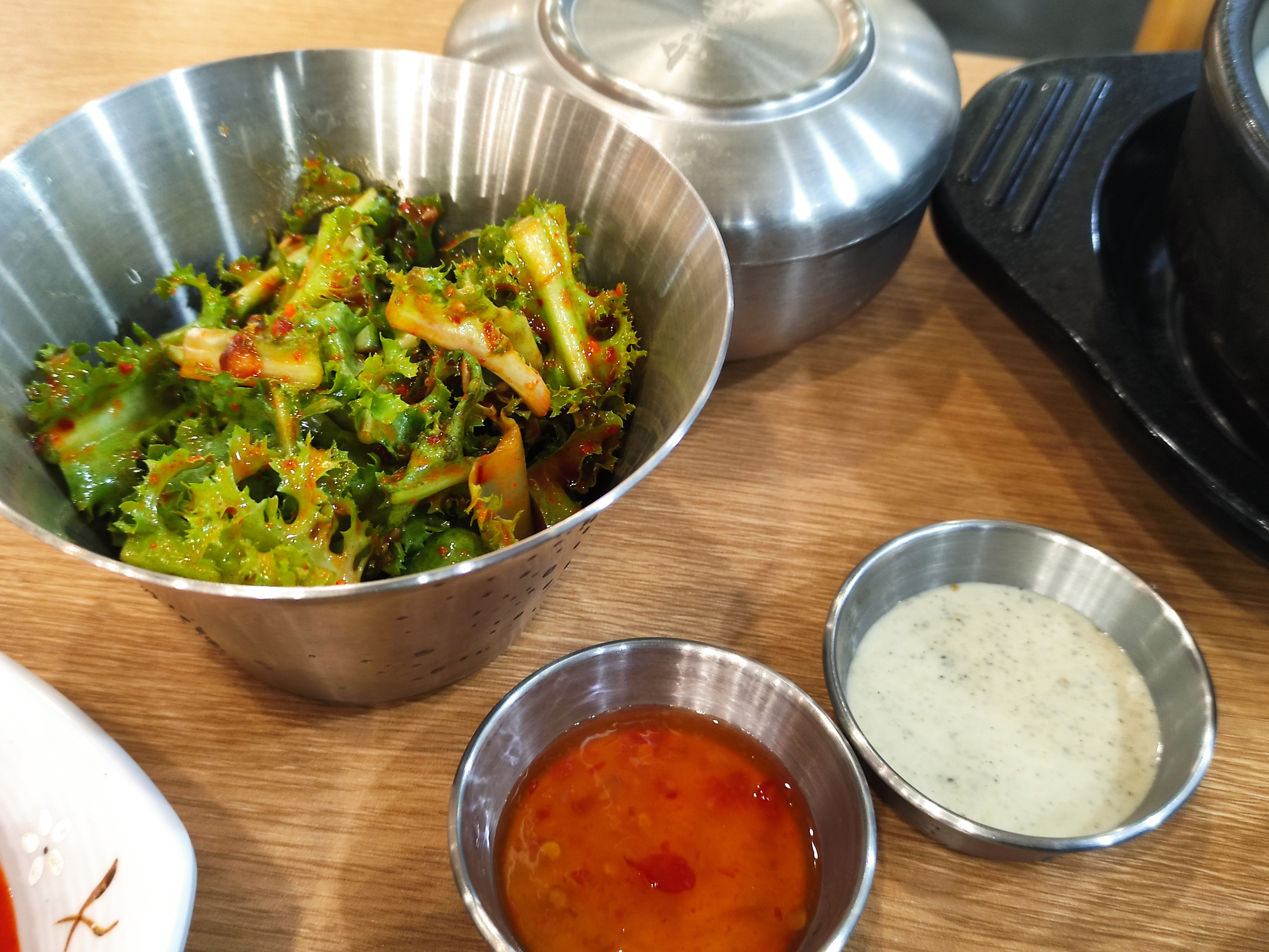 주문한 순대스테이크가 나왔습니다. 사실 순대와 스테이크가 매치가 잘 안되었는데 꽤 먹음직스럽게 나왔어요. 순대스테이크를 주문하면 소스가 두종류 나오는데 하나는 칠리소스고, 하나는 크림소스입니다. 그리고 채소겉절이가 하나 나왔어요.