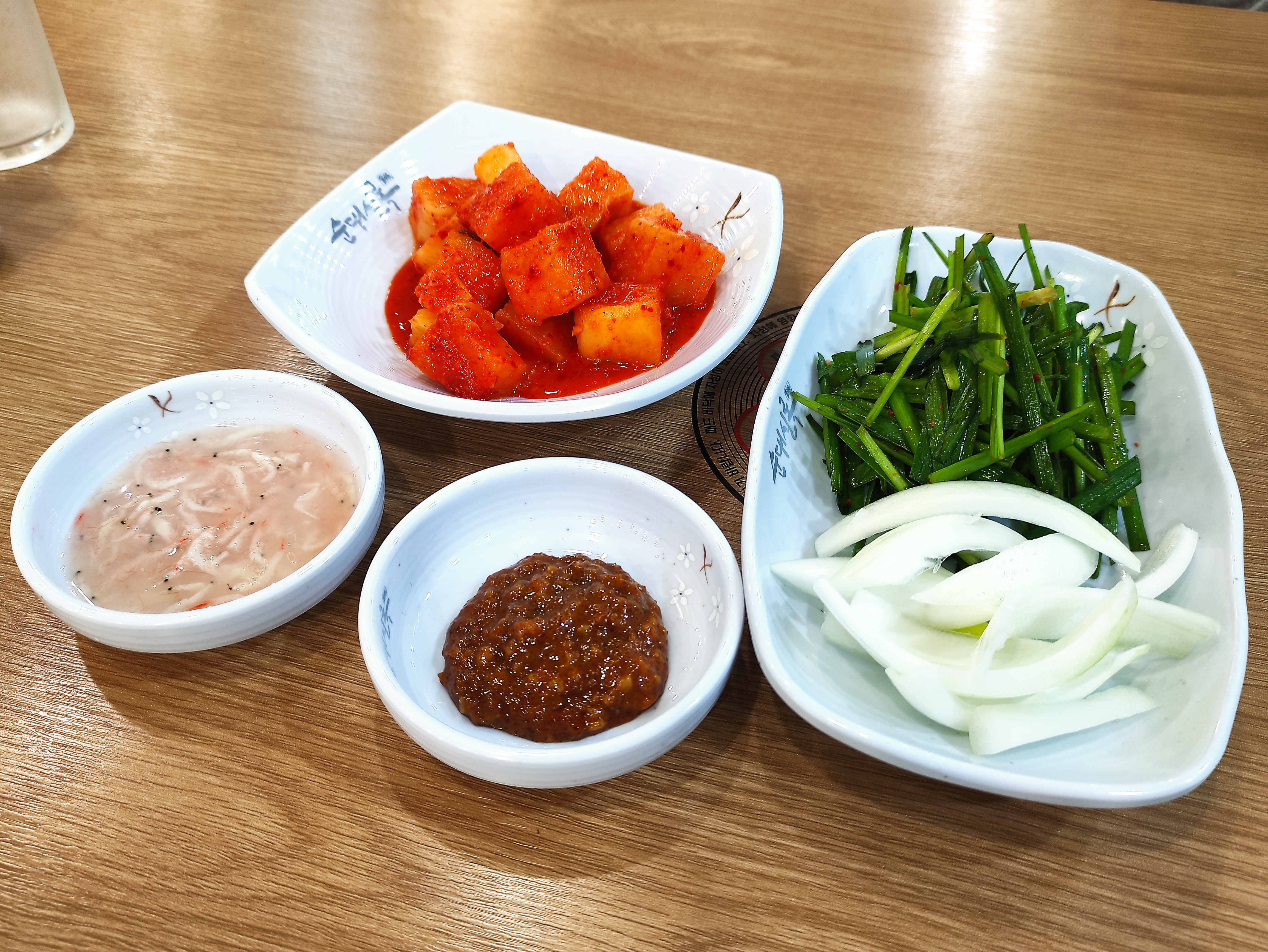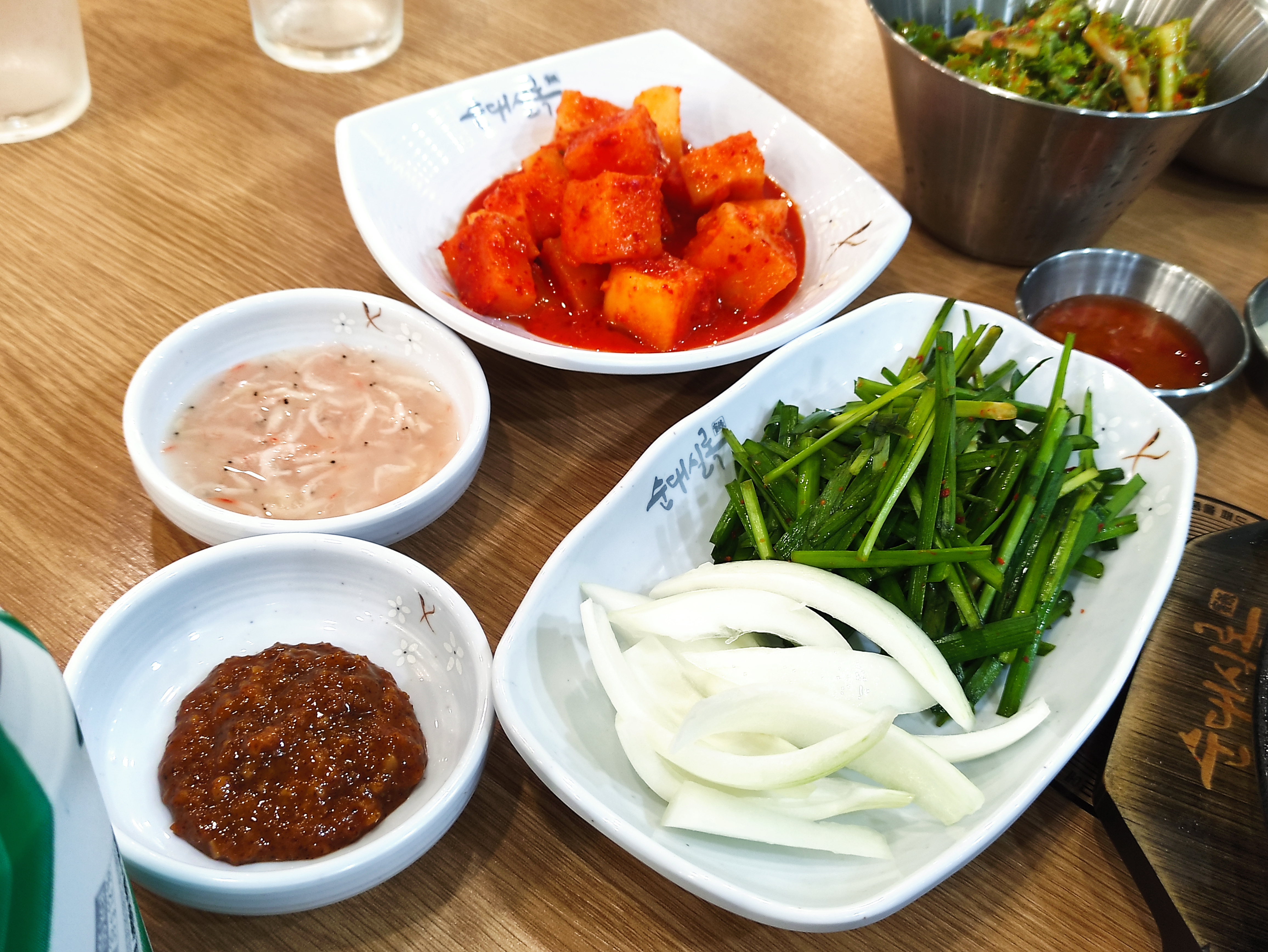순대국을 주문하면 기본으로 쌈장, 새우젓, 깍두기, 부추, 양파가 나옵니다.