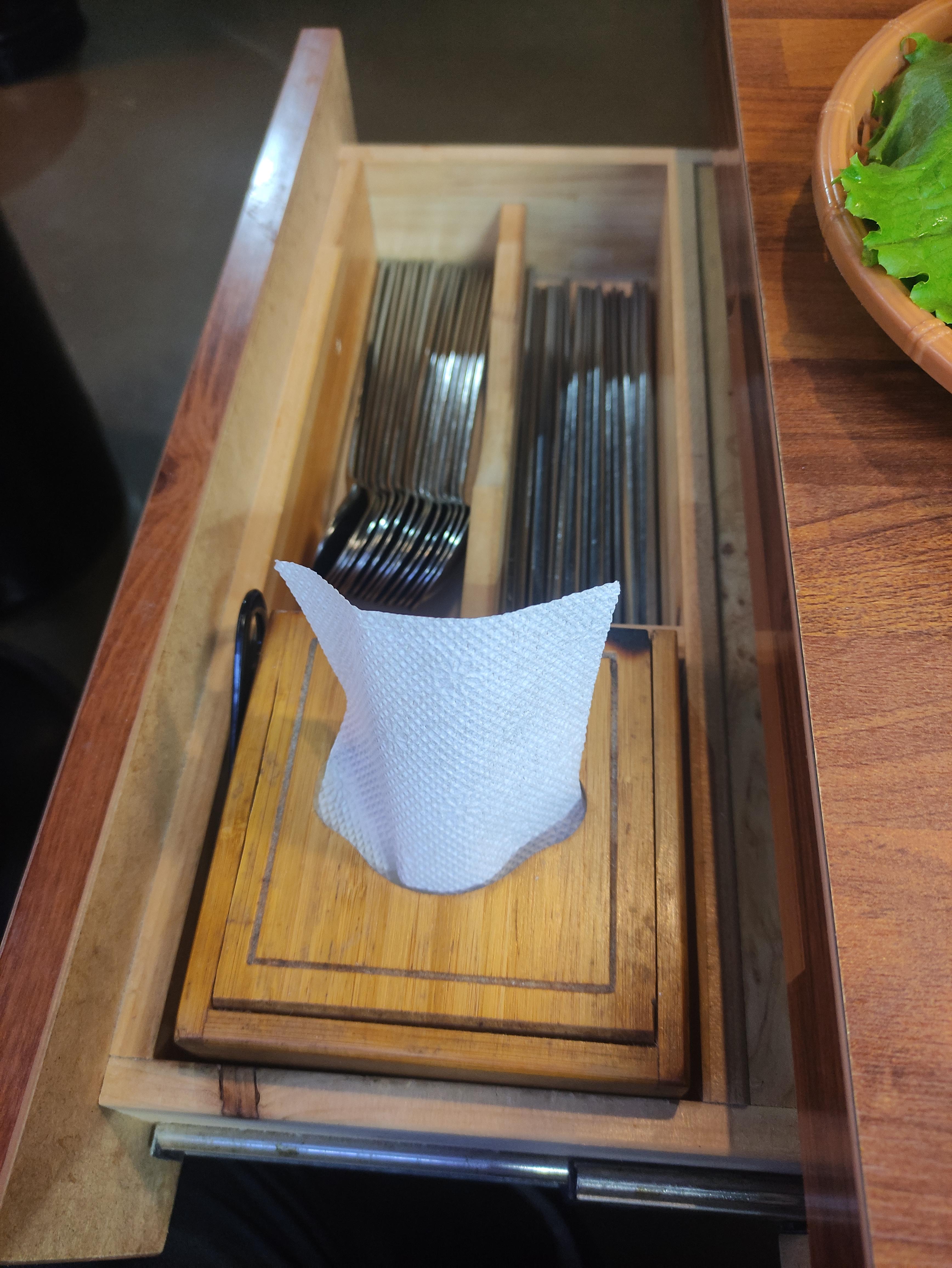 서랍형 수저함이 테이블 측면에 설치되어 있습니다. 메뉴판을 봅시다. 1페이지로 깔끔하게 되어 있습니다. 배떼기 곱창에서 곱창 막창류를 주문하면 선지해장국을 줍니다. 리필도 가능하다고 합니다.