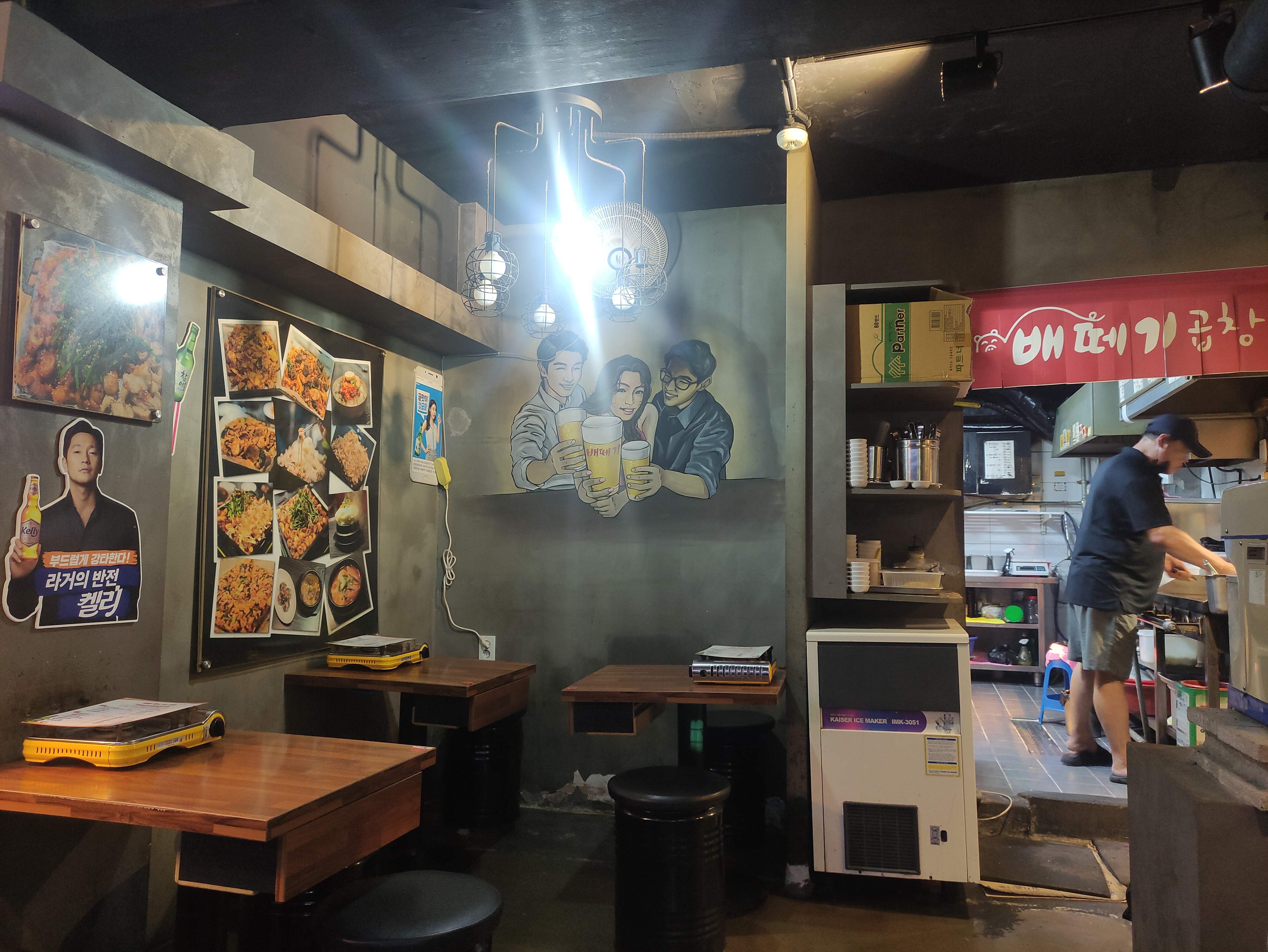 안으로 들어갔습니다. 라거의반전 켈리 손석구배우가 가장 먼저 보이고요. 벽면에 독특한 그림벽화도 눈에 띕니다. 남자 둘에 중앙에 여자분이 그려진 그림, 맥주잔에 배떼기라고 그려져 있습니다. 가맹점이 아니고 홍대에만 있는 곳 입니다. 개인 음식점만의 매력이 있습니다.
