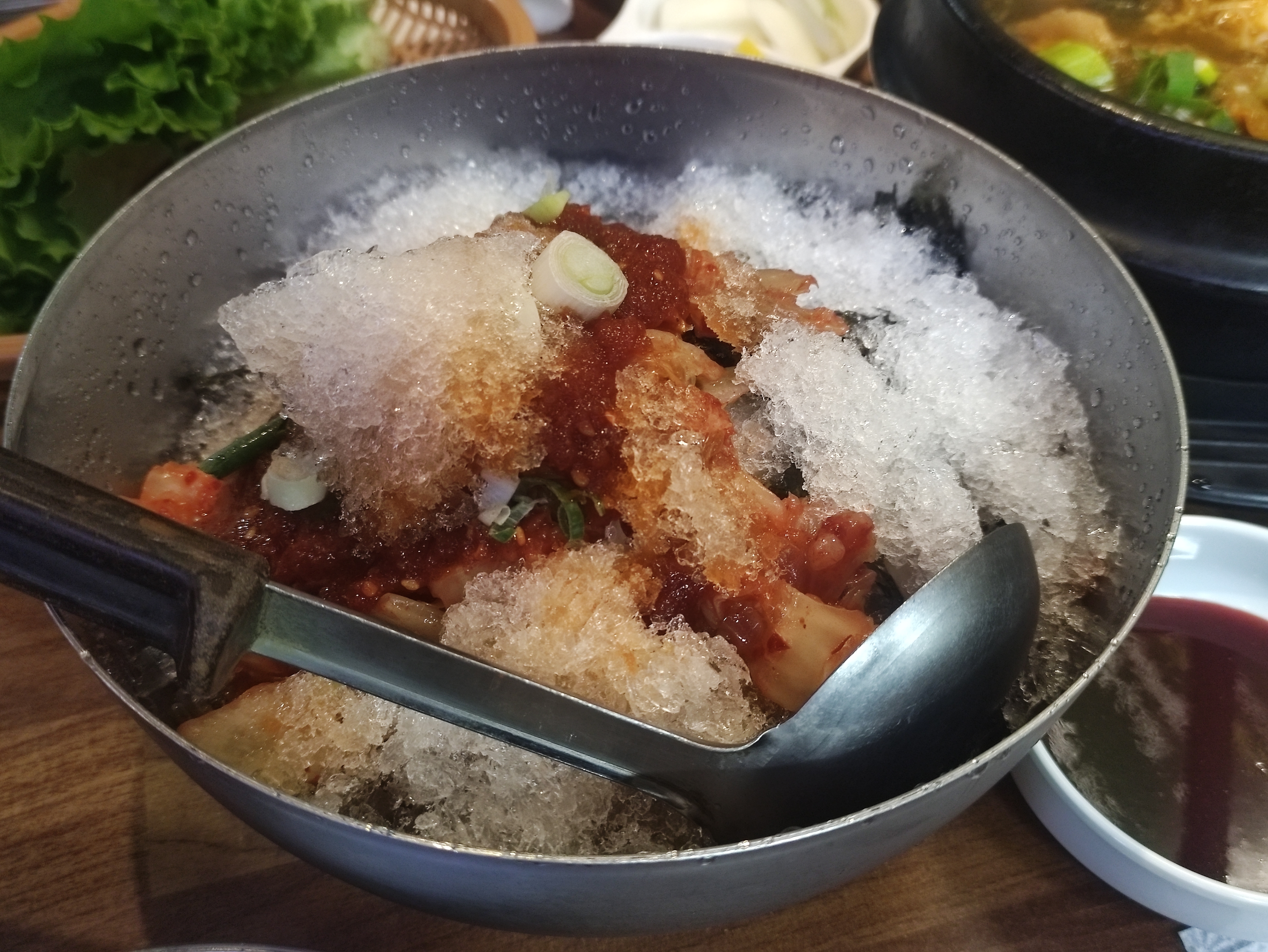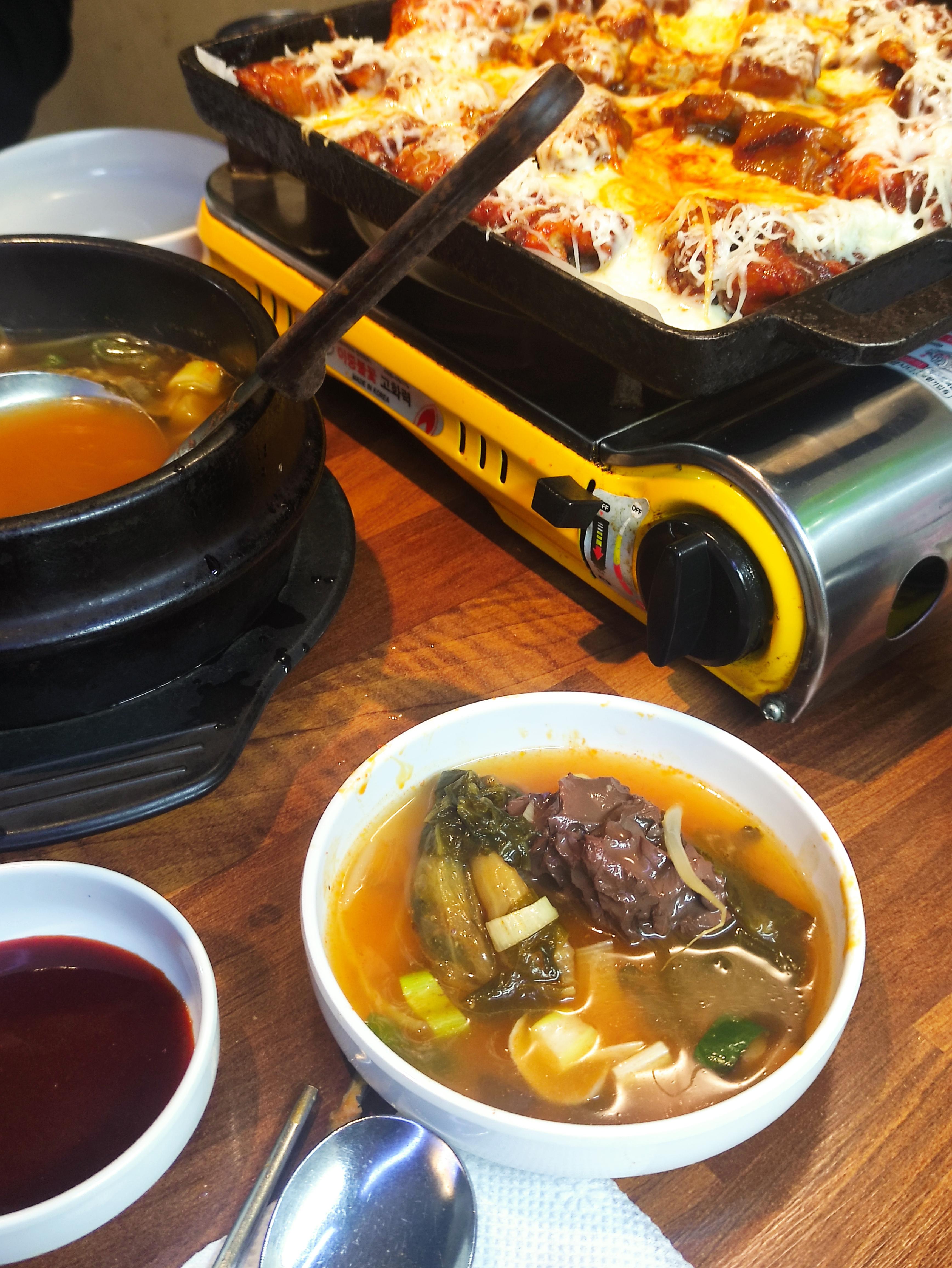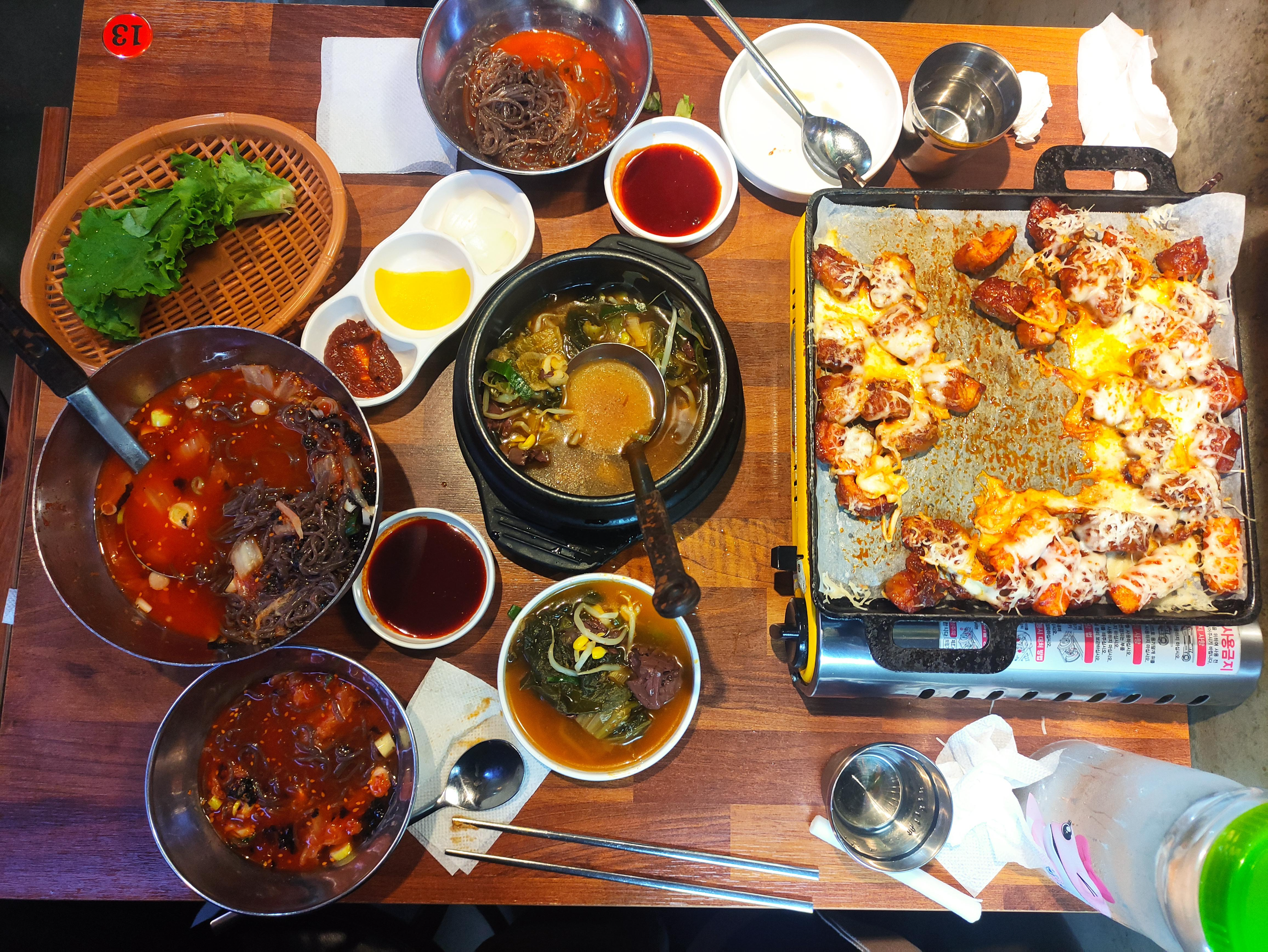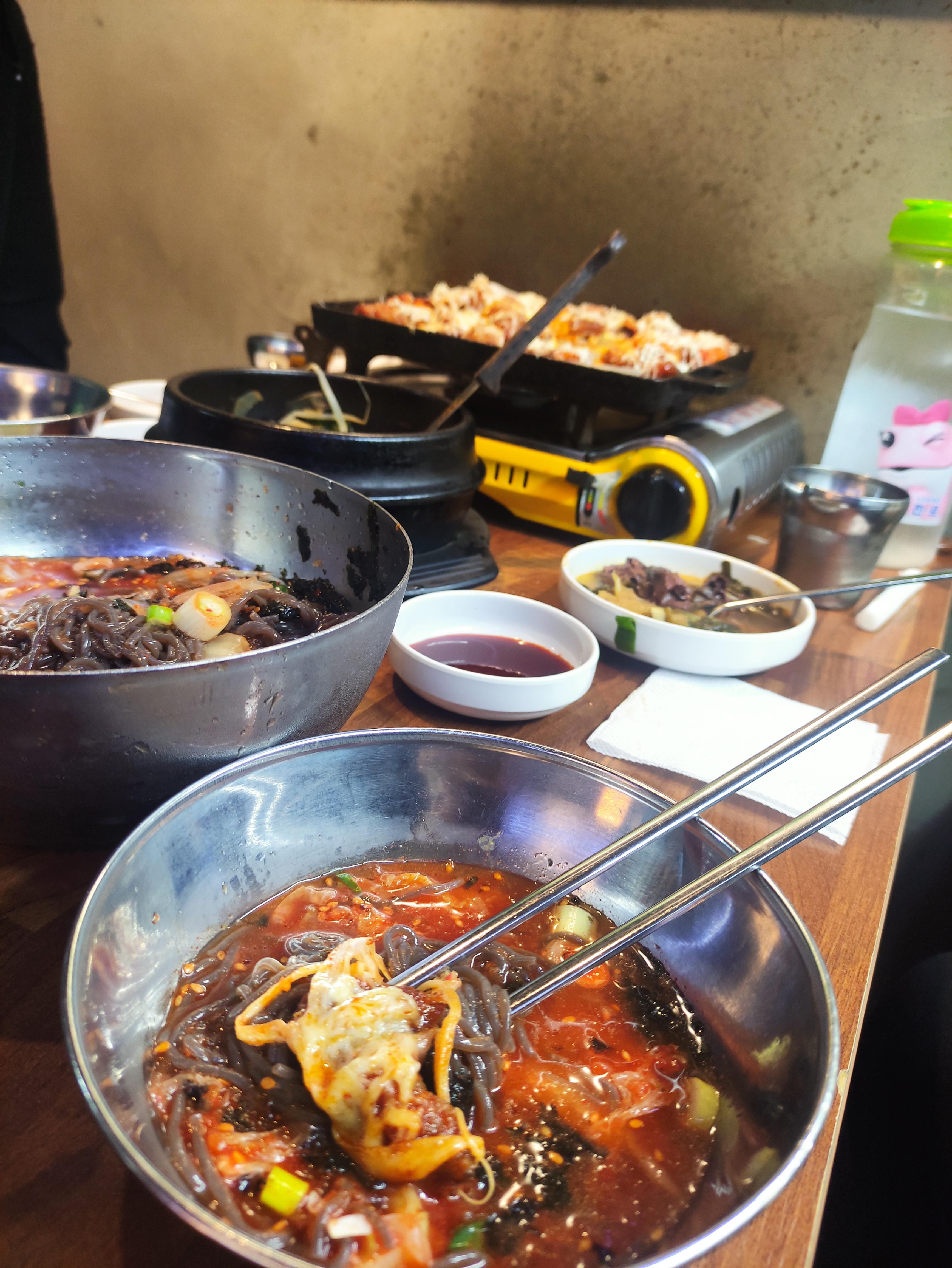주문한 음식이 나왔습니다. 빙수막국수가 왜 막국수에 빙수가 들어가는지, 직접 보면 알 수 있습니다. 팥빙수용 얼음이 막국수에 가득 올라가 있어 마치 빙수처럼 보이기도 합니다. 중앙에는 선지해장국인데, 리필이 가능하고요. 오른쪽은 눈꽃막창입니다. 매콤한 양념에 막창을 볶은 뒤 그 위에 갈은 치즈를 눈꽃처럼 소복히 쌓았습니다. 매력적인 메뉴네요. 막창 메뉴는 익혀져서 나오기 때문에, 휴대용버너에 불을 켜서 치즈가 녹을만큼만 데워서 먹으면 됩니다.