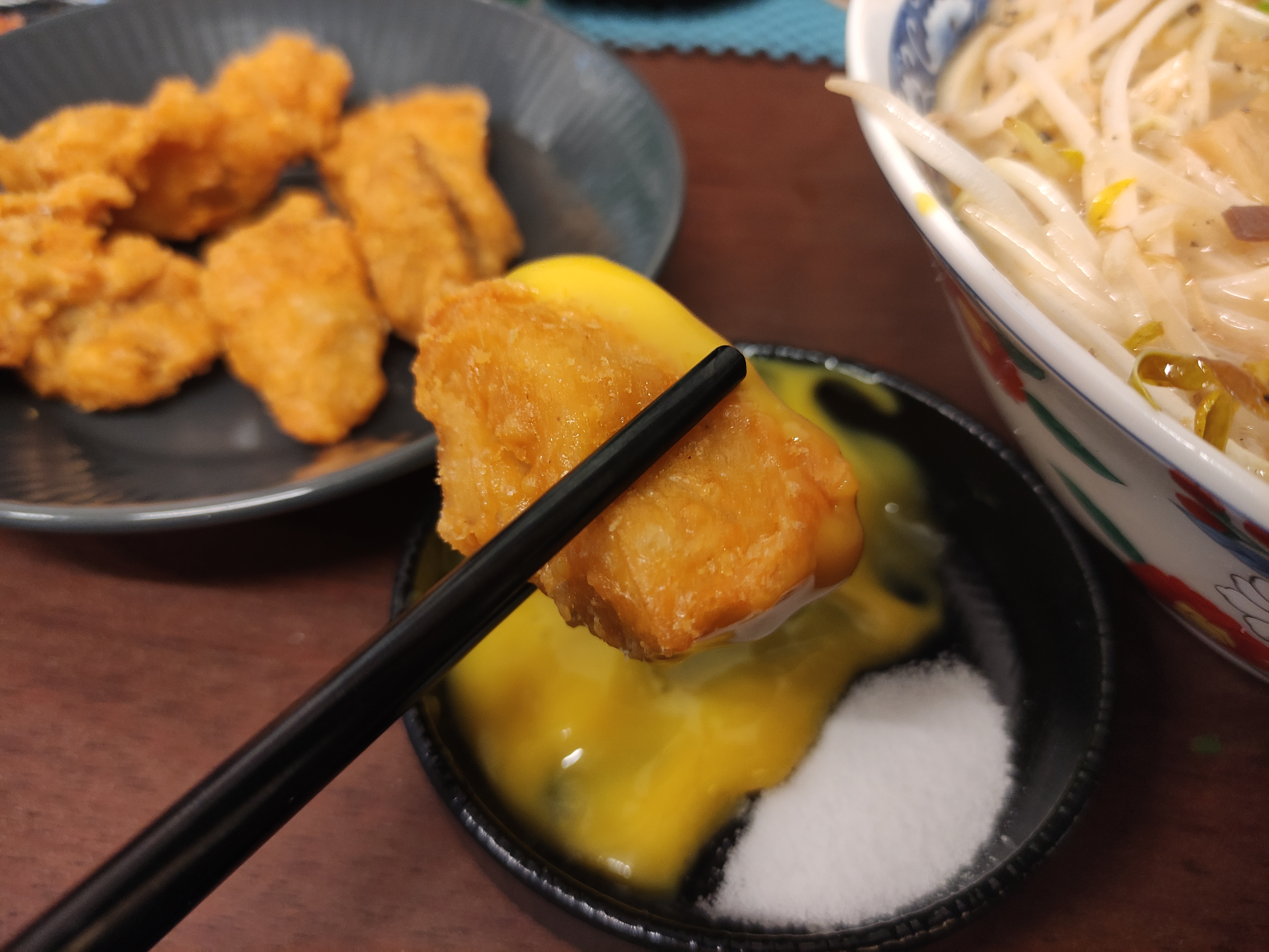 치킨가라야게는 허니머스타드소스와 소금 이렇게 두 종류의 소스를 찍어 먹을 수 있습니다. 그냥 먹어도 맛있지만 소금을 살짝 찍어먹으면 더 맛있게 먹을 수 있습니다.