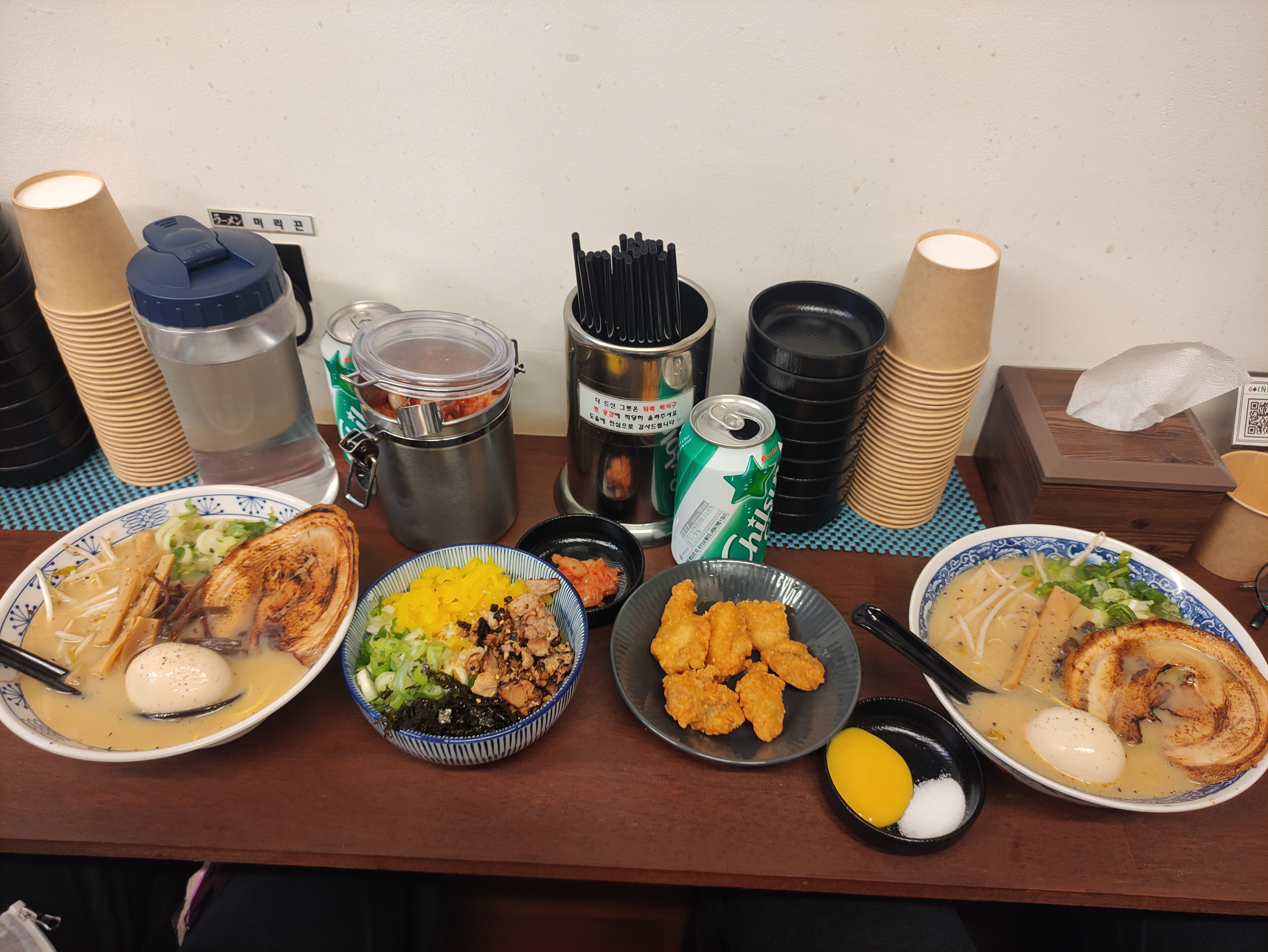 주문한 메뉴가 나왔습니다. (왼쪽부터) 돈코츠라멘, 차슈동(미니), 치킨 가라야게, 돈코츠소유라멘, 그리고 사이다가 보입니다.