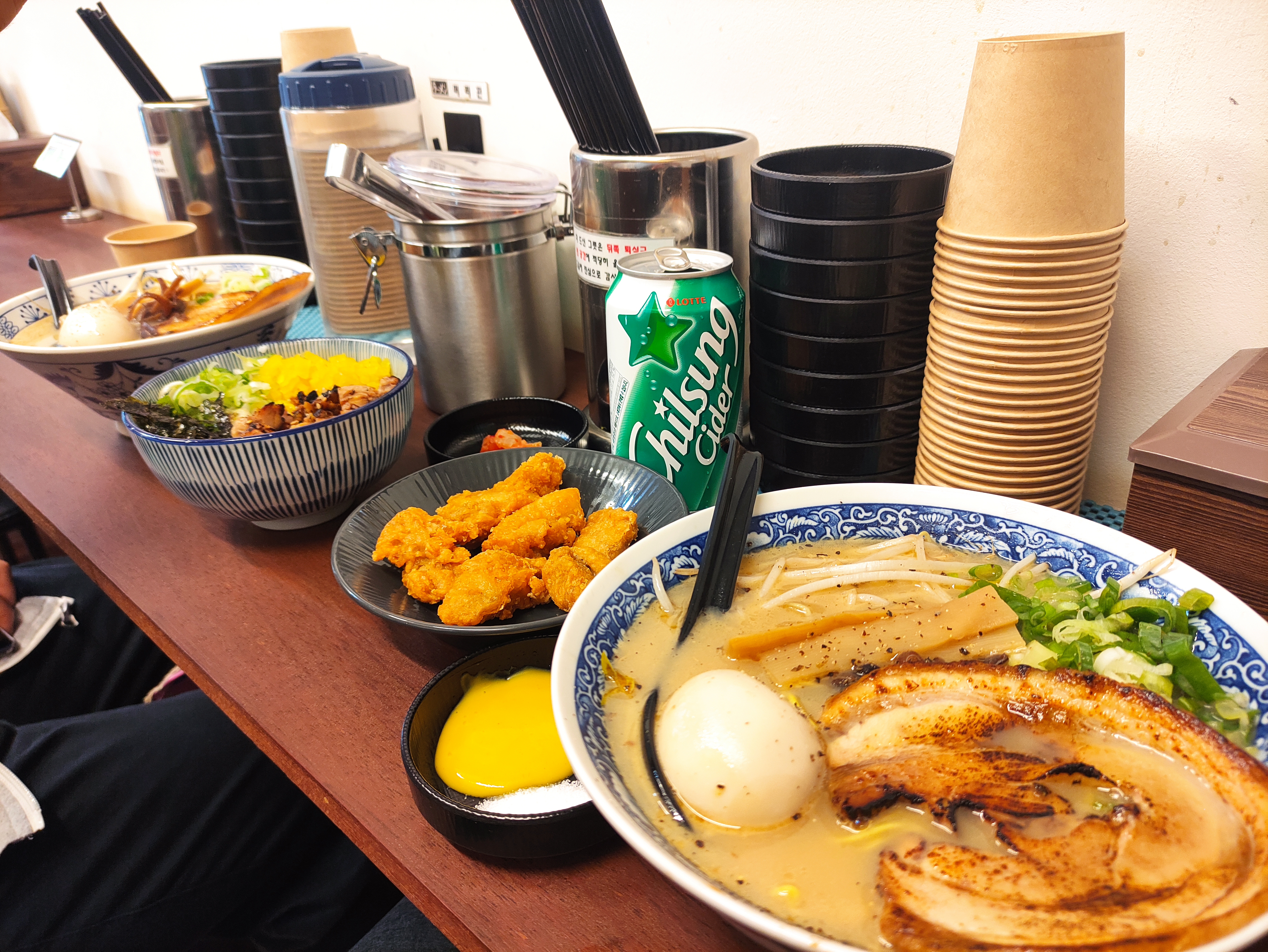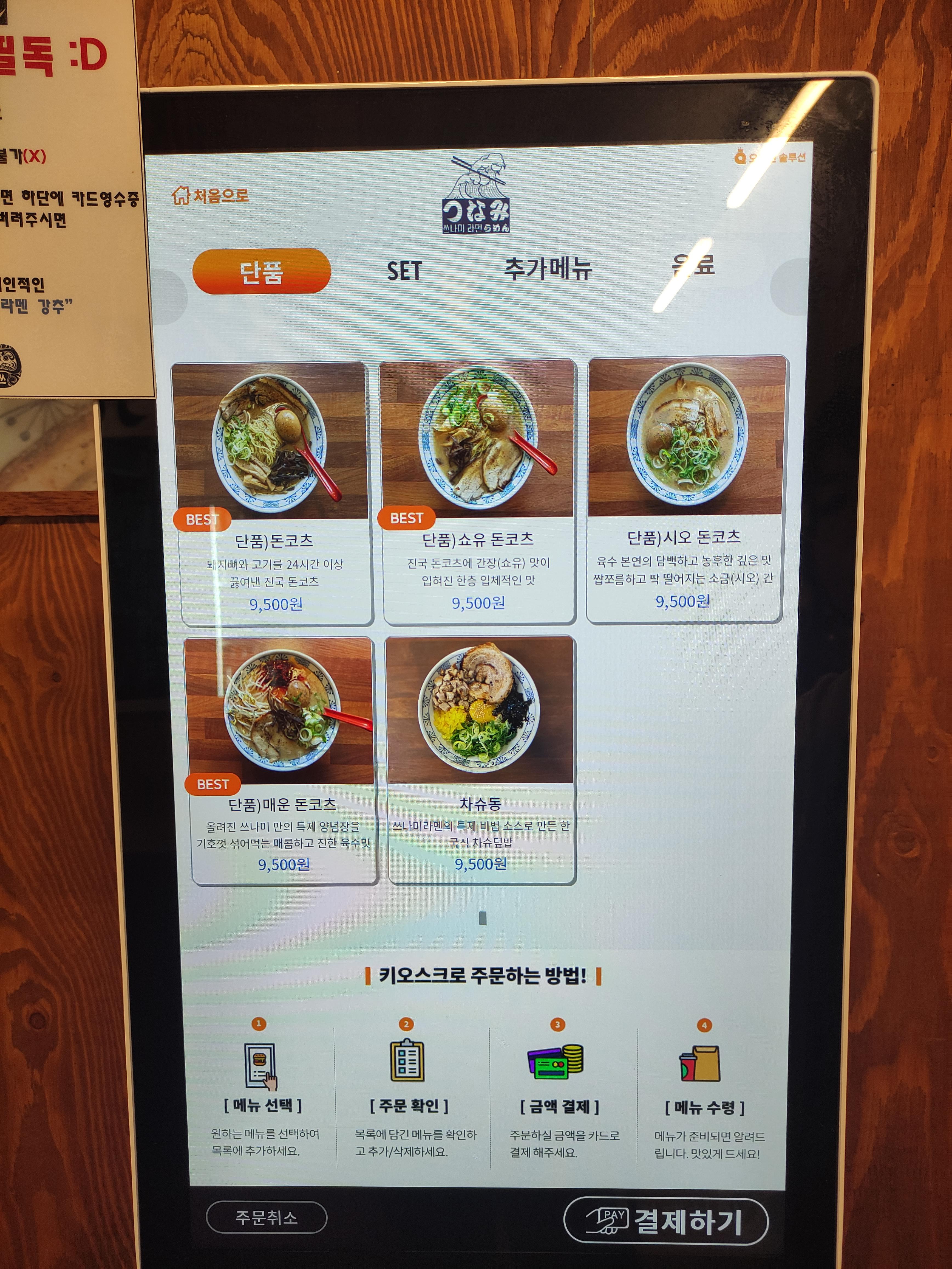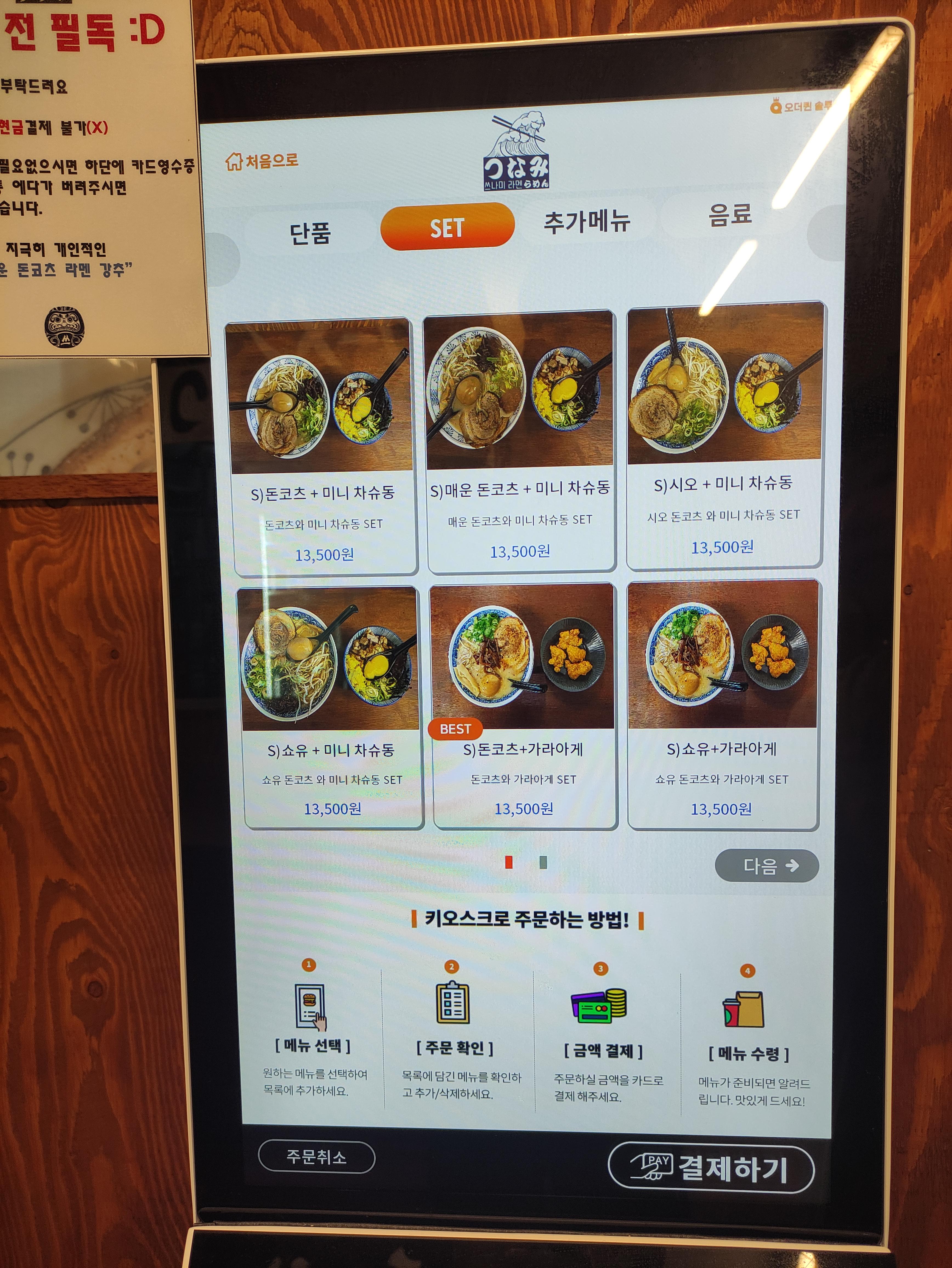 저는 돼지뼈와 고기를 24시간 이상 끓여낸 진국 돈코츠인 돈코츠+차슈동(미니) 세트와, 진국 돈코츠에 간장(소유) 맛을 입힌 입체적인 맛이 장점인 소유 돈코츠라멘+치킨가라야게 세트를 주문하고, 음료는 사이다로 주문했습니다. 입구에 들어가면 바로 우측에 있는 키오스크 기기로 주문이 손쉽게 가능합니다.