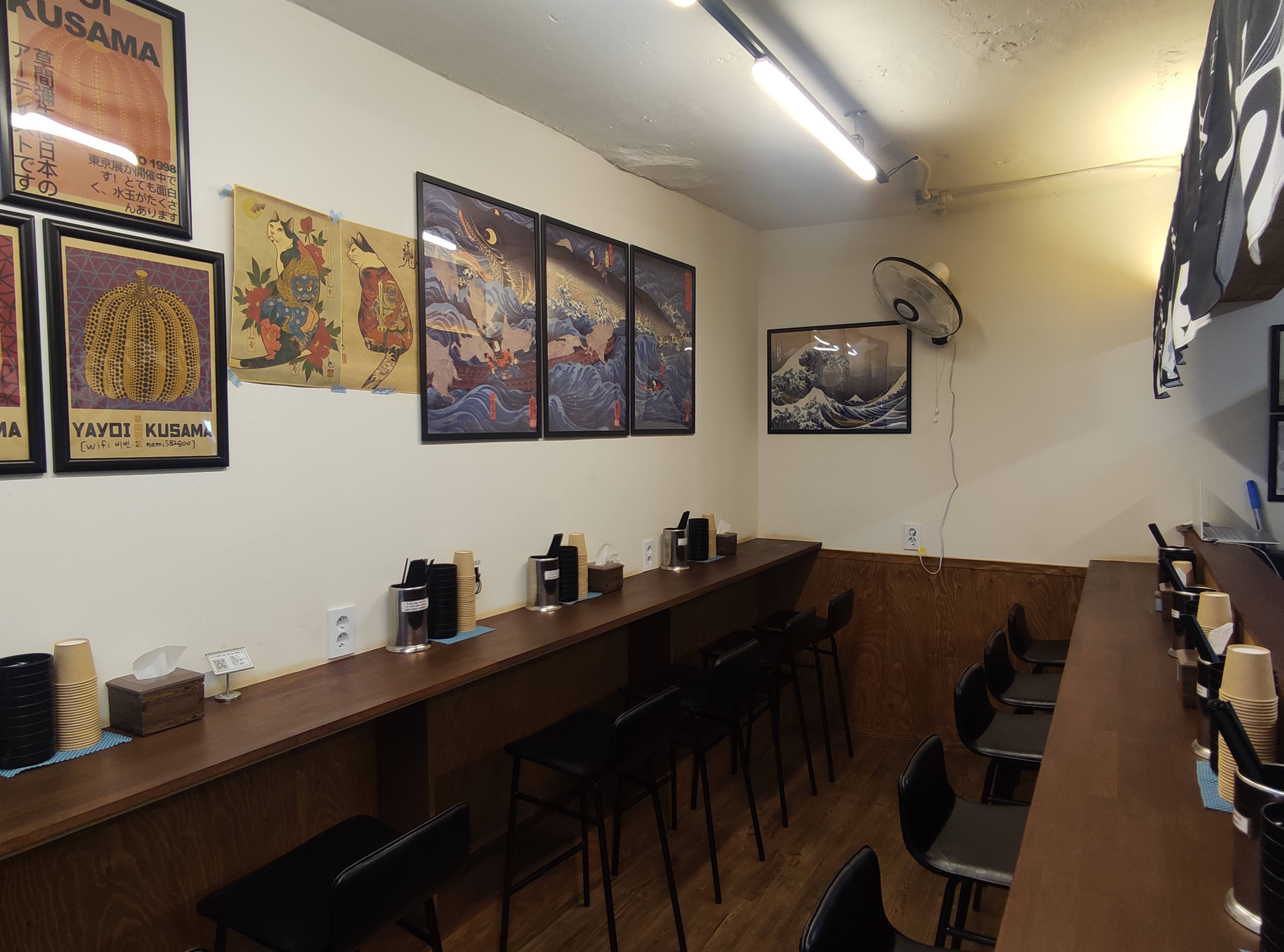 매장입니다. 왼쪽에는 테이블이 ㄱ 자로 배치되어 있고, 오른쪽에는 일자형태로 배치되어 있어, 커플 및 혼밥도 가능한 합리적인 테이블 배치입니다.