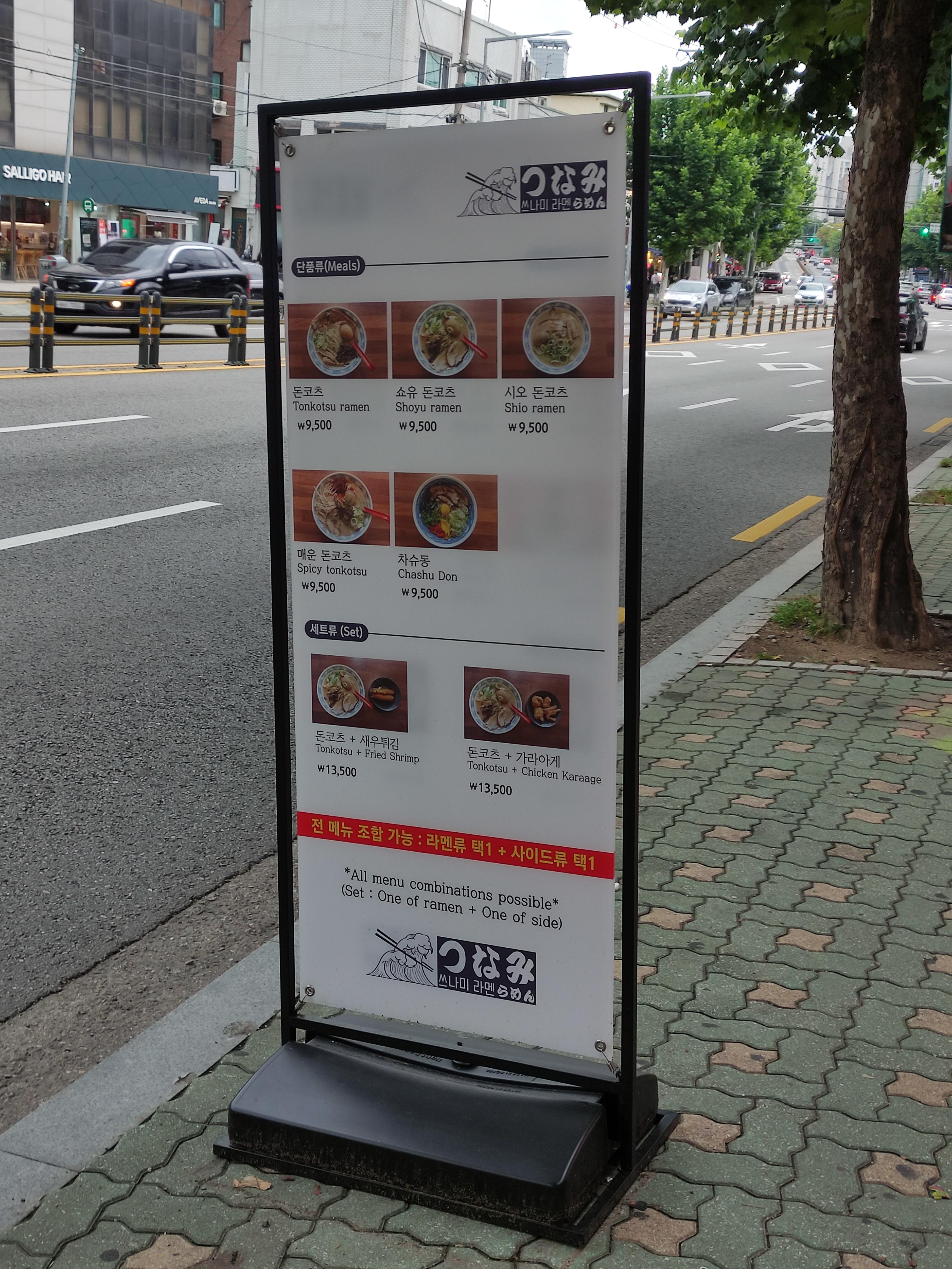 Tsumani Ramen의 메뉴입니다. 입간판을 설치하여 쉽게 볼 수 있게 해두었습니다. 모든메뉴는 세트조합이 가능합니다. all menu combinations possible 이라고 적혀있습니다. 단품류로는 돈코츠라멘, 소유돈코츠라멘, 시오돈코츠라멘, 매운돈코츠 라멘류가 있고, 차슈동이 있습니다. 돈코츠라멘 종류가 많은 것으로 보아 이 곳은 돈코츠라멘을 제대로 만들겠다라는 느낌이 듭니다. 더본코리아 경영자 백종원이 말하듯, 메뉴 축소와 전문화가 중요한것 같습니다. 쓰나미 라멘은 이 원칙을 잘 지키는 것 같아요.
