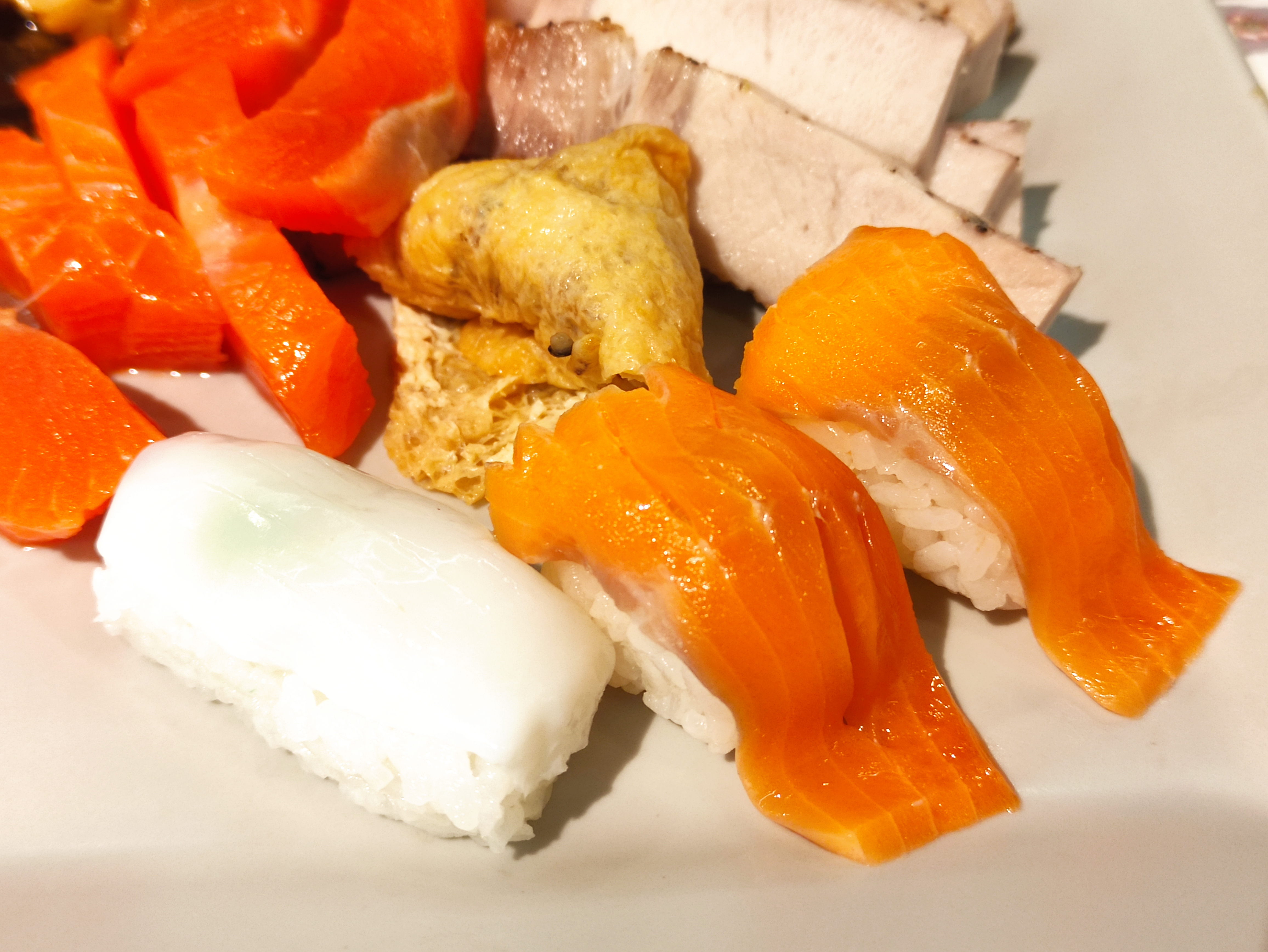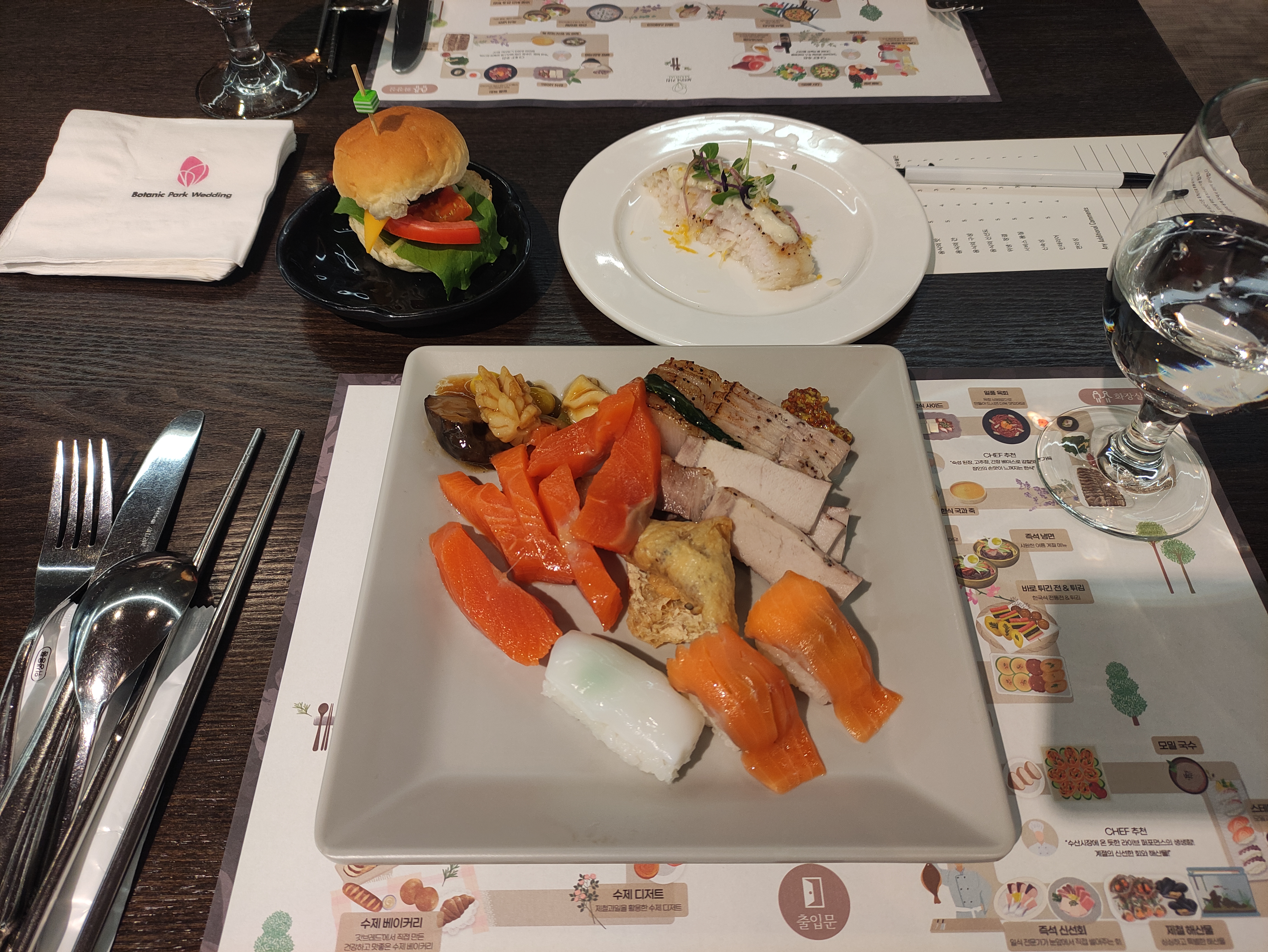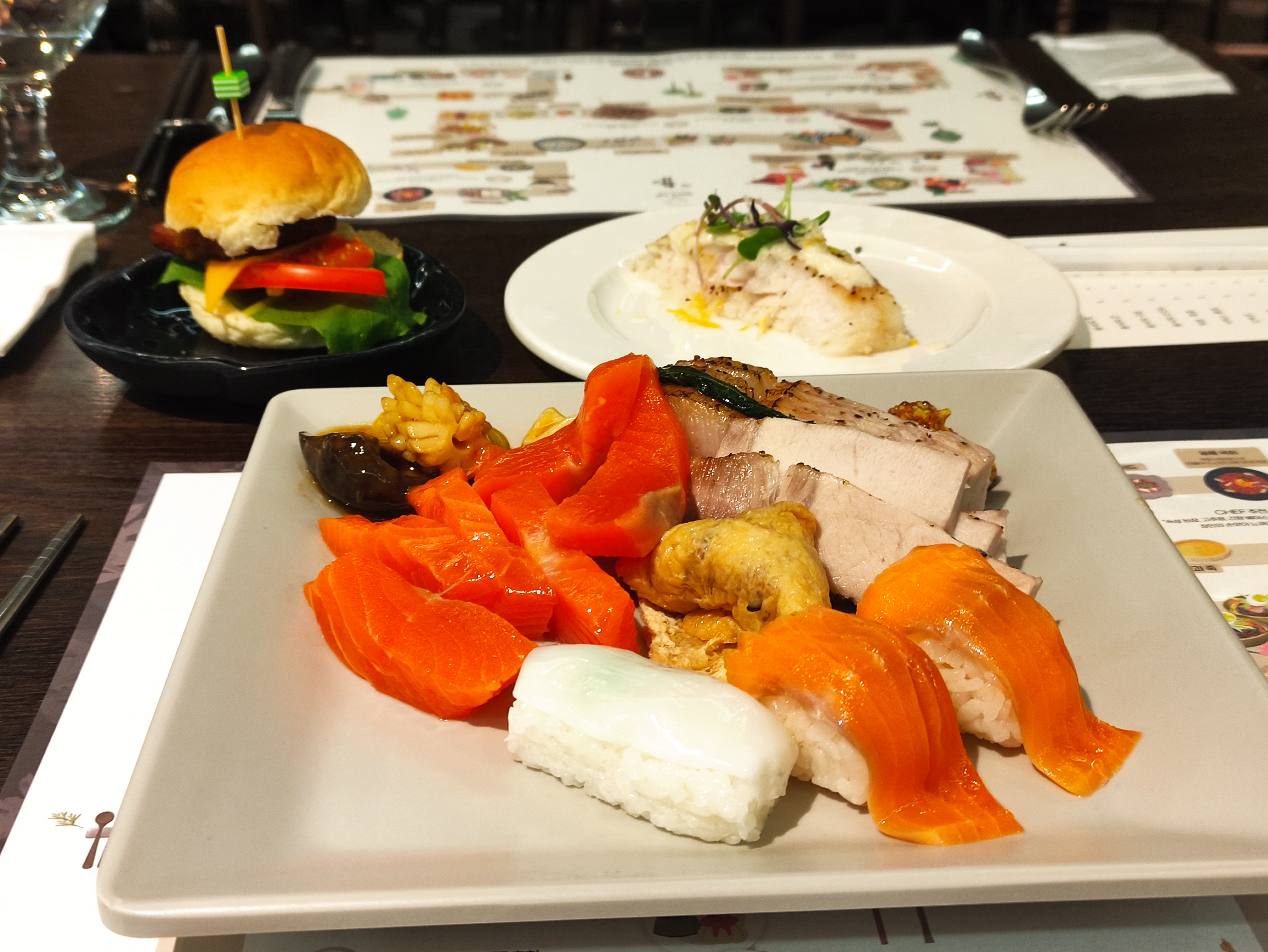 메뉴를 가져와봤습니다. 앞접시가 사각형인 점도 인상적이네요. 그리고 수제버거도 있어서 가져왔고, 생선스테이크? 생선 요리도 있어서 가져와봤습니다. 그리고 제가 가져온 접시에는 돈마호크, 그리고 연어회, 한치초밥, 연어초밥, 유부초밥 등 초밥류와 양장피? 중식메뉴를 하나 가져왔습니다. 처음에는 라이트하게 시작합니다. ㅎㅎ 여기에서 샐러드도 한접시 가져왔고요. 이후에는 튀김류 구이류 등으로 먹습니다. 이래야 많이(?) 먹을 수 있고 먹고나서도 속이 편하더라고요.