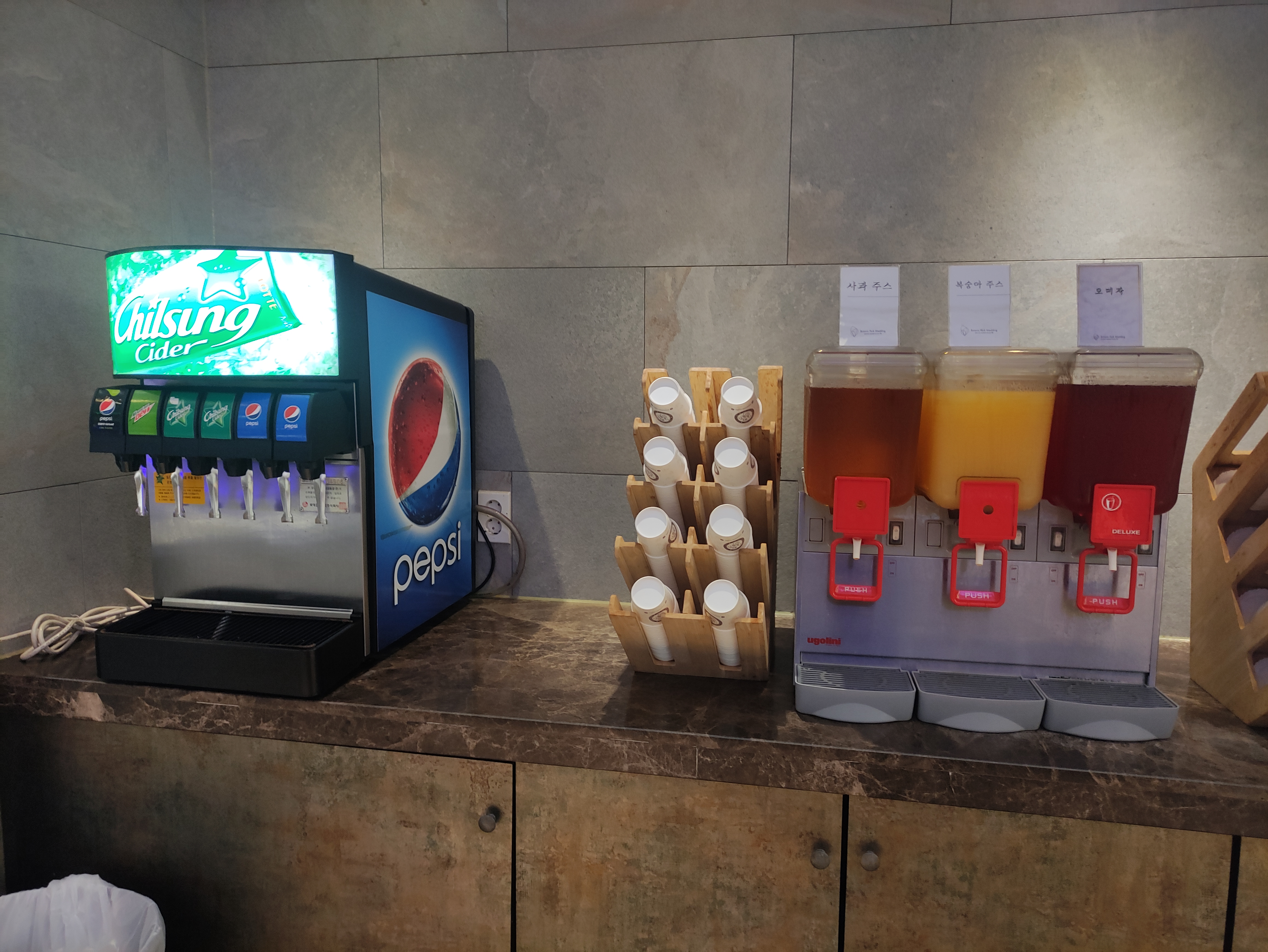 음료코너입니다. 펩시 사이다 펩시제로, 그리고 사과주스, 복숭아주스, 오미자차 등을 즐길 수 있습니다. 여기 외에도 따로 생과일주스 코너도 있고요. 아이스크림 먹는 곳도 있습니다. 메뉴가 정말 다양합니다.