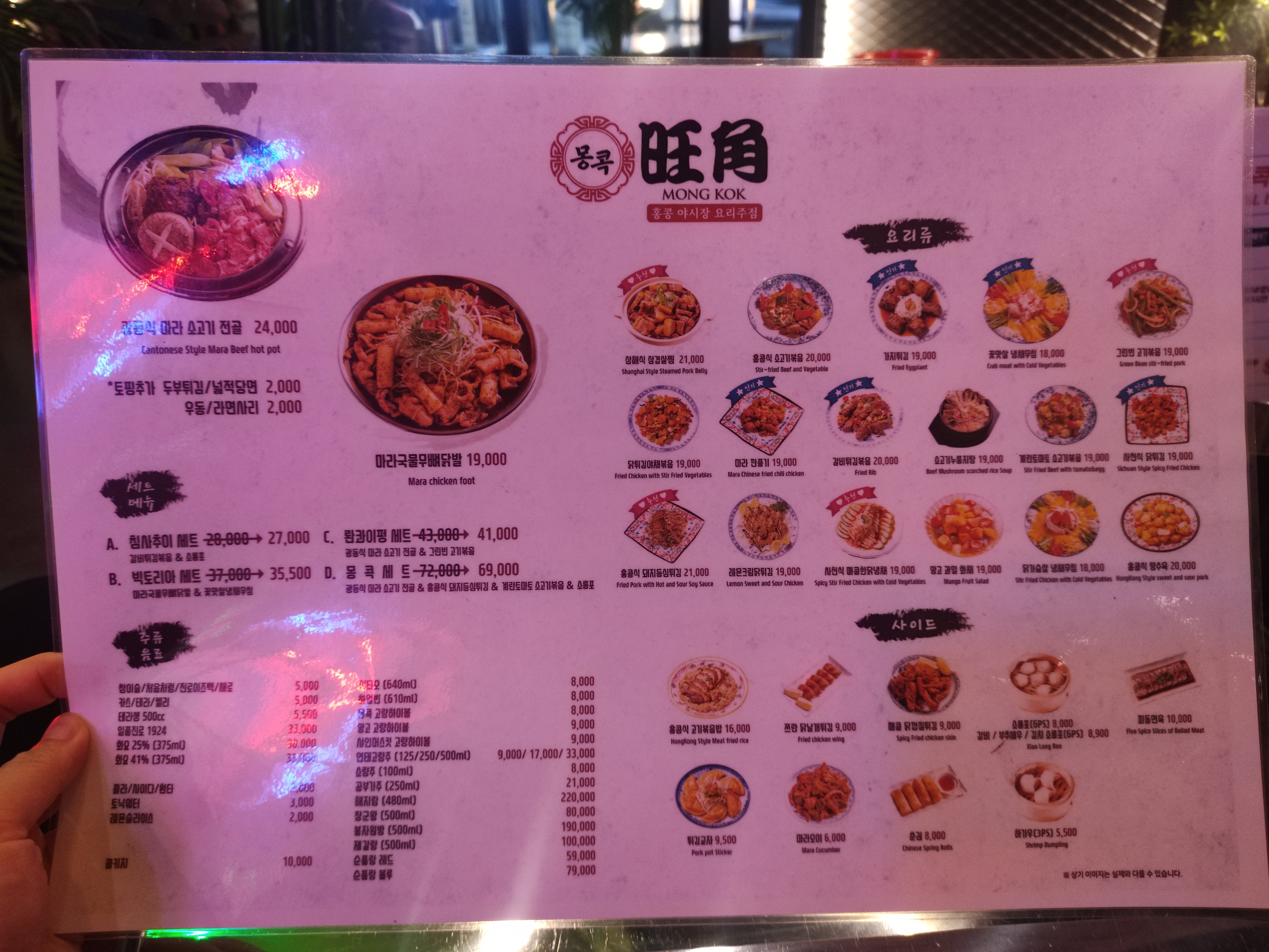 메뉴판입니다. 한페이지로 가독성있게 깔끔하게 만들었습니다. 종이에 코팅해서 오염도 방지했고요. 다양한 홍콩야시장 음식들을 즐길 수 있습니다. 메뉴가 정말 다양하죠. 저는 추천메뉴인 홍콩식 돼지등심튀김과 상해식 삼겹살찜을 주문했습니다. 그리고 음료로 손석구배우가 모델로 출연하는 켈리 맥주, 그리고 사이다를 주문했습니다.