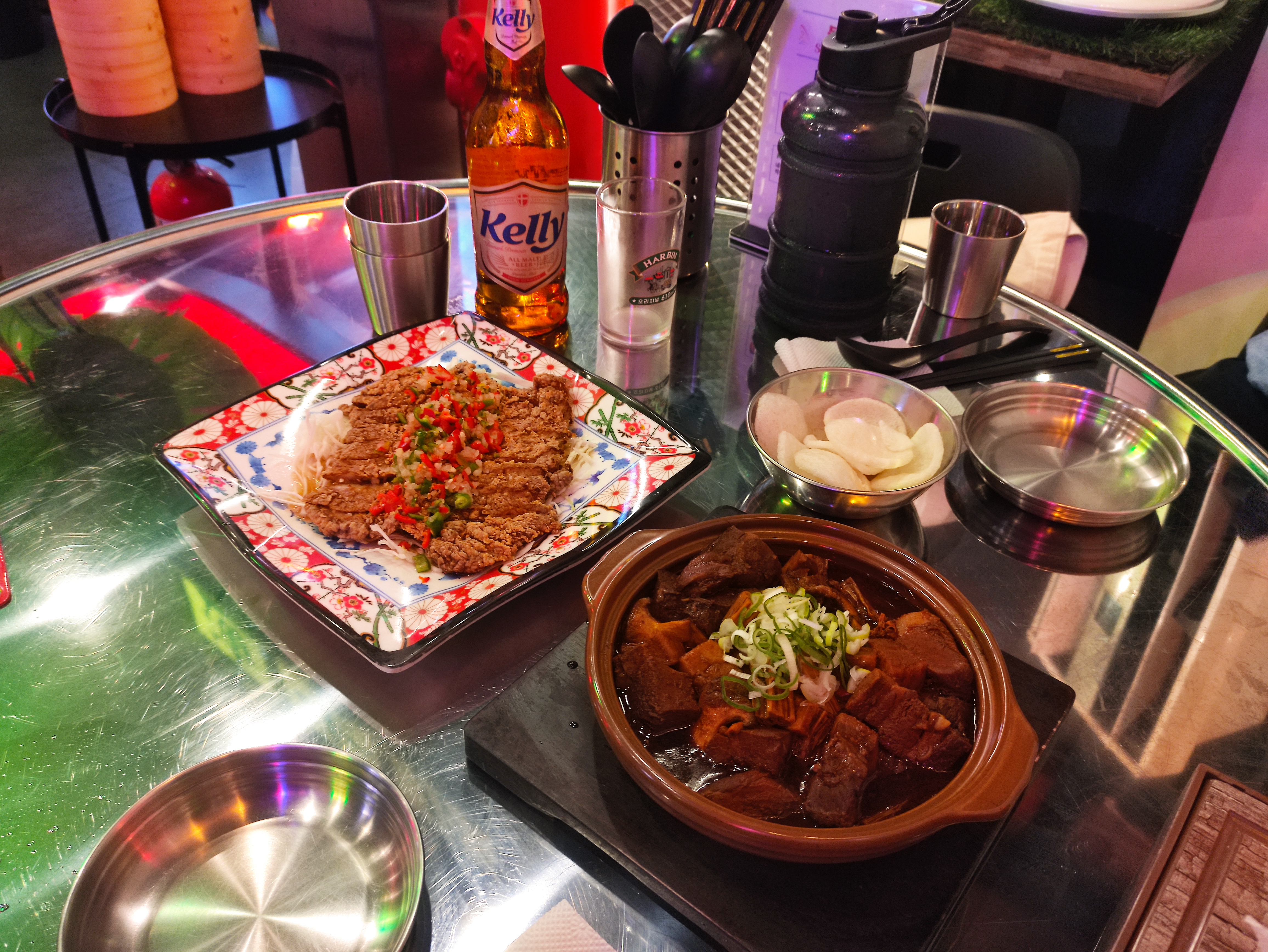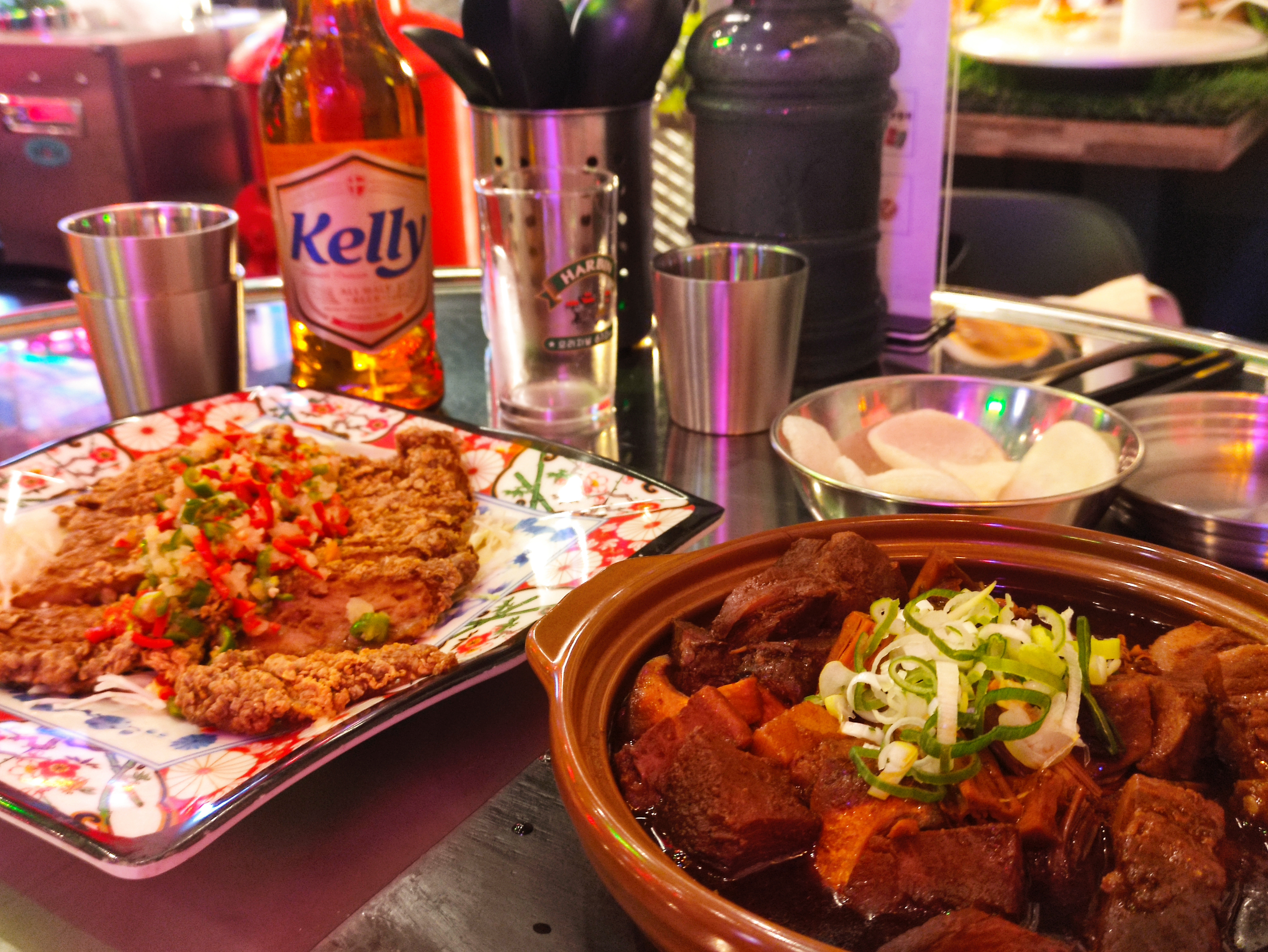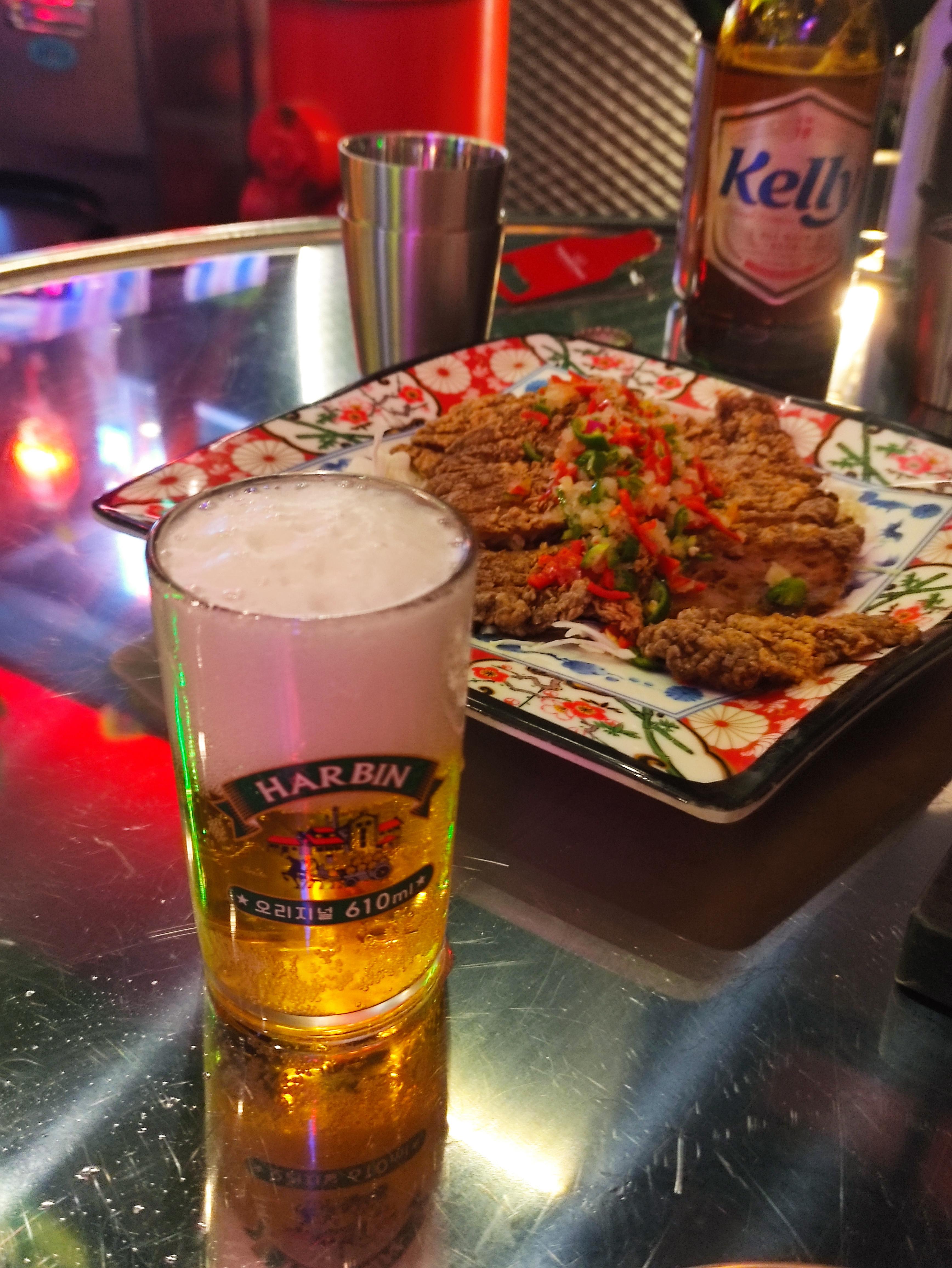 홍콩식 돼지등심튀김, 그리고 상해식 삼겹살찜 넘 맛있었어요. 돼지등심튀김은 약간 새콤한 소스가 등심튀김과 잘 어울리고, 삼겹살찜은 갈비찜 같은 느낌이고 공기밥한그릇 먹고싶어지더라고요. 두 요리 다 맥주와 찰떡궁합이었어요. 다양한 메뉴가 있어서 합정역에서 맥주 한잔 하고 싶을때 종종 오면 좋을것 같아요. 홍콩야시장 음식을 서울에서 즐길 수 있다니 참 좋습니다.