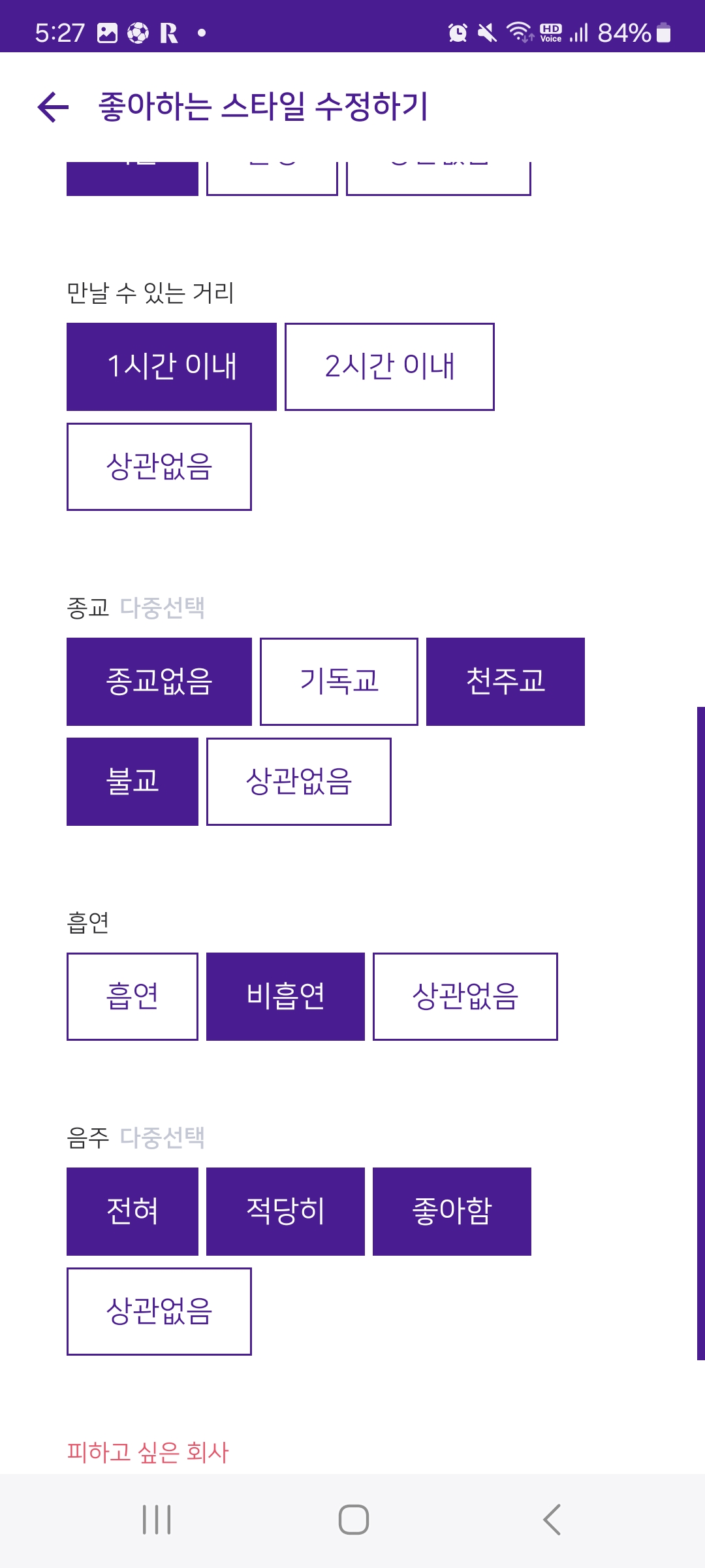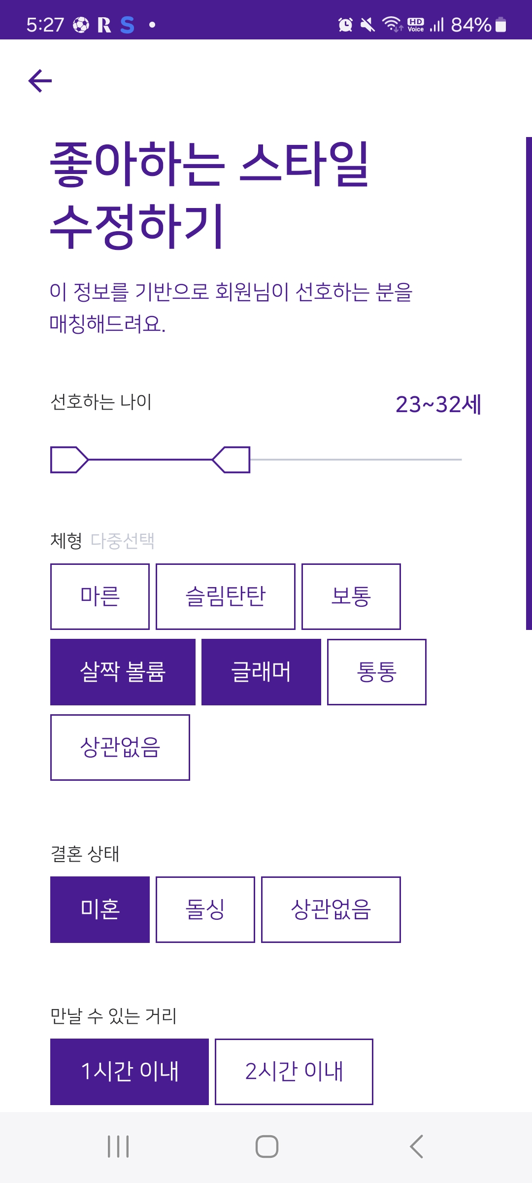 위 사진처럼 좋아하는 이성의 나이대, 체형, 결혼상태, 만날 수 있는 거리, 종교, 흡연 여부, 음주를 선택할 수 있습니다.