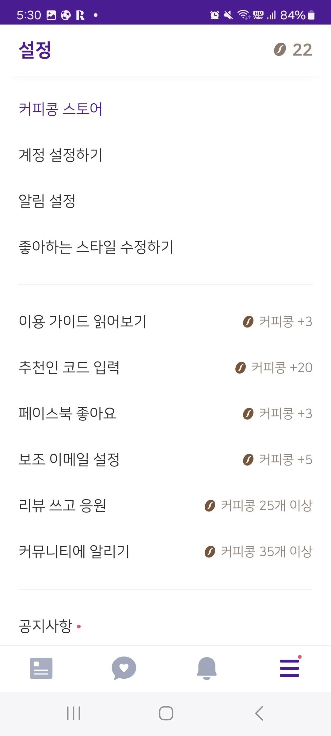 어플 화면입니다. 우측상단에 22라는 숫자가 커피콩의 개수입니다.