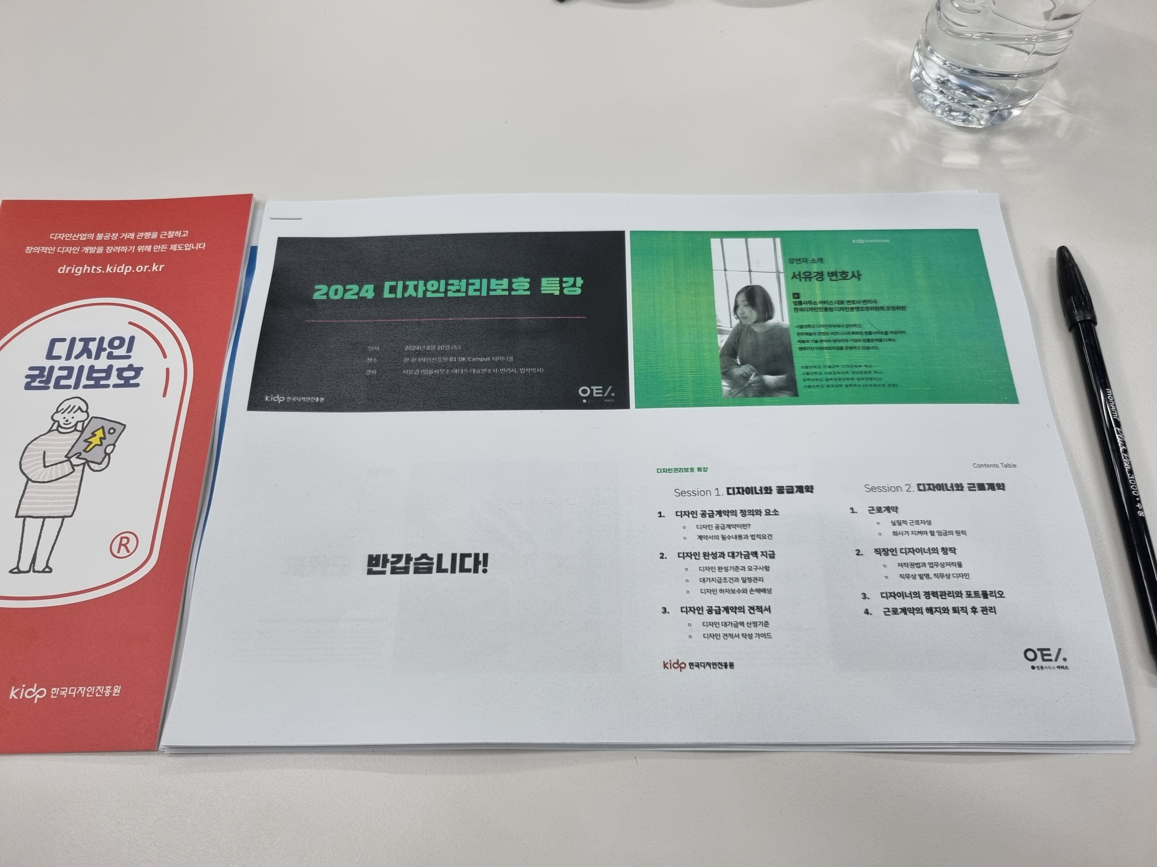 ppt자료를 나눠주셨습니다. 현직변호사분께서 디자인계약관련 생각해야할점과 회사 취직, 그리고 저작권, 디자인보호법등 대략 개괄적인 내용을 2시간에 함축하여 설명해주셨습니다. 일반수업이라면 6주과정에 다룰내용을 2시간으로 요약해 설명해주셨다고 합니다. 간단한 질의응답을 받고 끝냈는데 2시간이 빠르게 지나간듯 느껴지는 좋은 특강이었습니다. 내용도 좋고 현직변호사분께서 직접특강하셔서 좋았습니다.