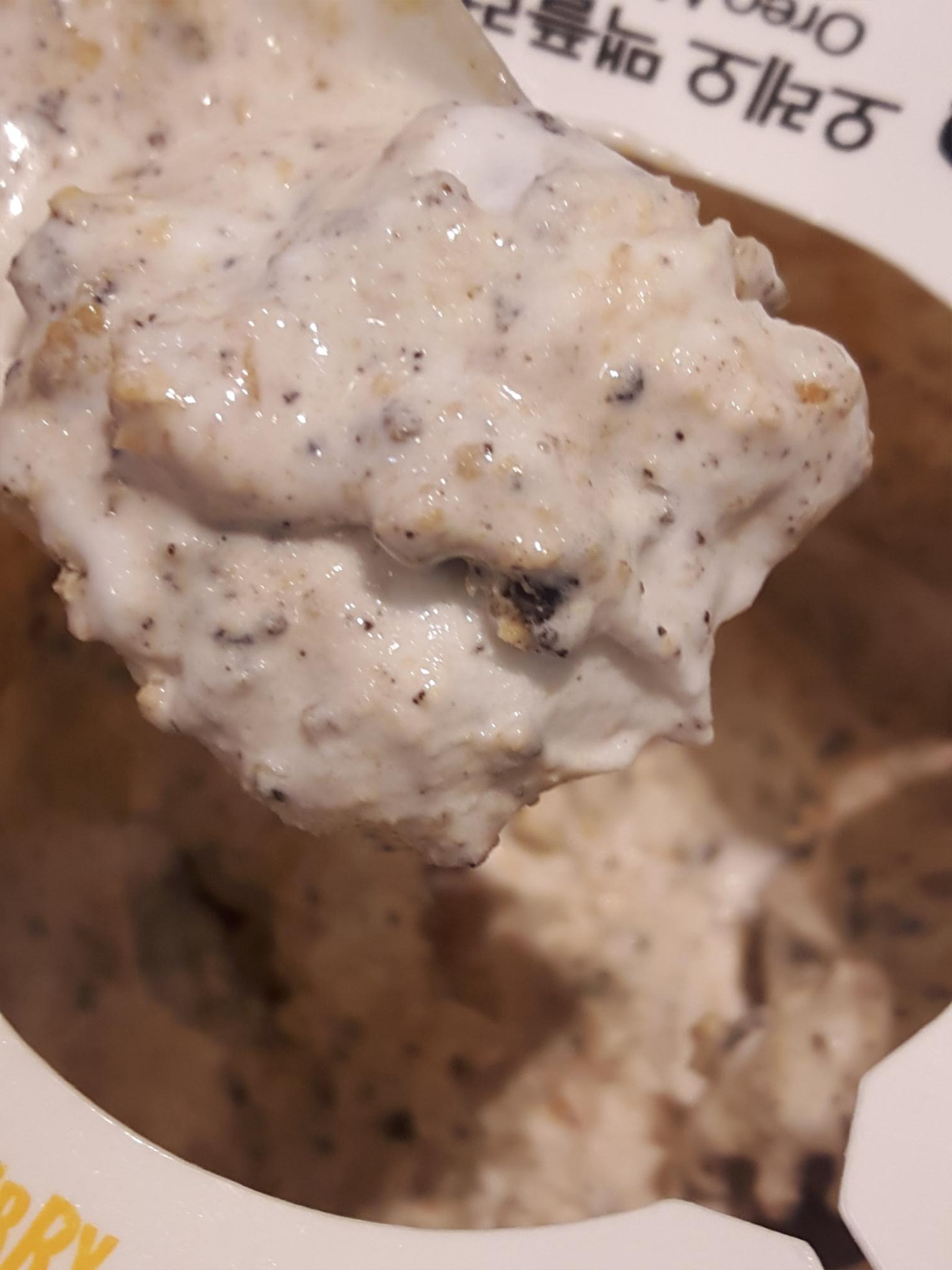 솔티카라멜과 오레오쿠키가 잘 섞였네요. 쿠키건더기와 아이스크림이 거의 1대1비율에가까울정도로 쿠키가 적진않아요. 씹는맛이 있어요.