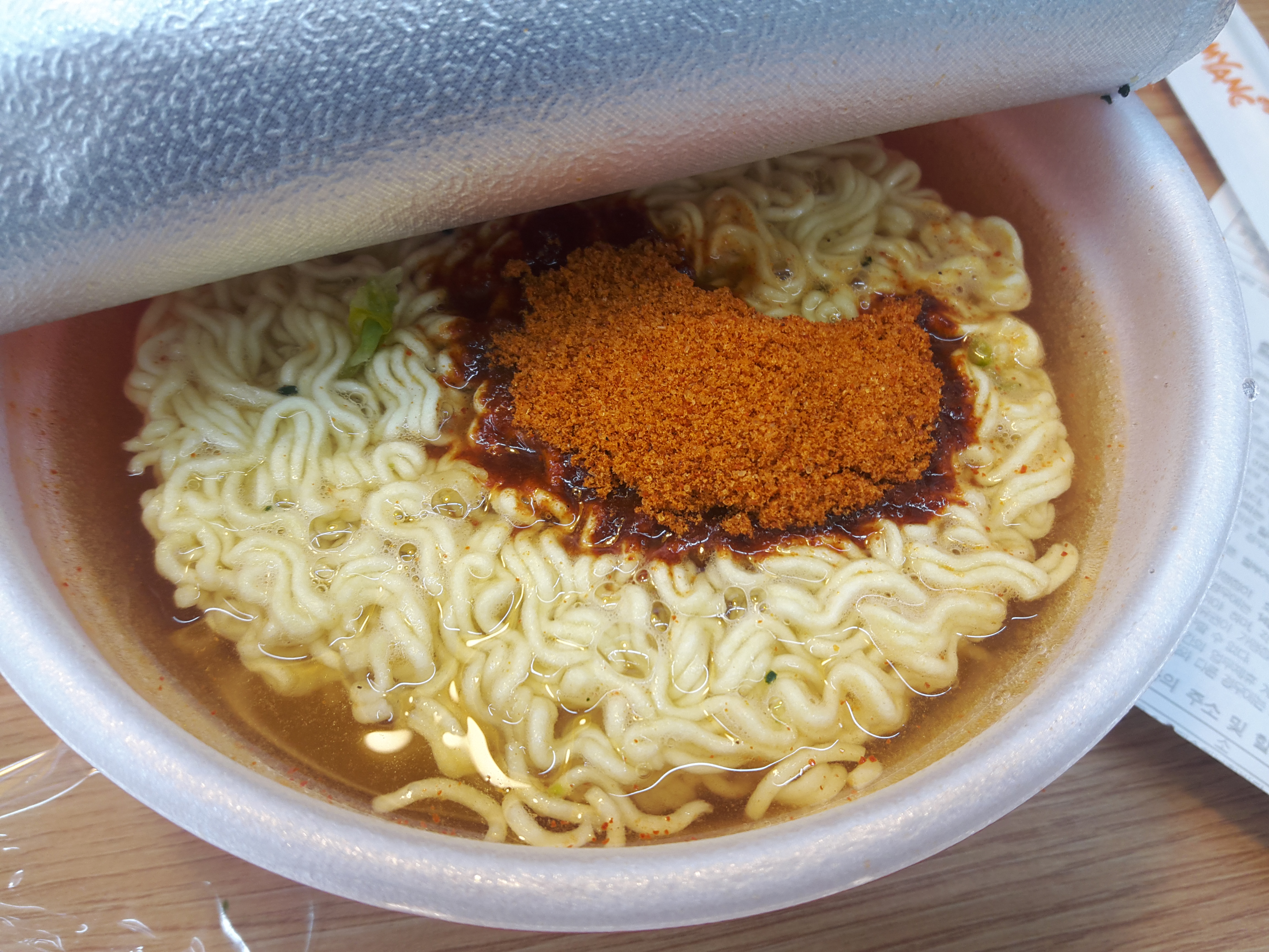 입구를 열어 분말스프를 넣고 이마트24에 있는 온수기물을 받은 뒤 3분간 기다리면 라면이 완성됩니다. 컵라면 참 누가 만들었는지 잘 만들었어요. 3분만에 한끼먹을 맛있는 라면을 먹을 수 있다니 참 고맙게 느껴집니다.