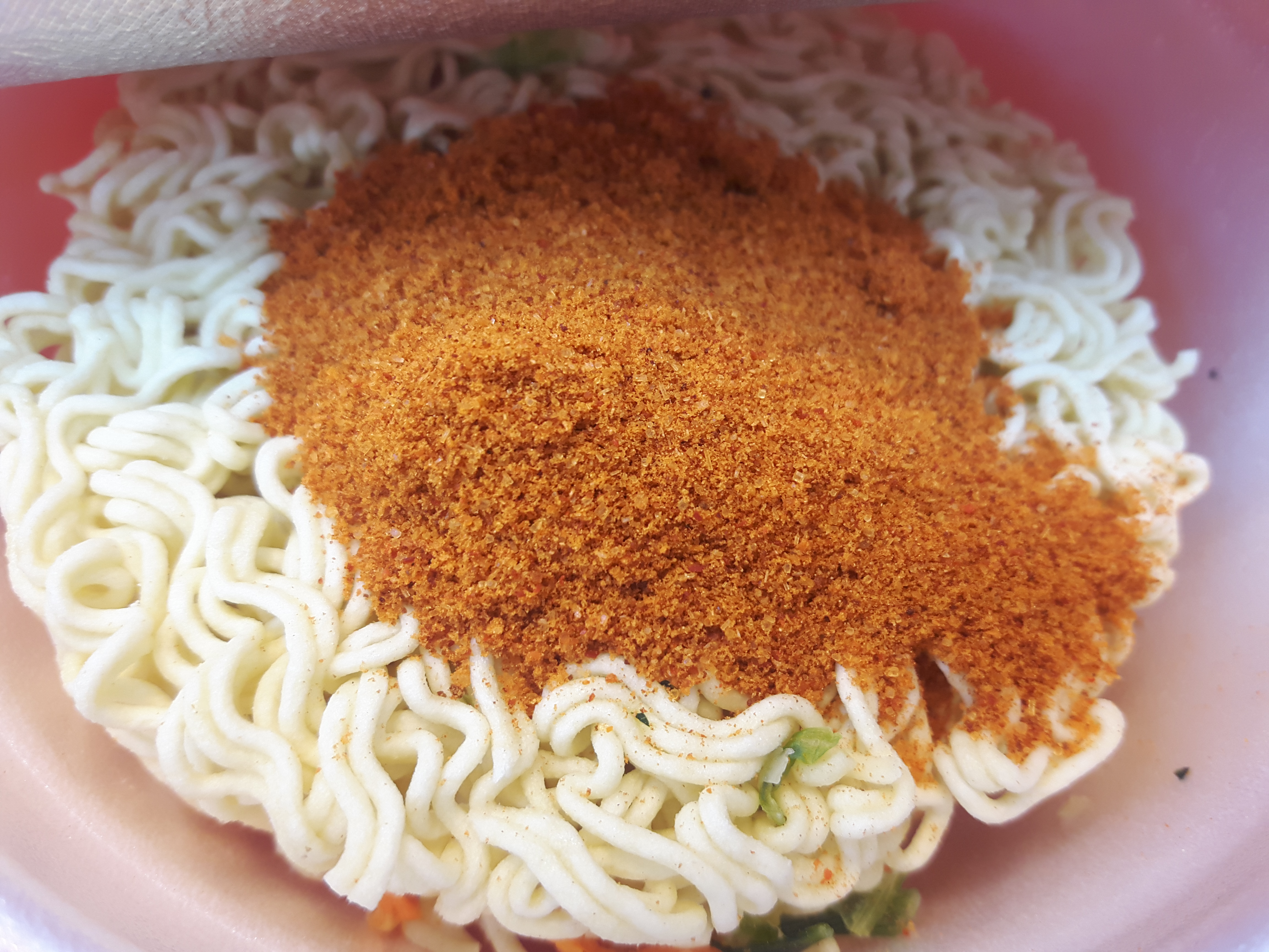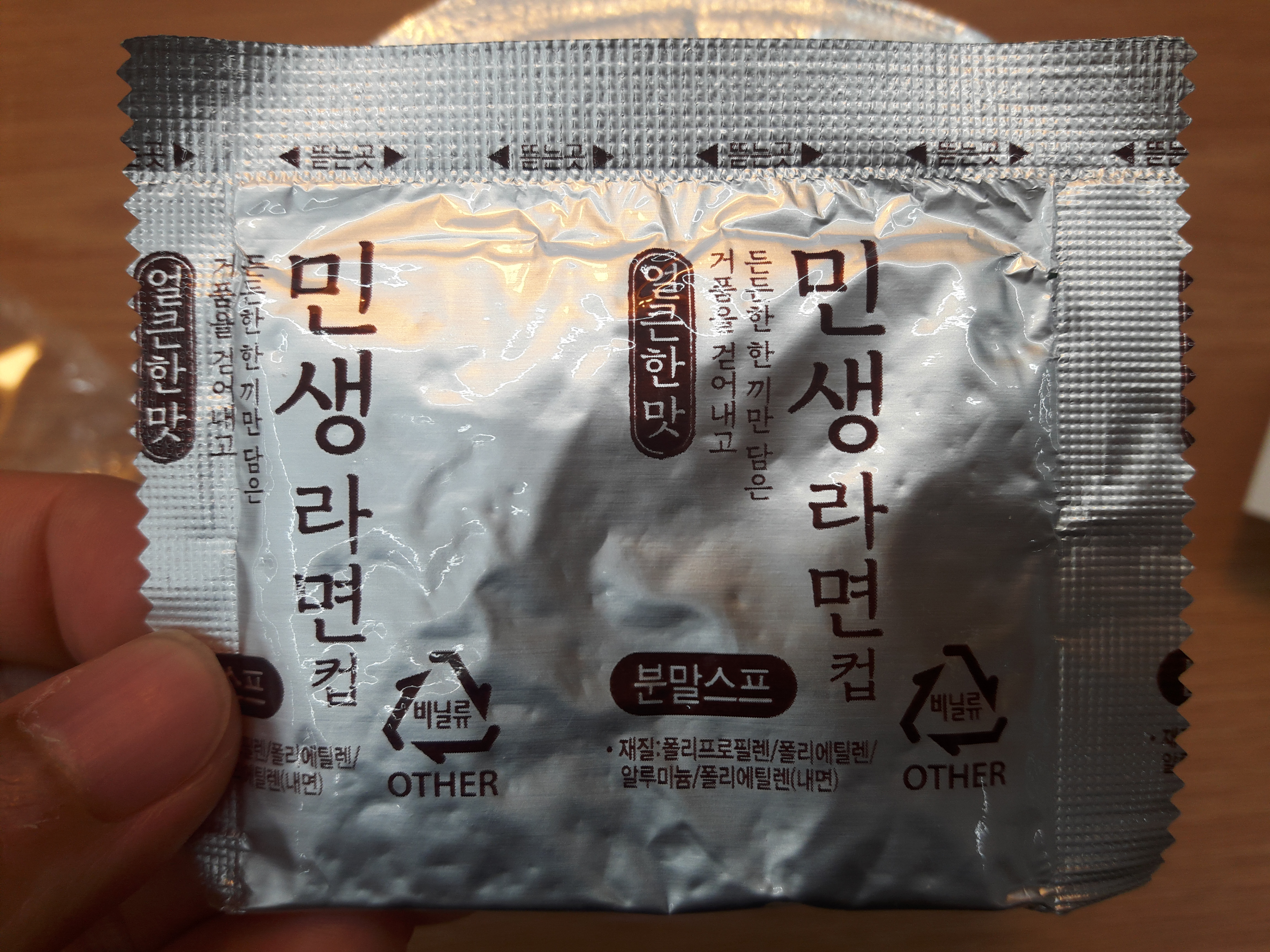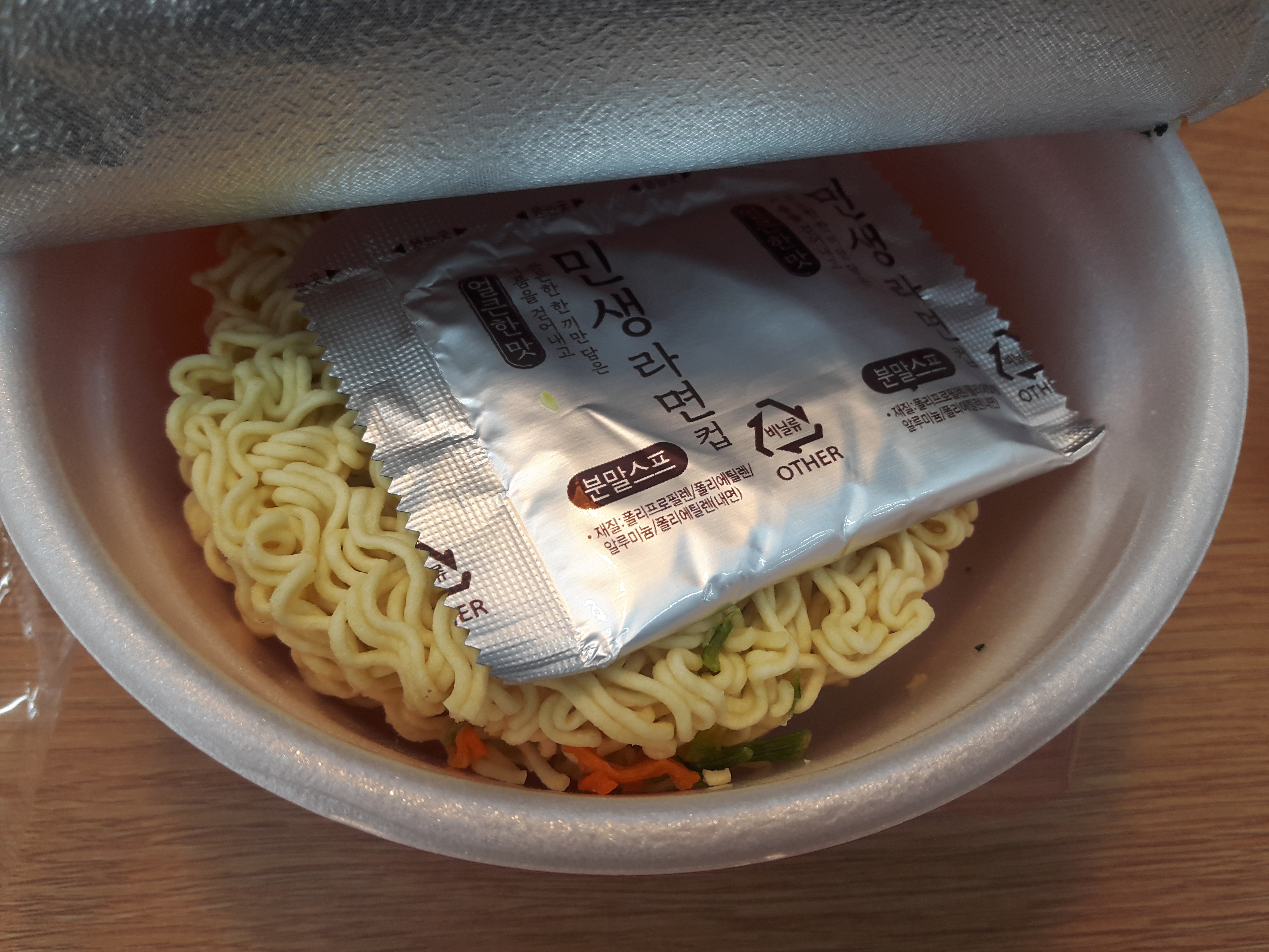 보시면 아시겠지만, 민생라면답게 건더기는 그리 많지 않습니다. 사실 우리나라 라면이 보통 건더기가 거기서 거기이기때문에, 저는 개인적으로 건더기에 큰 비중을 두지 않습니다. 굳이 건더기를 먹고싶다면 차라리 따로 파를 썰어넣거나 해야지, 라면 건더기스프로는 양이 안차더라고요. 차라리 없이 가격을 낮추는게 훨 낫네요.