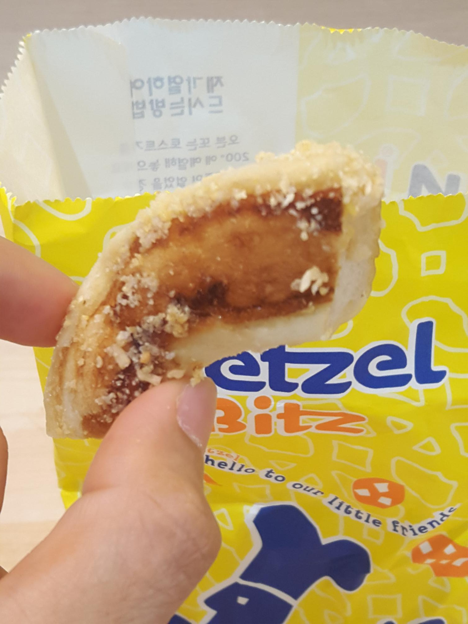 요렇게 갈은아몬드가 프레즐에 솔솔 뿌려져 있어요. 프레즐 맛은 처음먹어본 관점에서 봤을때 예전에 먹어본 꽈배기와 비슷한 느낌이었어요. 식감은 꽈배기보다 더 밀도가 높고 기름기도 더 적어요. 씹는맛도 프레즐이 더 좋았어요. 고급스러운 큼지막한 꽈배기에 설탕 대신 아몬드를 뿌린 느낌이더라고요. 아몬드가 오독오독씹혀서 맛있게 먹었어요.