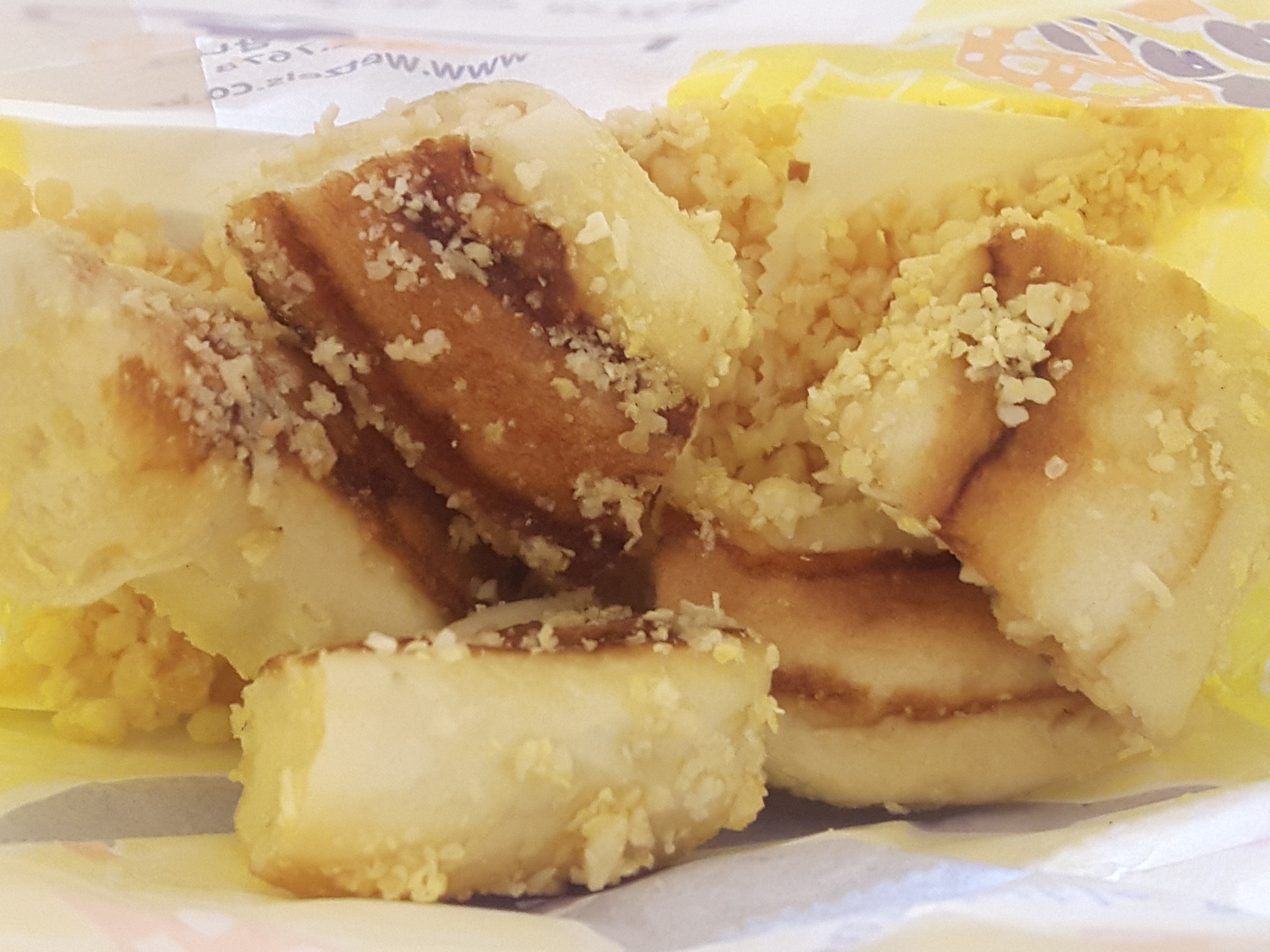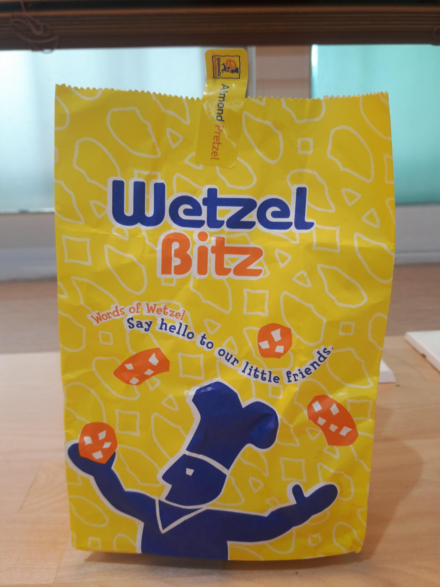 웻즐 빗츠(Wetzel Bitz)란 웻즐스프레즐의 메뉴중 하나 인거 같아요. 프레즐을 먹기좋은 한입크기로 잘라서 포장되어 있더라고요. 포장지는 노랑노랑한 배경에 파랑색으로 된 요리사가 프레즐을 만드는 모양입니다. 사실 프레즐은 이날 처음 먹어봤어요.