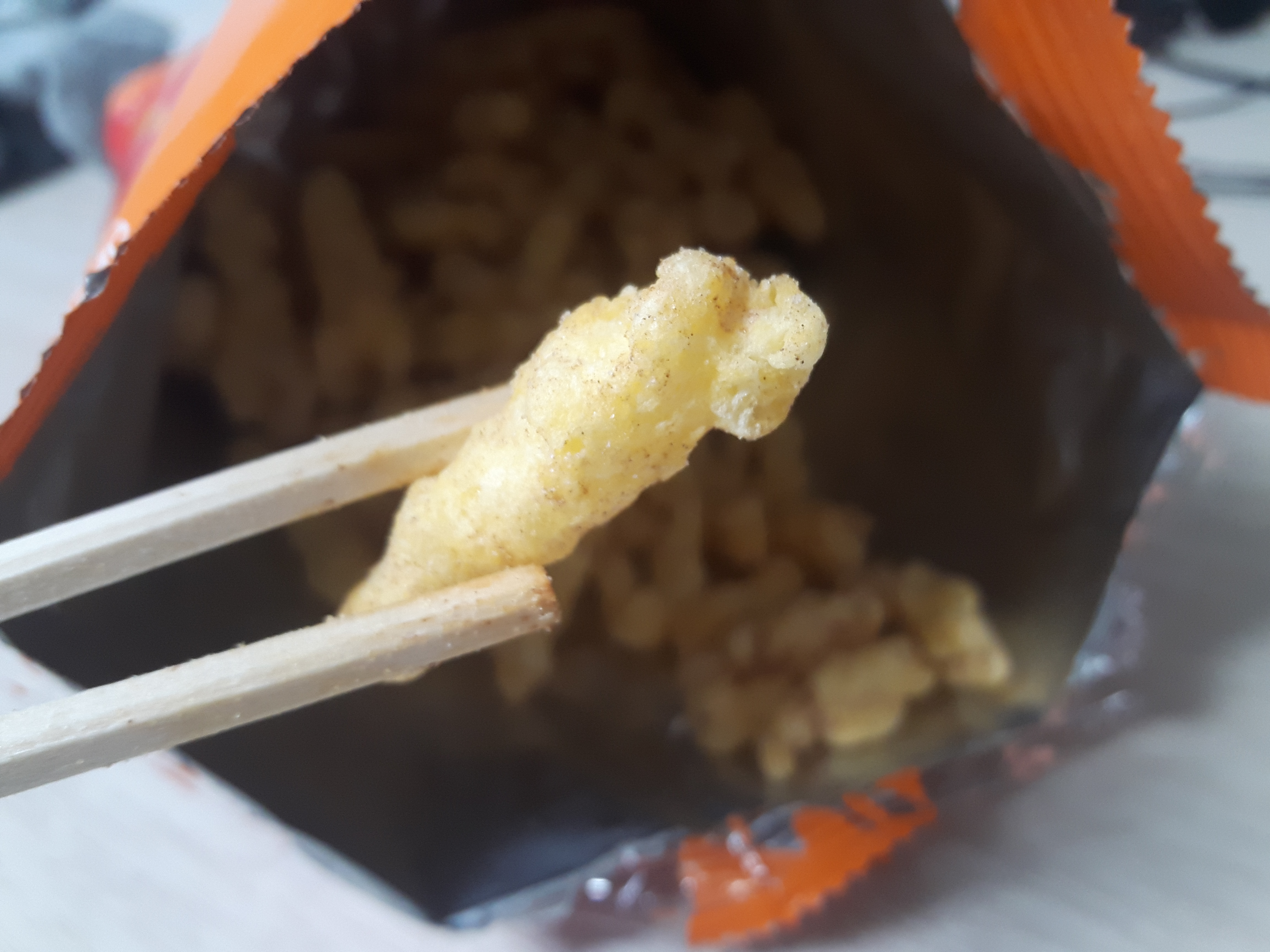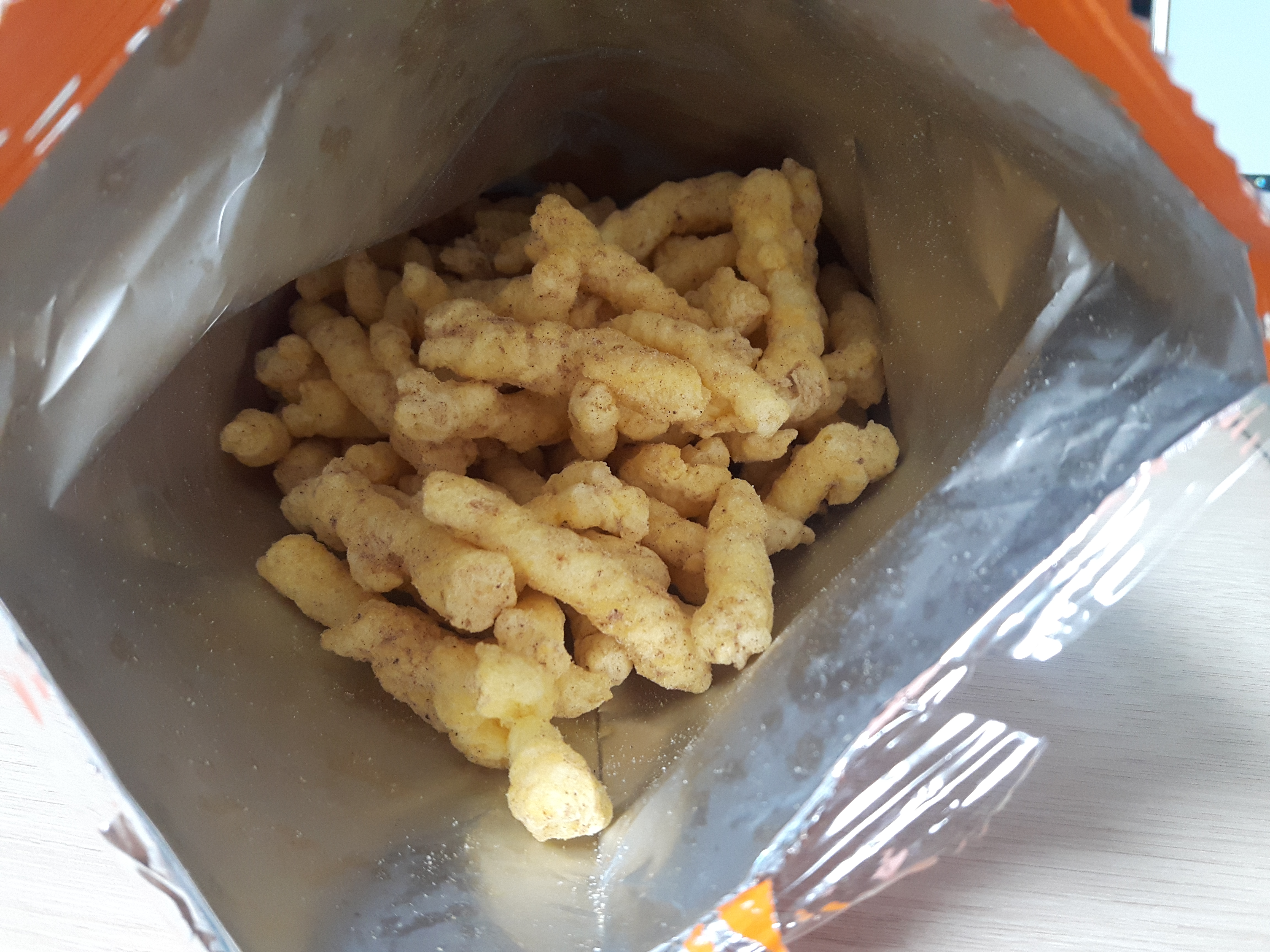 과자봉지를 열어보면 안에는 이런모습입니다. 요즘과자처럼 모양내거나 하지않아요. 옛날 치토스생각나네요. 옥수수로만든 과자에 시즈닝이 뿌려져 있는것을 볼 수 있습니다.