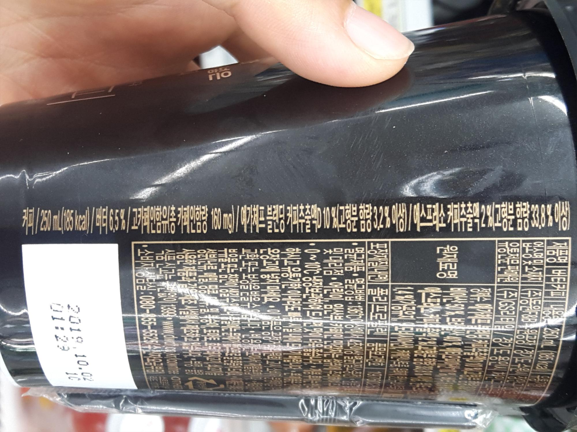 제품의 측면입니다. 버터가 6.5%들어가고 카페인은 160mg들어가요. 예가체프 블랜딩 커피추출액D가 10%(고형분 함량 3.2% 이상), 에스프레소 커피추출액이 2%(고형분 함량 33.8% 이상) 들어갑니다.