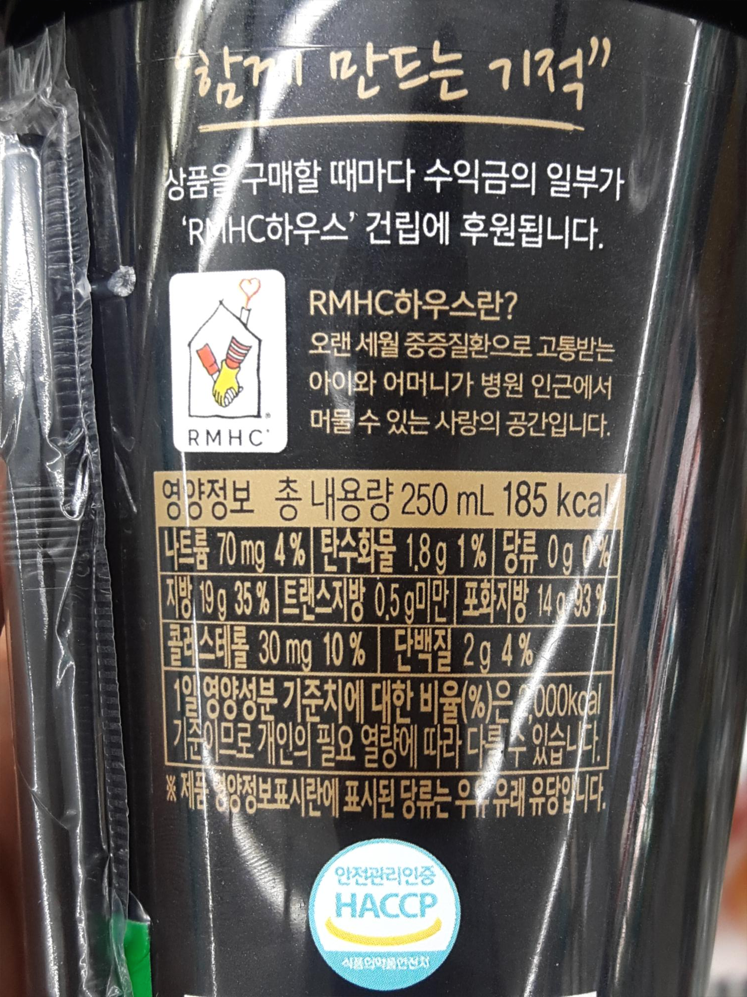 총 내용량은 250ml이고 칼로리는 185kcal 입니다. 영양정보는 나트륨 70mg, 탄수화물 1.8g, 지방 19g, 트랜스지방 0.5g미만, 포화지방 14g, 콜레스테롤 30mg, 단백질 2g 입니다. 식품의약품안전처에서 안전관리인증 HACCP를 당연히 받았고요. ㅎㅎ