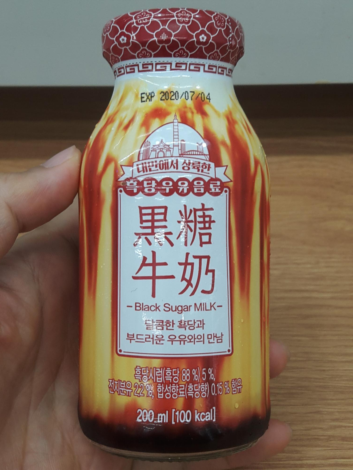 패키지디자인은 흑당커피와 비슷한데요. 색상이 흑당커피는 검은색과 갈색의 조합이었다면, 흑당우유음료는 채도를 떨어뜨린 빨간색을 메인컬러로 디자인되었습니다. 병에 있는 흑당무늬도 약간 다르네요. 병 모양 자체가 흑당위에 라떼를 부은 모양입니다. 마치 아래에 흑당이 깔려있는것처럼 검게 되어있네요.