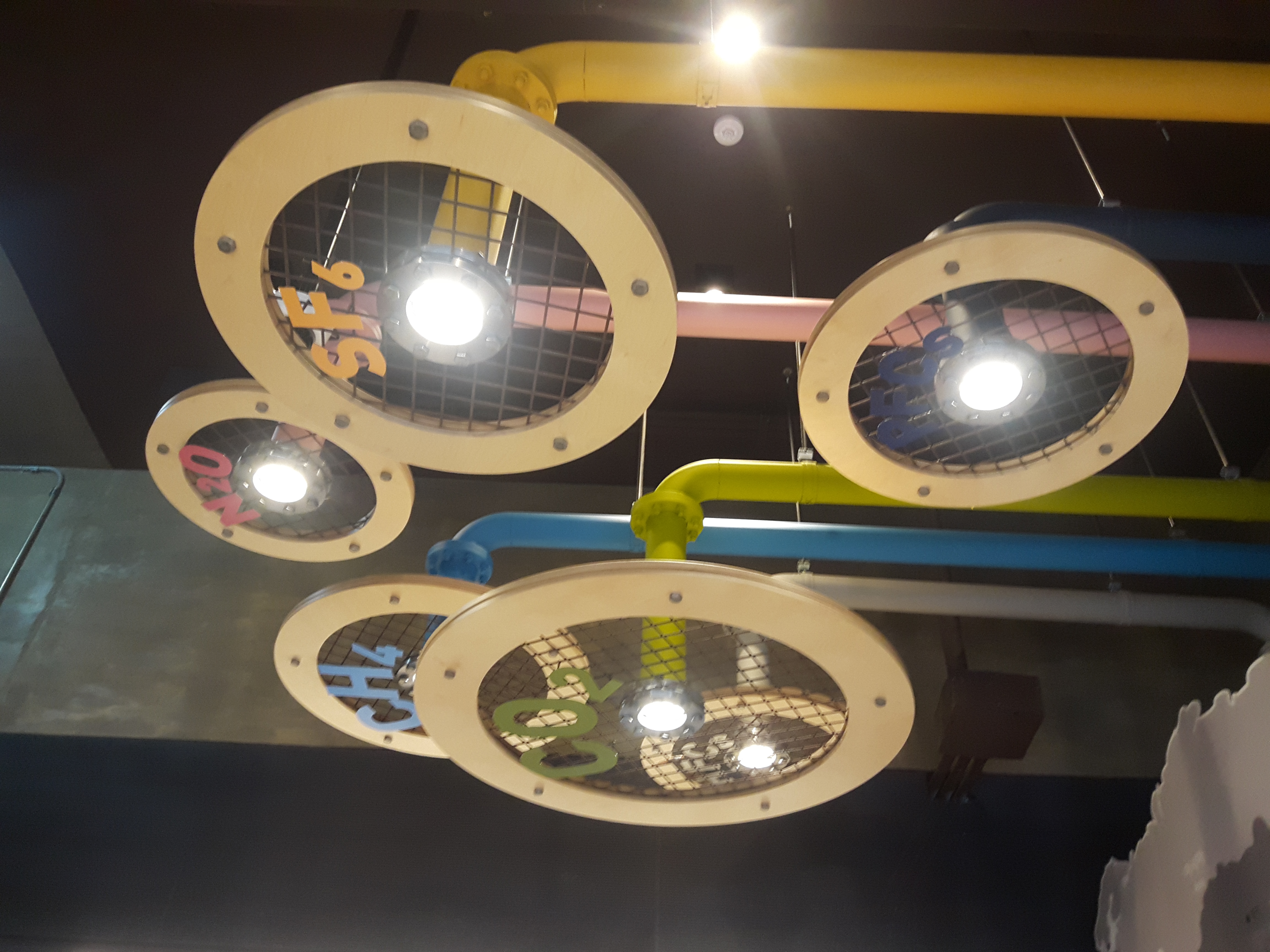 천장에 조명이 신기해서 사진한장 찍어보았어요. 배관등 건축자재를 활용해 만든 조명이네요. 각 조명마다 적혀 있는 영어 CO2나 CH4는 환경유해물질성분의 화학기호입니다.