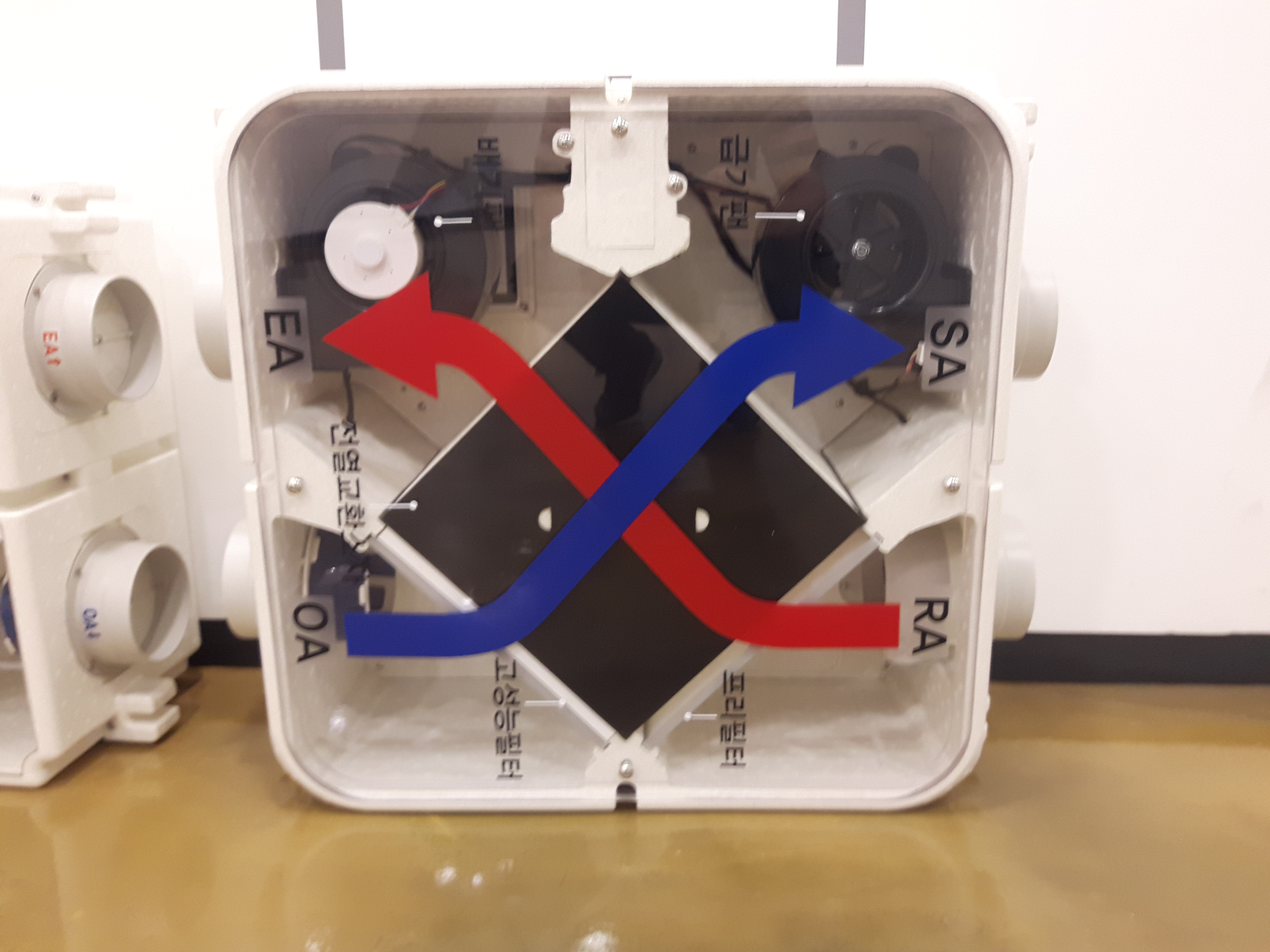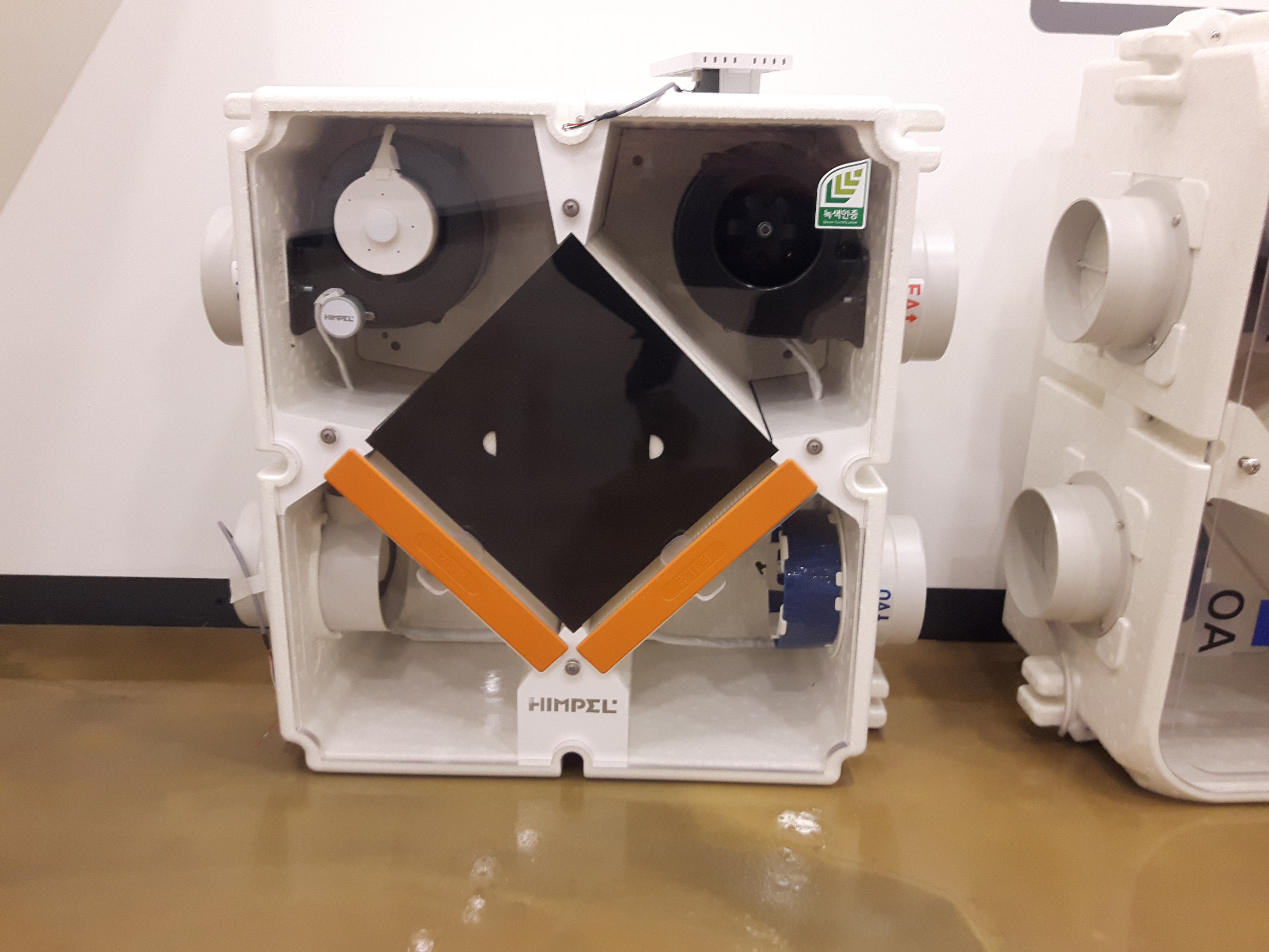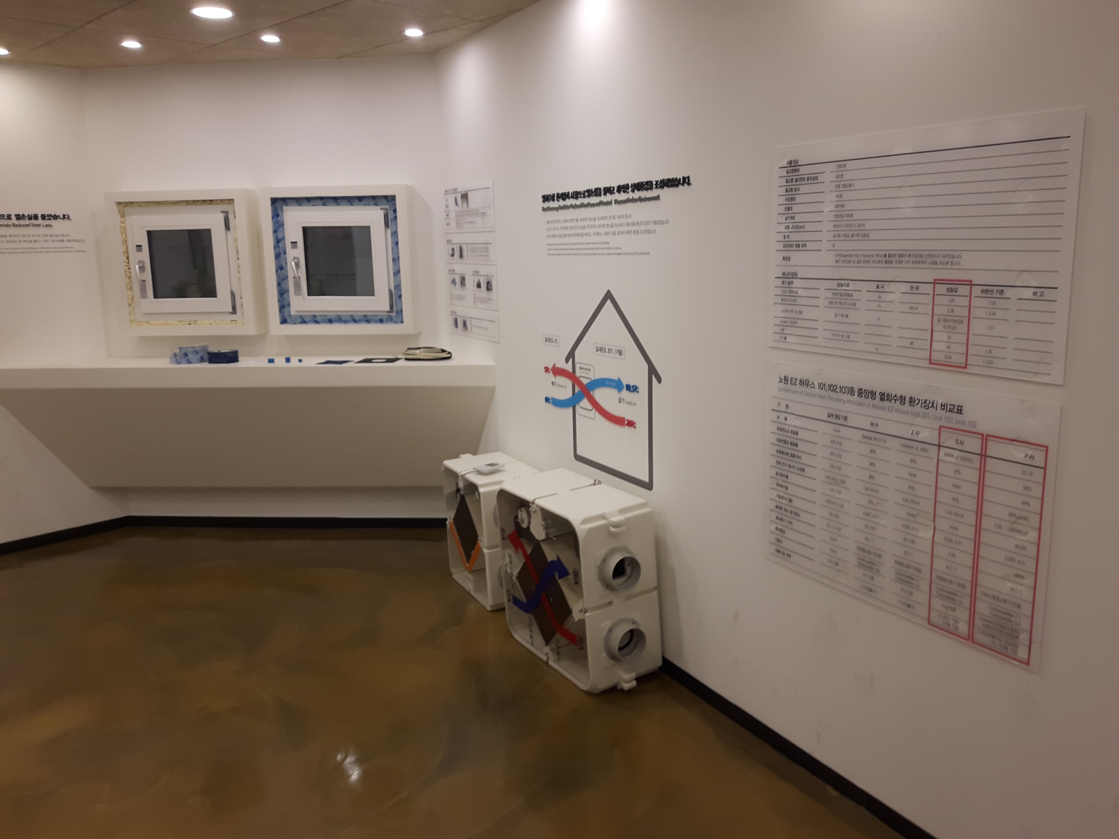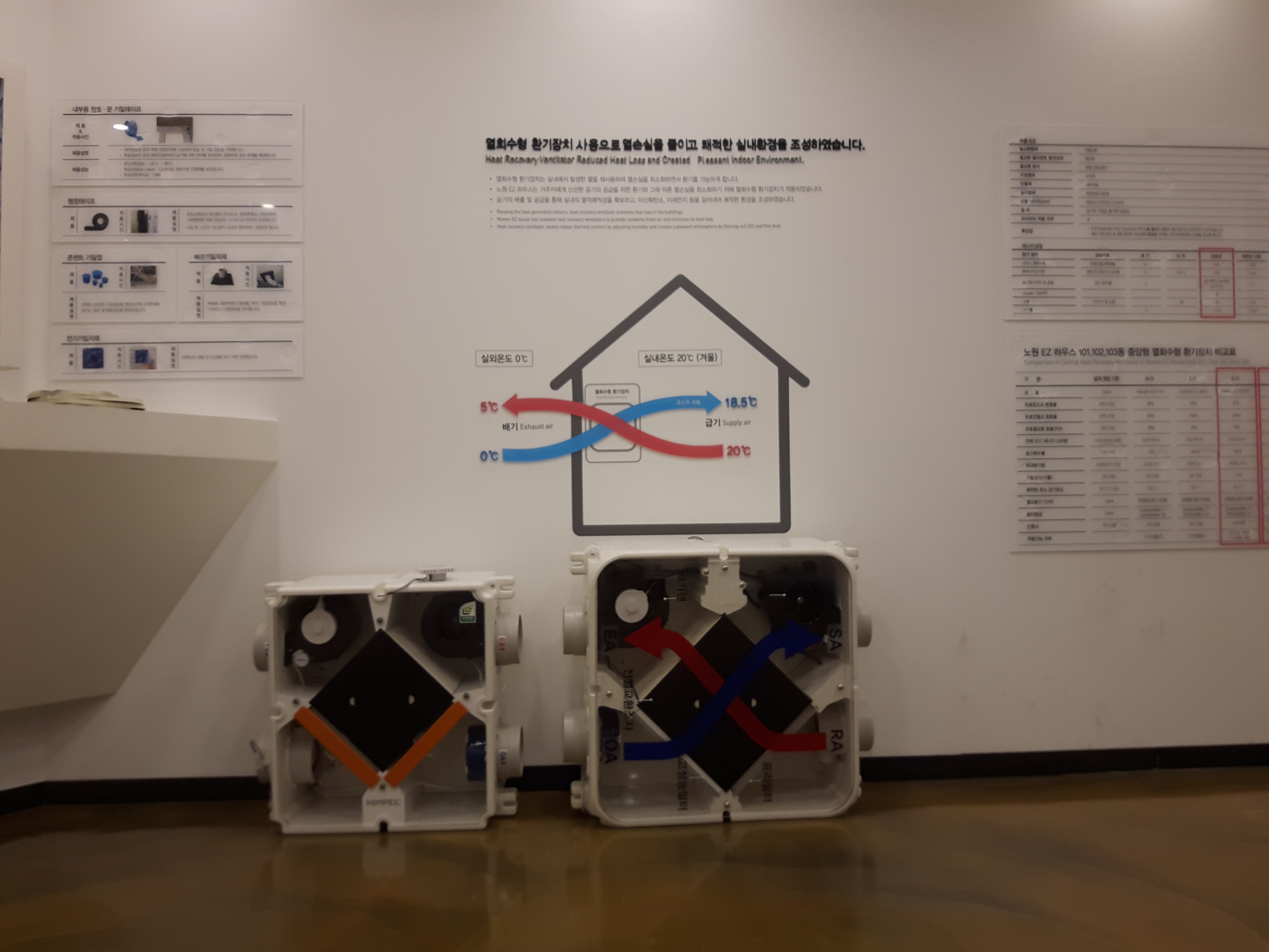 열손실을 줄이기 위한 블라인드도 있었고, 사진 오른쪽에 보이는 독특한 기계는 전열교환기라는 환기장치에요. 안쪽의 공기를 바깥으로 보내고, 바깥공기를 안으로 보내는 급기구, 배기구가 있는데, 안의 공기가 바깥공기와 교차하면서, 바깥공기가 실내온도와 비슷해지는 효과를 가진다고 해요. 저 장치를 통해 바깥공기가 실내온도와 60%정도 같아진다고 해요.